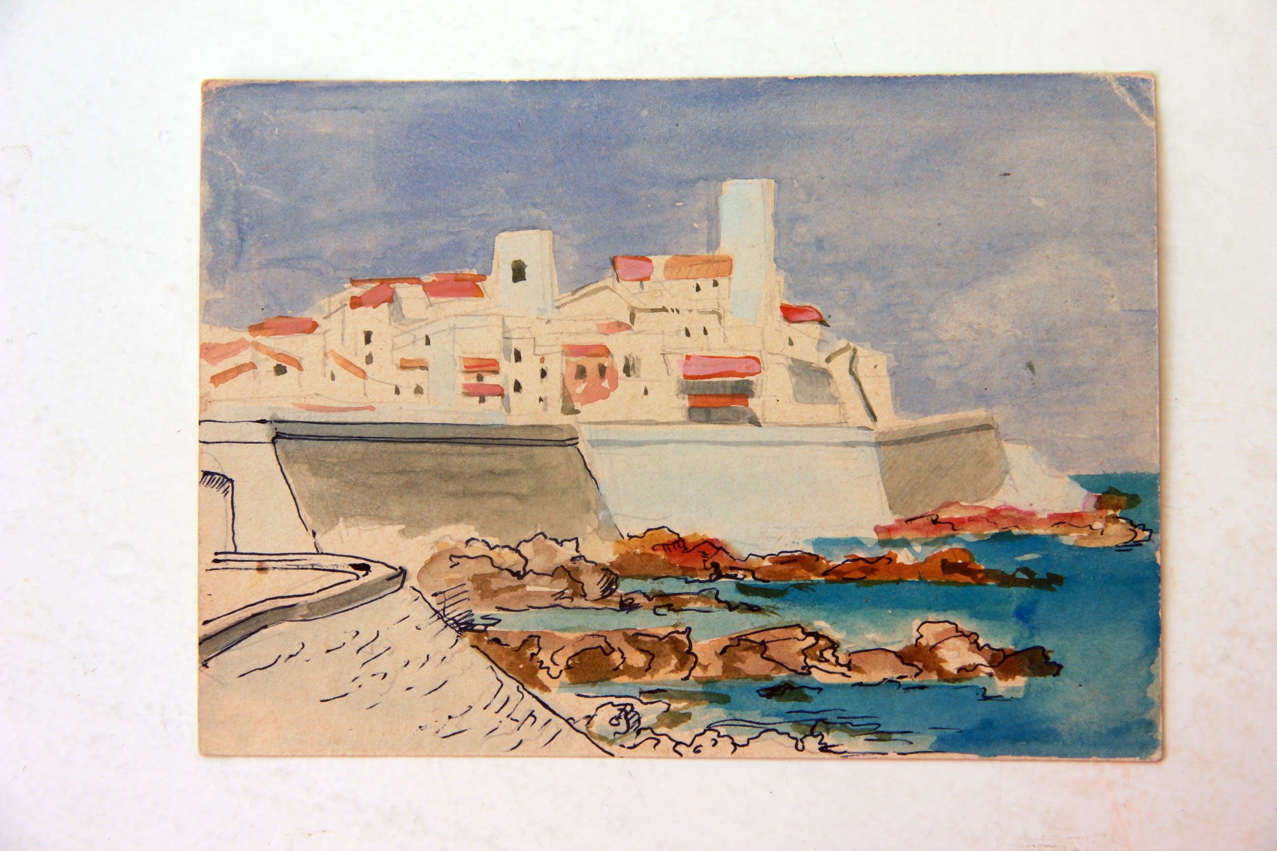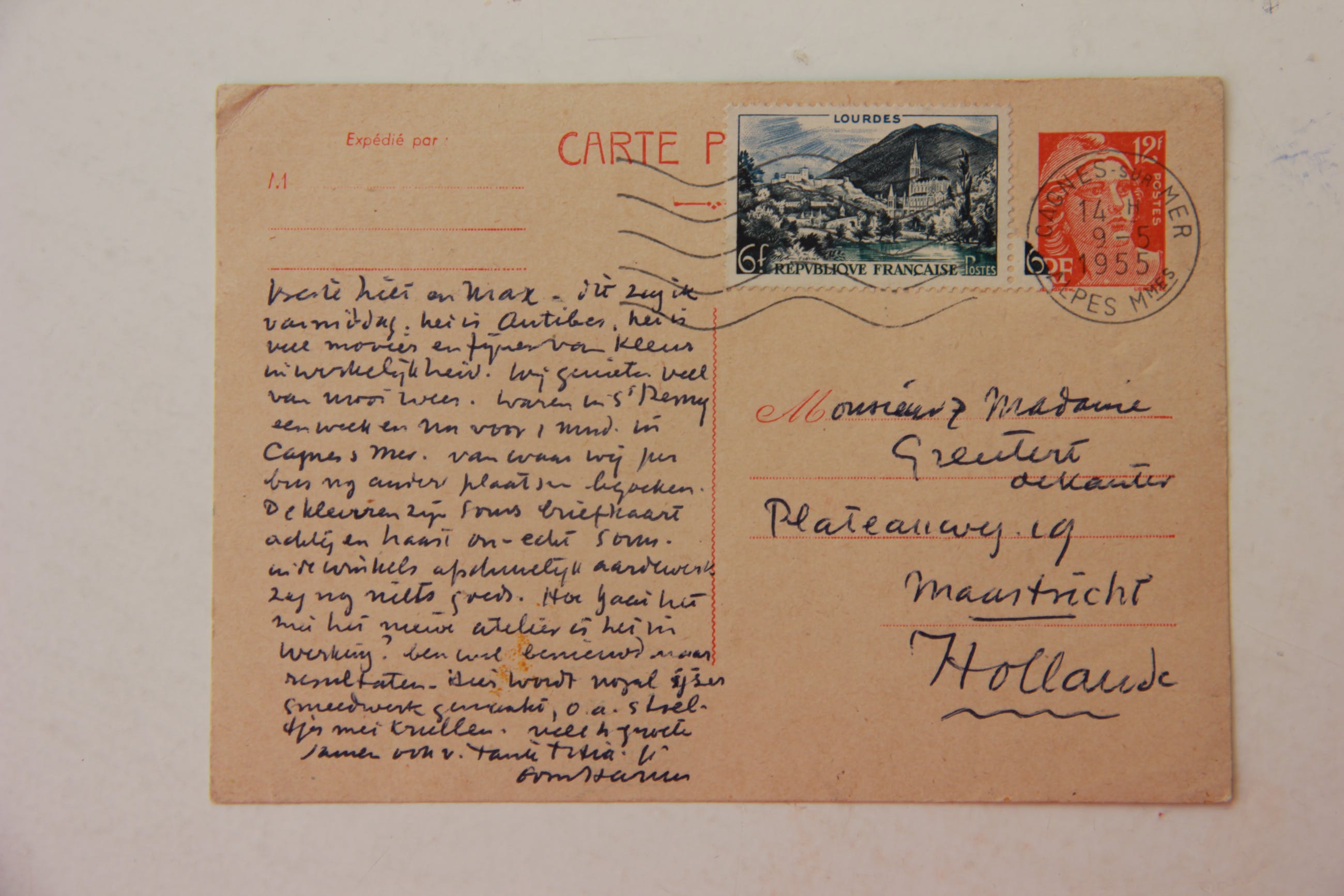 Beste Liet en Max. Dit zag ik vanmiddag, het is Antibes, het is veel mooier en fijner van kleur in werkelijkheid. Wij genieten veel van mooi weer. Waren in St. Remy een week en nu voor 1 mnd. in Cagnes s. Mer vanwaar wij per bus nog andere plaatsen bezoeken. De kleuren zijn soms briefkaartachtig en haast on-echt soms. In de winkels afschuwelijk aardewerk, zag nog niets goeds. Hoe gaat het met het nieuwe atelier is het in werking? ben wel benieuwd naar resultaten. Hier wordt nogal ijzersmeedwerk gemaakt, o.a. stoeltjes met krullen. Veel h. groeten samen ook v. Tante Titia, je Oom Harm