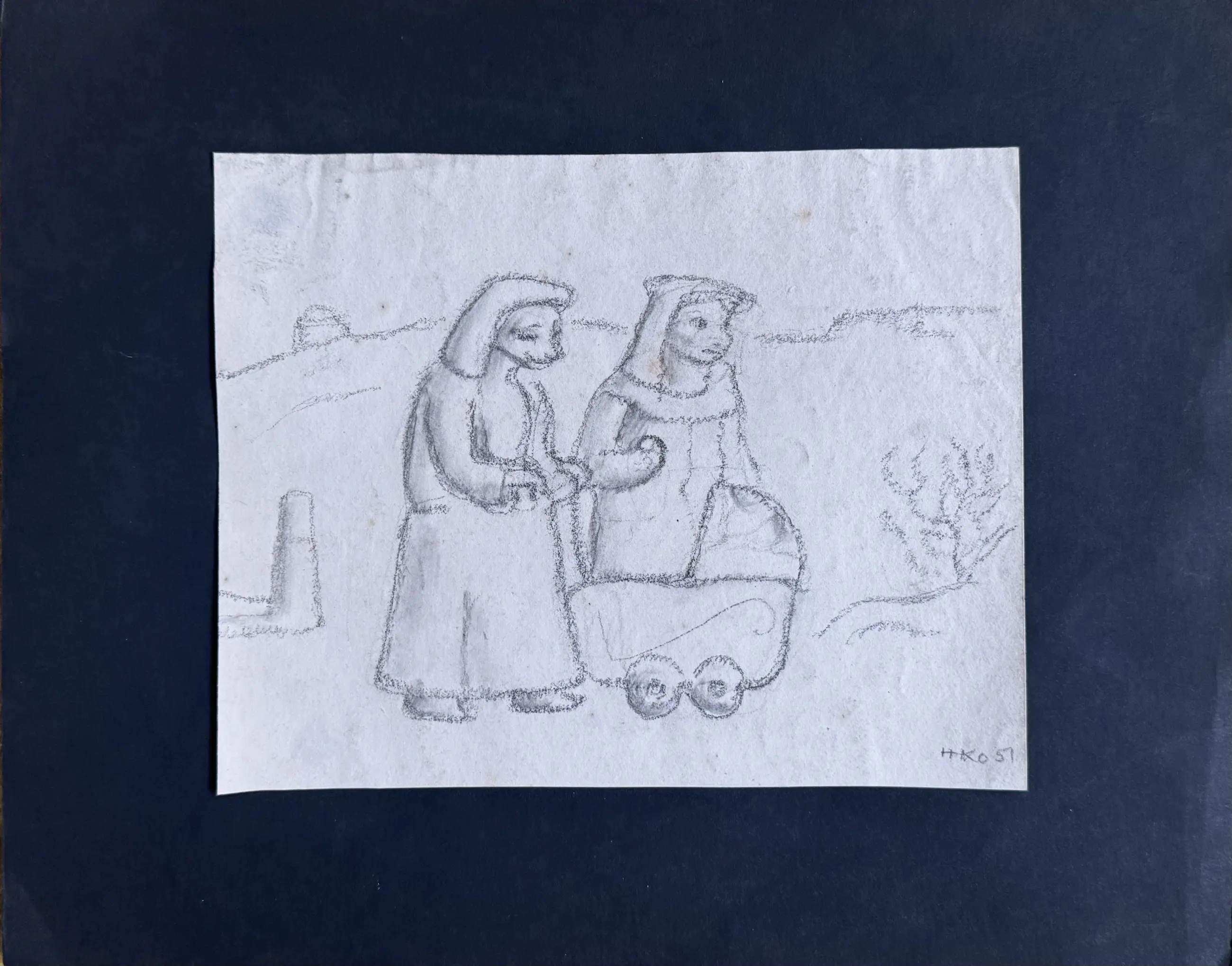 Leuke tekening gemaakt door Harm Kamerlingh Onnes, voorstellende " Dames met kinderwagen jaren '50 " Gesigneerd en gedateerd links onderin. Geplakt op zwart papier.