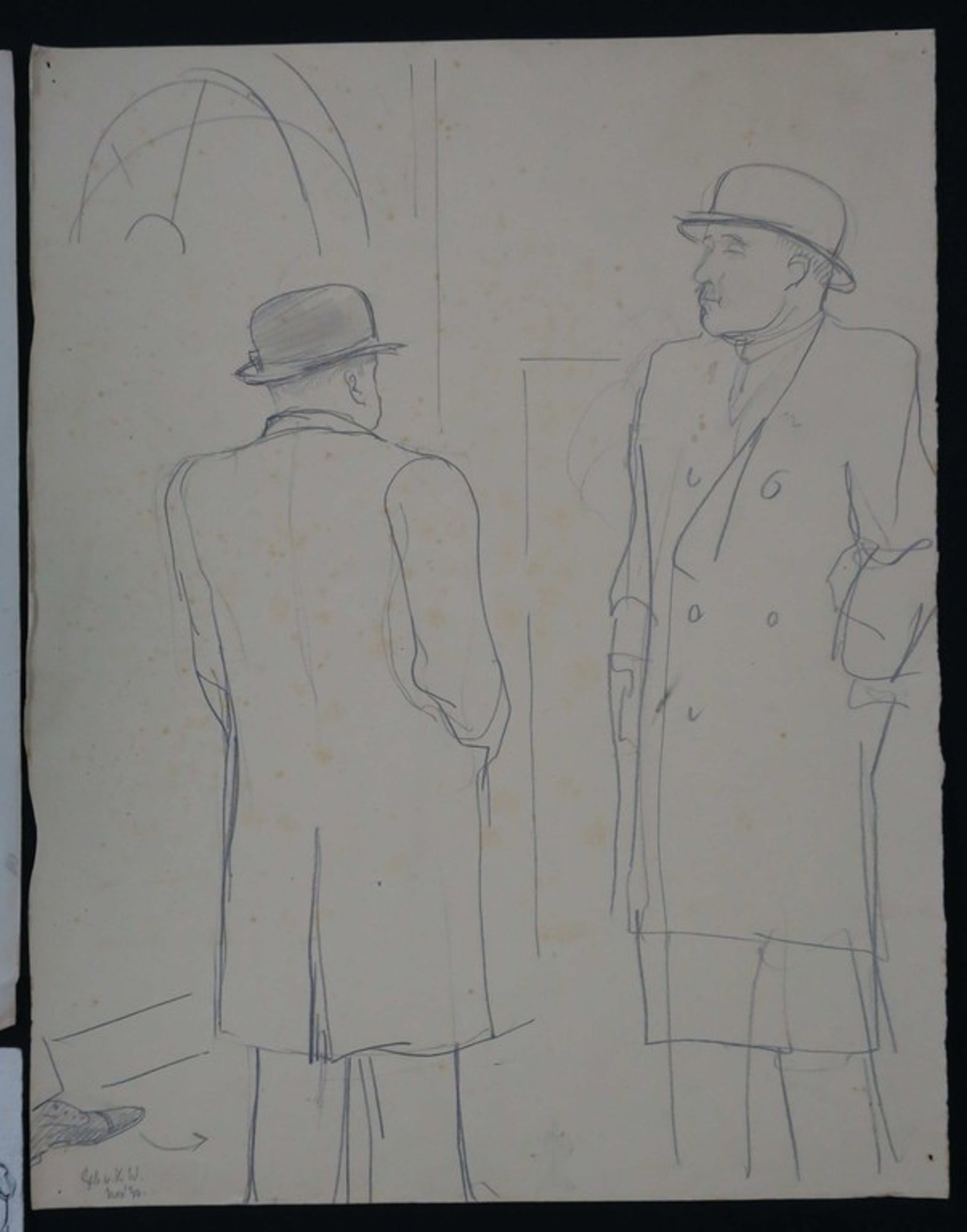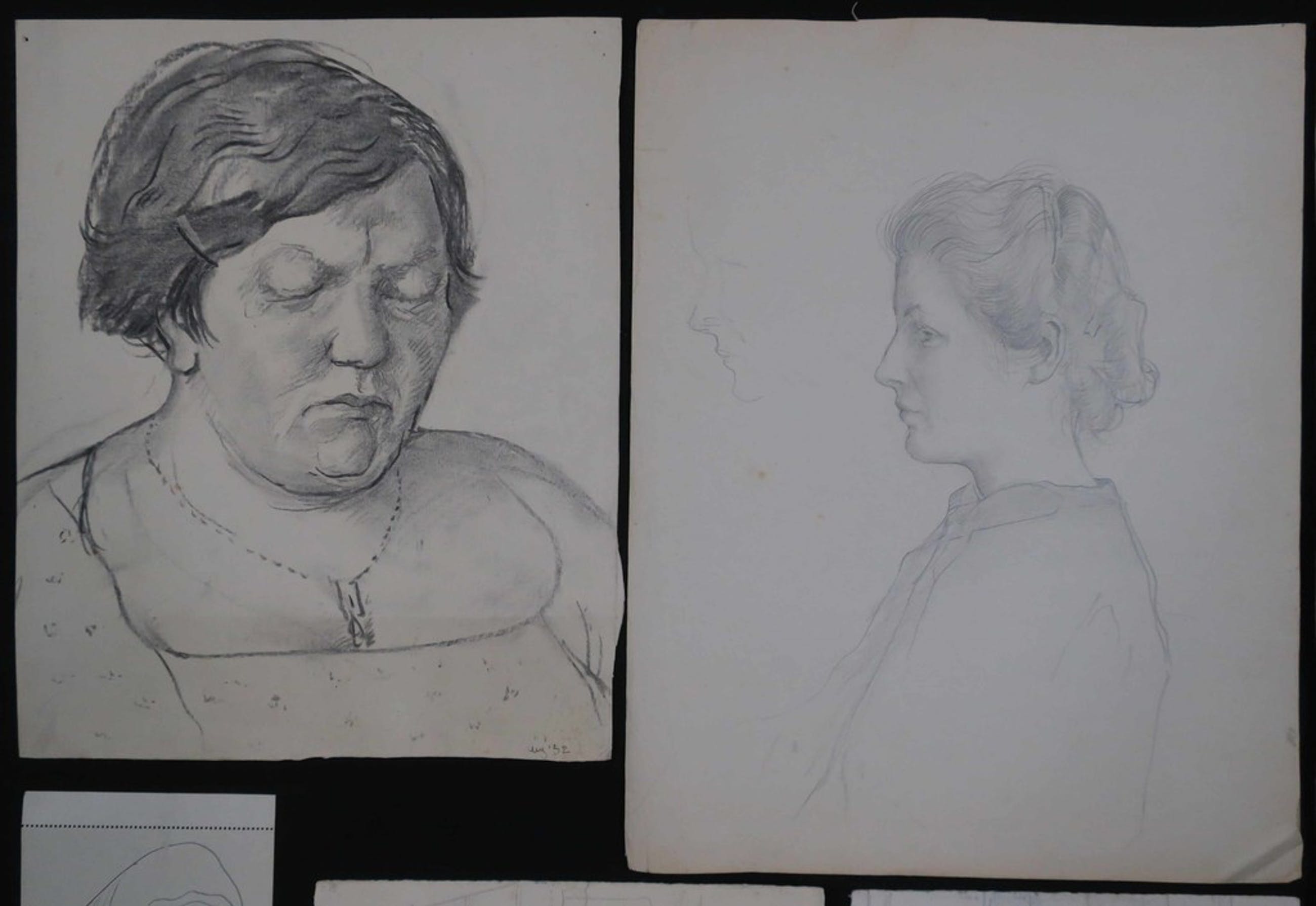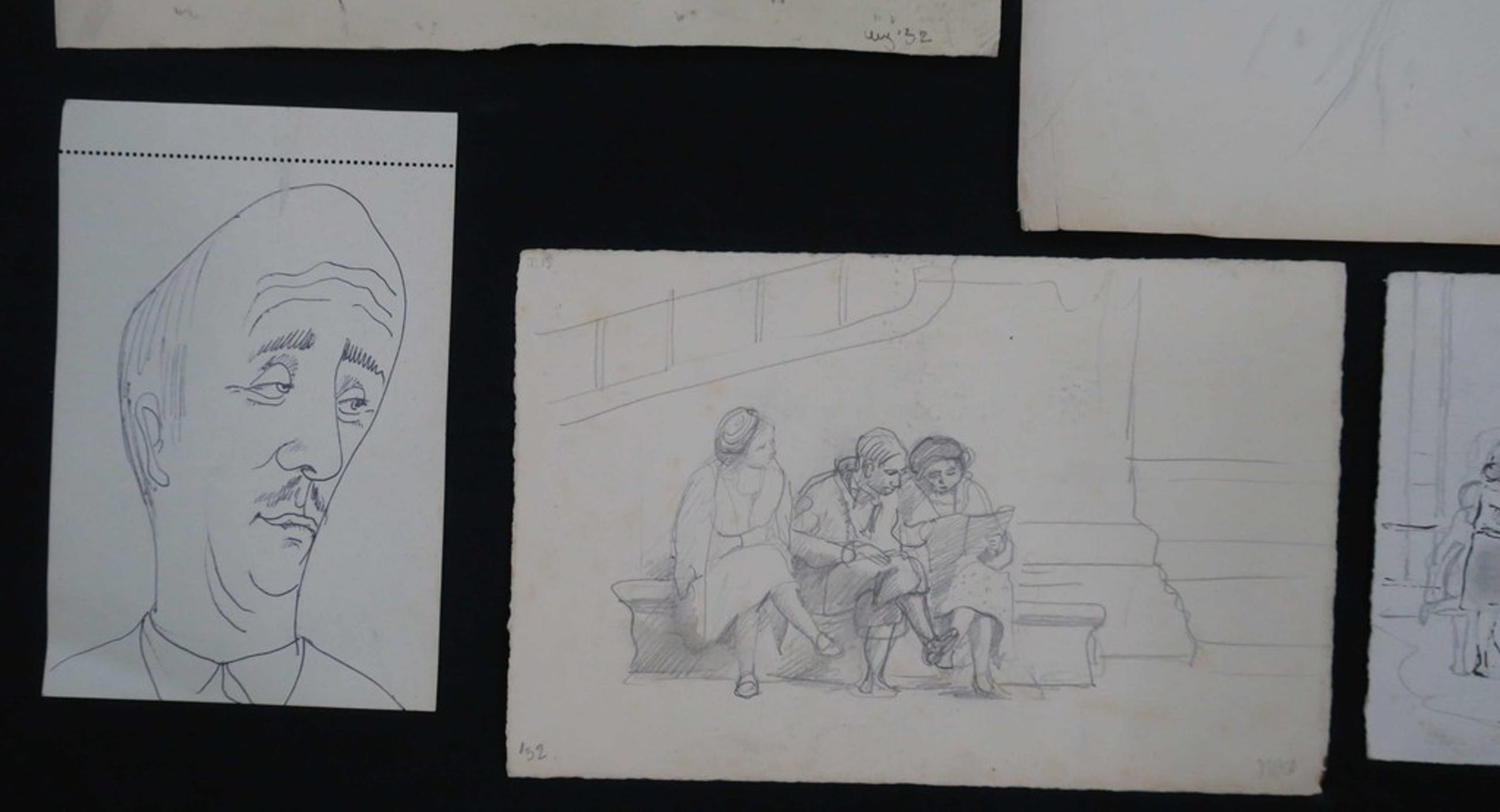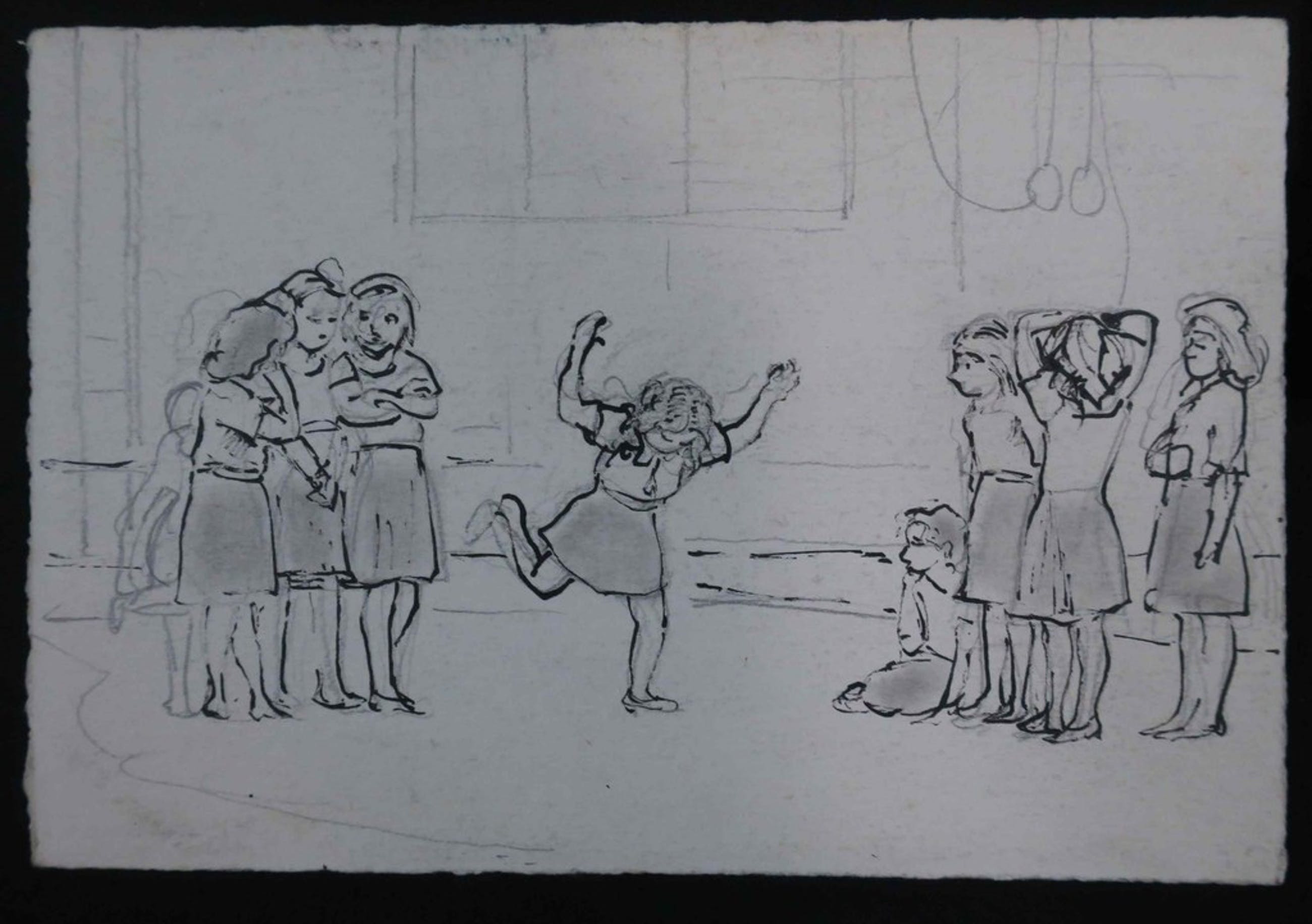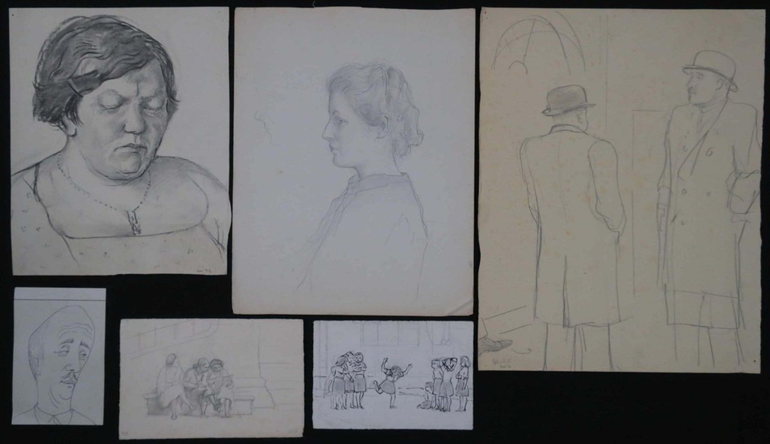 Waaronder twee portretten, één figuurstudie van een kop en drie scénes uit het dagelijks leven, waaronder een zeer mooie tekening van spelende meisjes in een gymanstiekzaal. Op de achterzijde van een van de tekeningen bevinden zich schetsen in inkt (zie foto's).