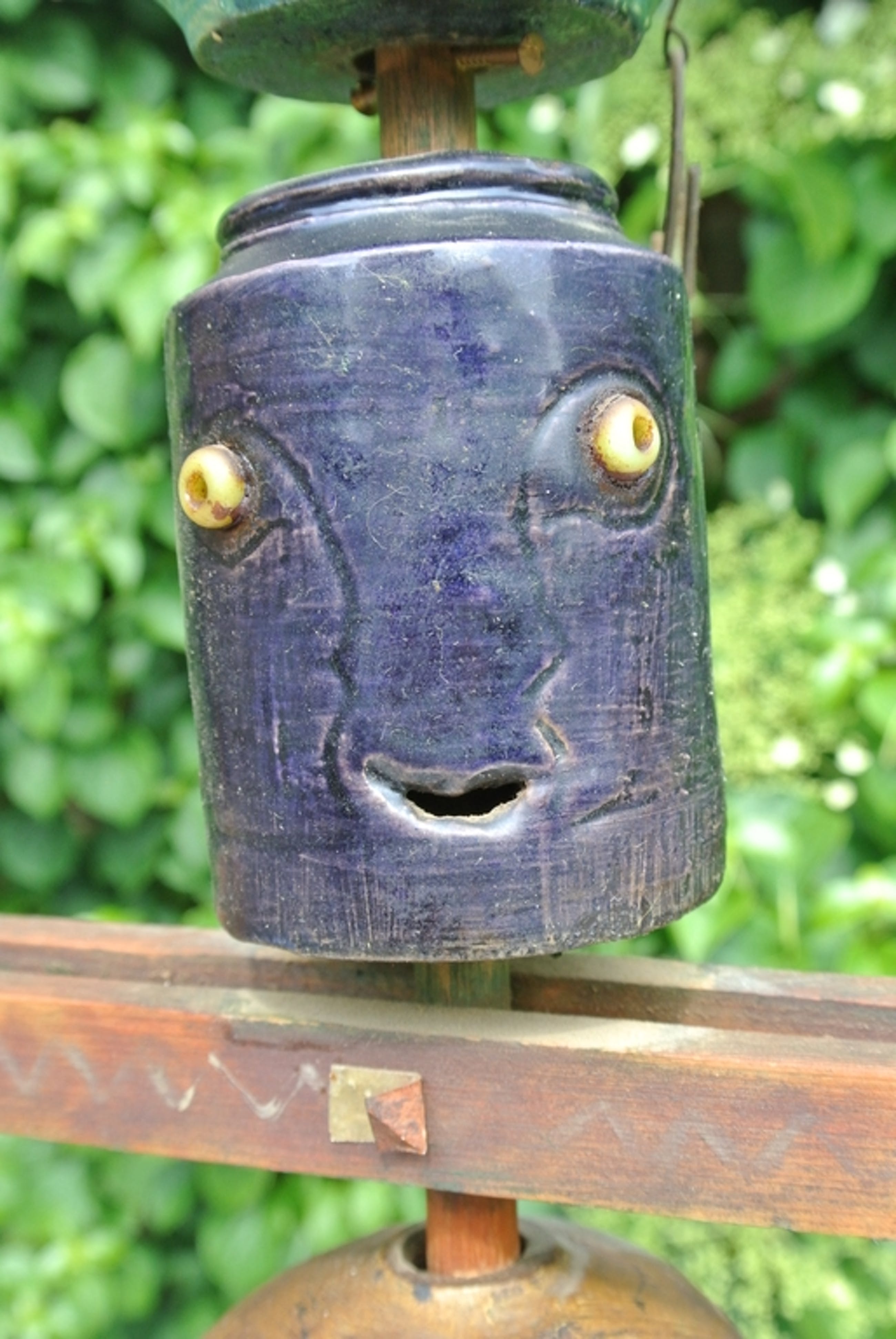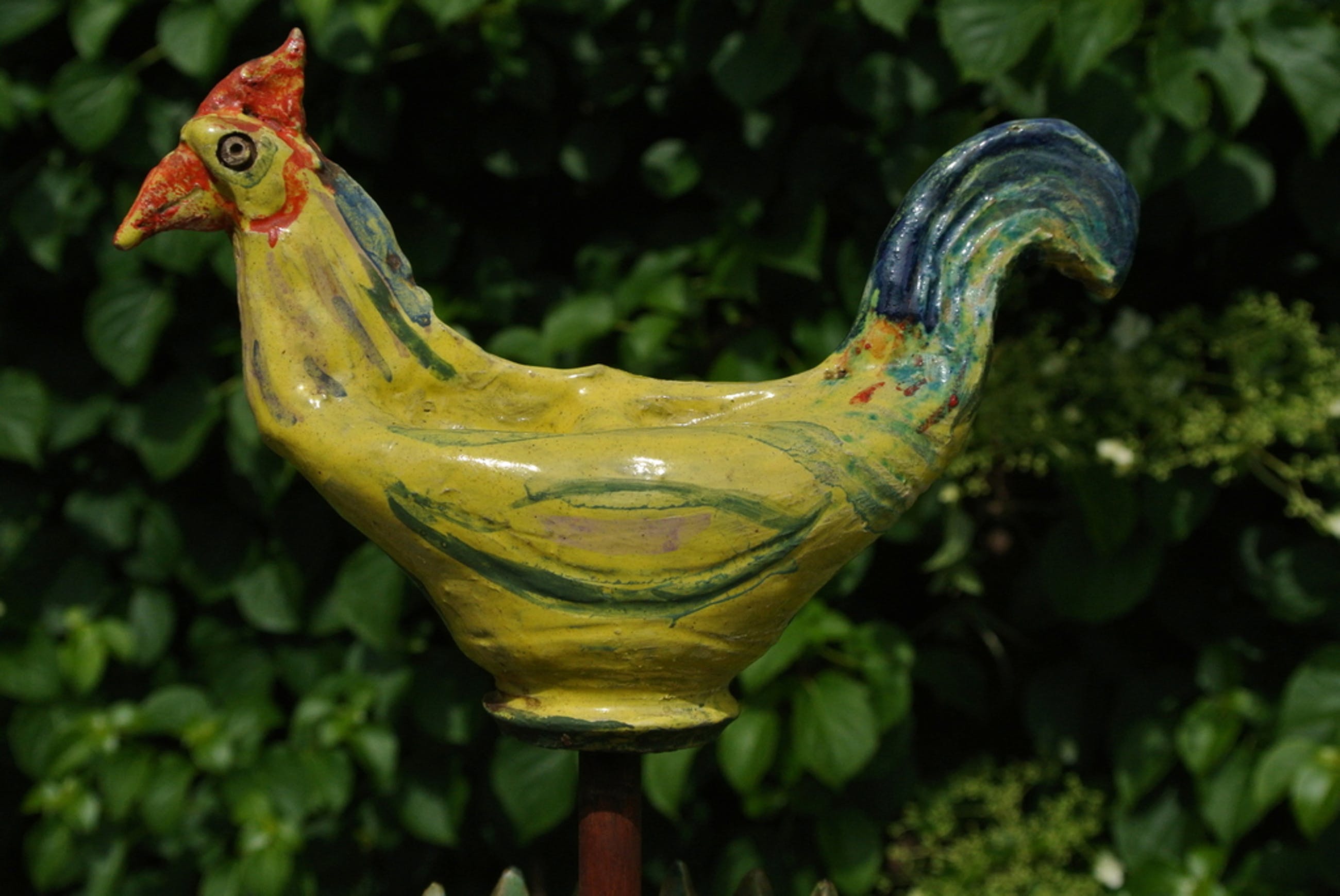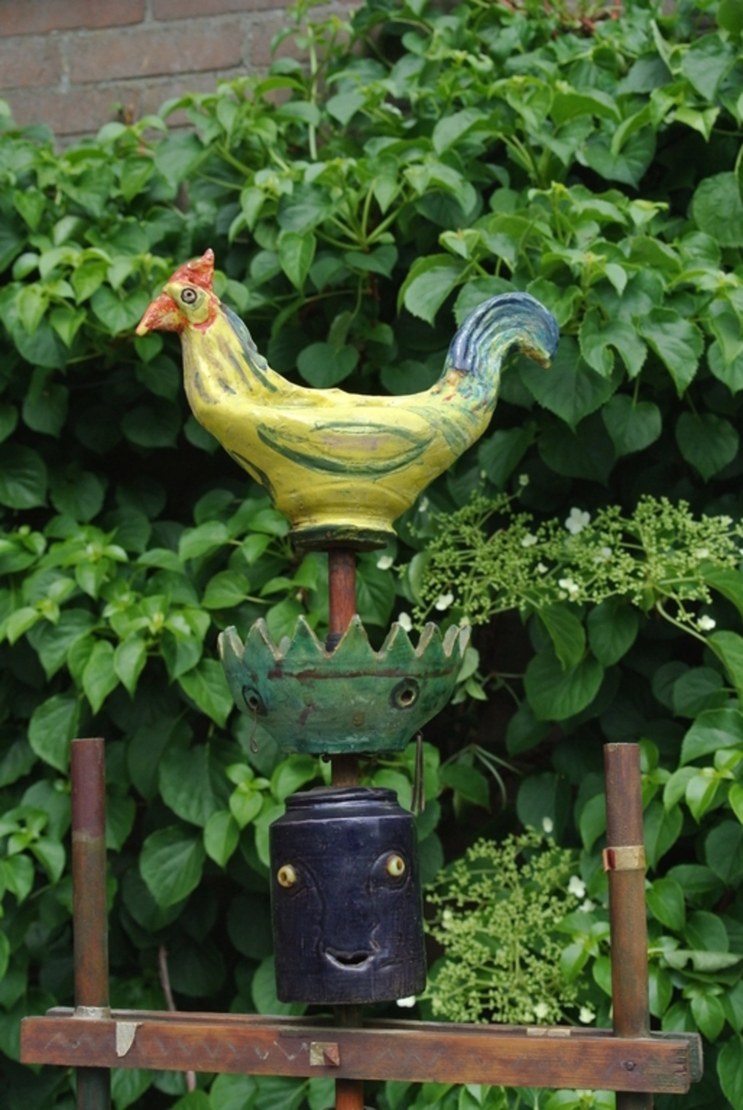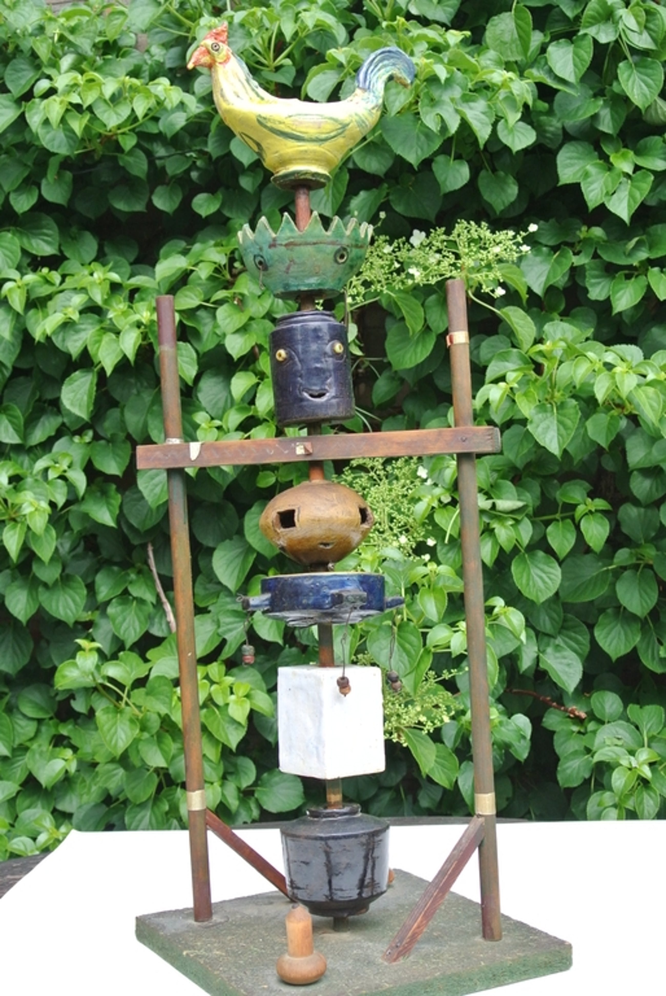 Afmetingen: Totale hoogte 74 cm.- Grondplaat 26 x 26 cm. - Afstand tussen de 2 staande stokken 26 cm. - De keramiekjes hebben diverse afmetingen en de haan meet 13 x 19 cm. Voor elk stukje keramiek zijn 1 of meer verschillende soorten glazuur gebruikt.