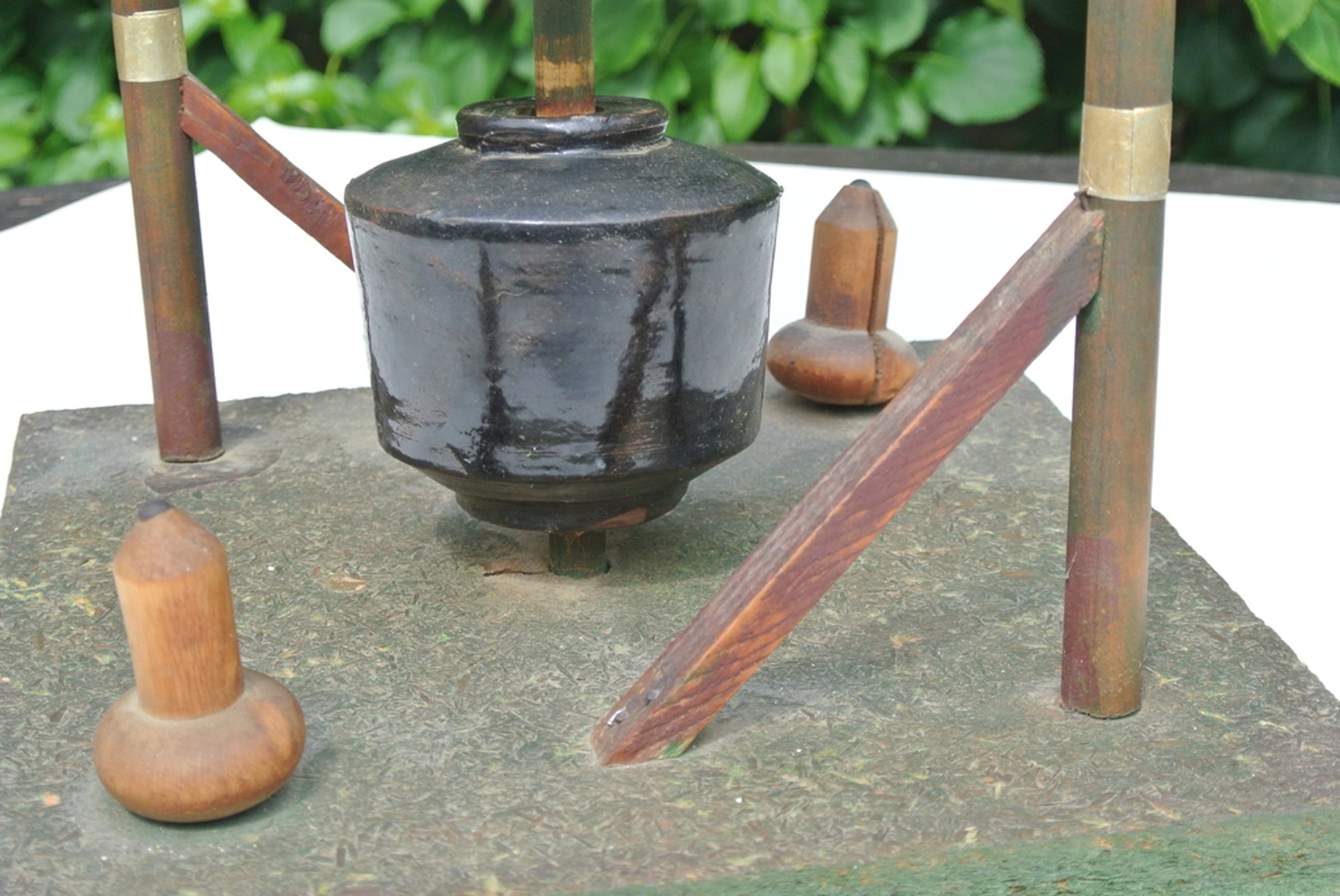 Houten stellage met 7 keramieken op spaanplaat onderplaat met 2 tollen.