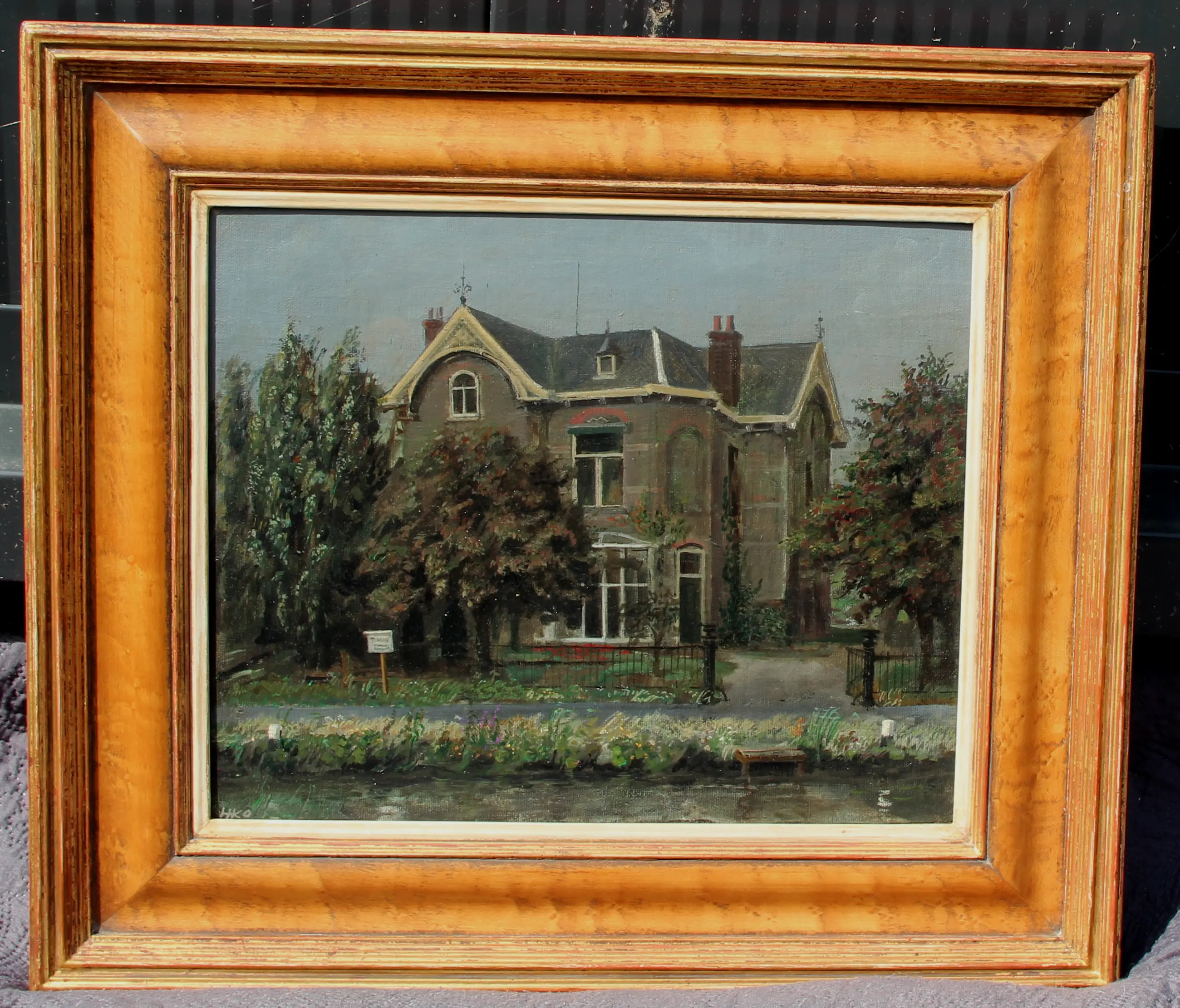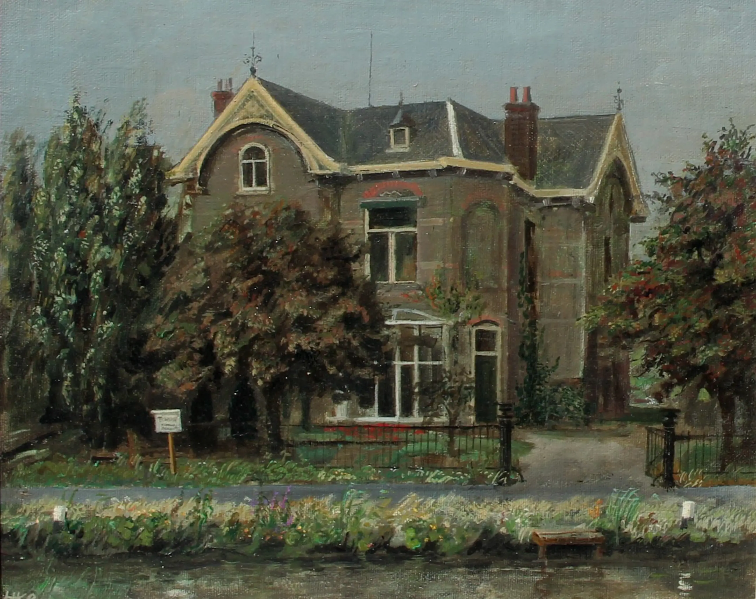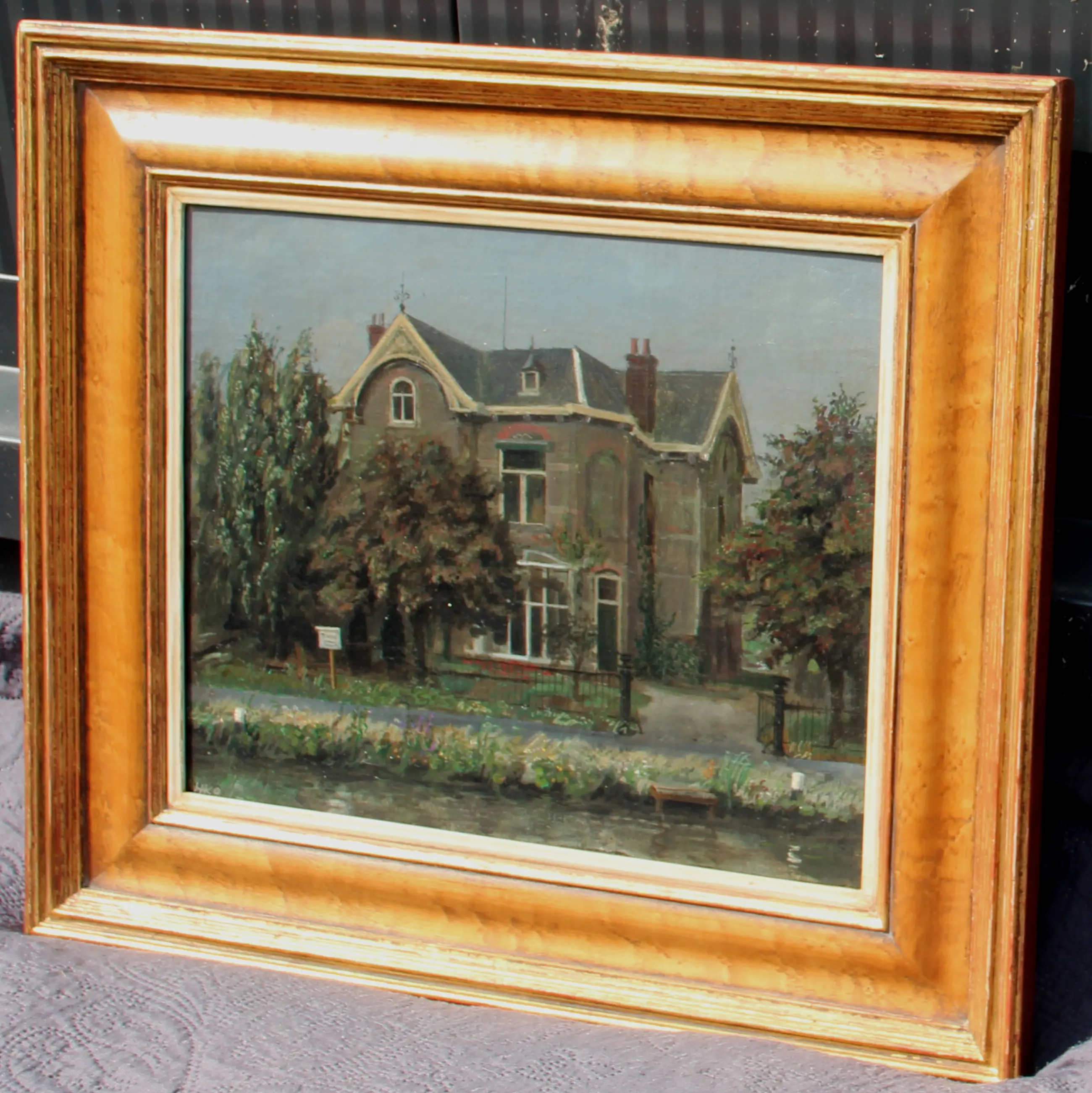 Ingelijste marouflé van Harm Kamerlingh Onnes (1893-1985). Titel: villa aan de waterkant. Deze afbeelding toont een schilderij van de villa die bekend staat als het Kamerlingh Onnes Huis in Leiden, waar de Nederlandse natuurkundige en Nobelprijswinnaar Heike Kamerlingh Onnes woonde en werkte.