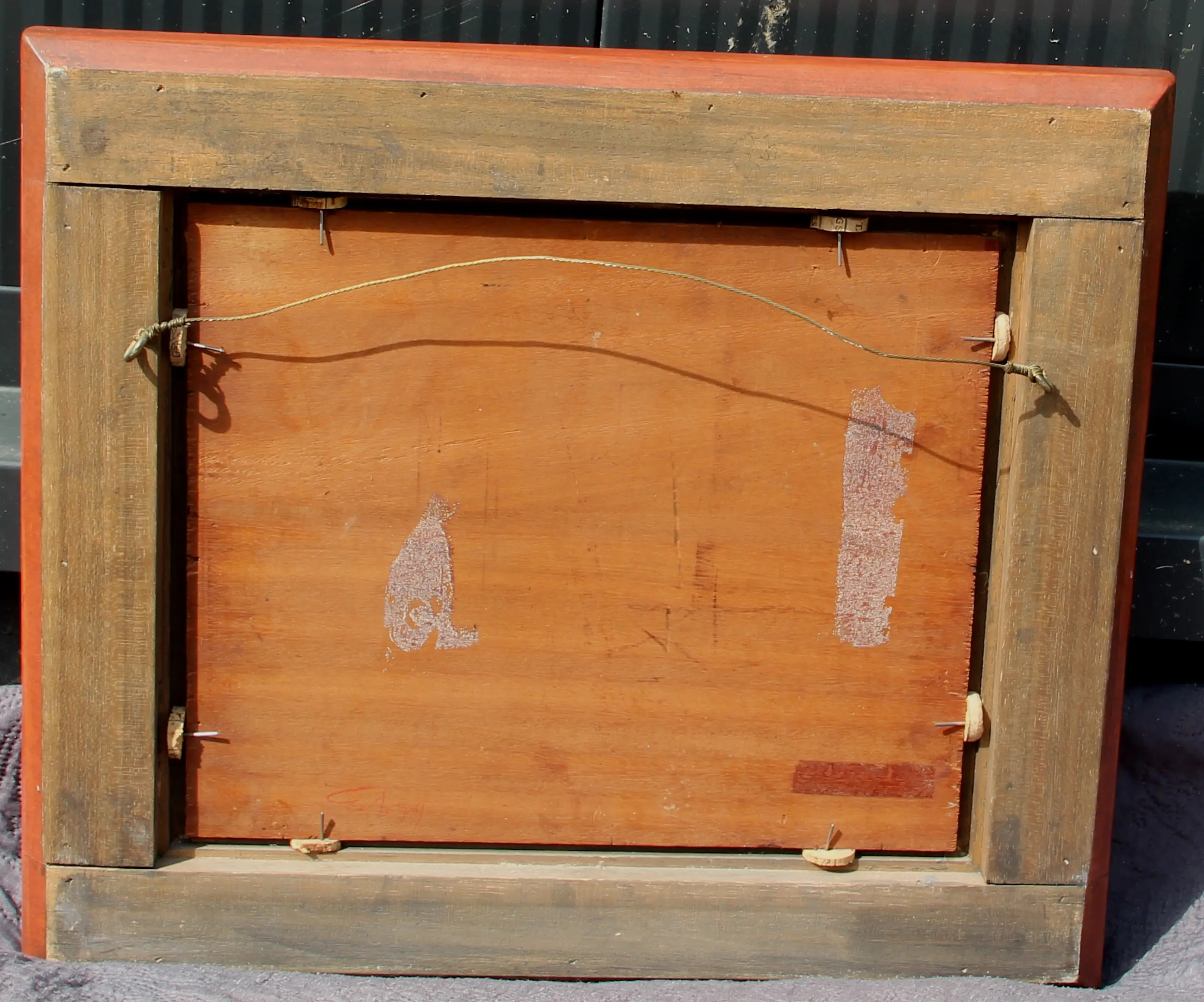 Afmetingen incl lijst: H40cm x b45cm. Afmetingen voorstelling: H25 x b31cm. Het werk is, links onderaan gemonogrammeerd, door de kunstenaar.