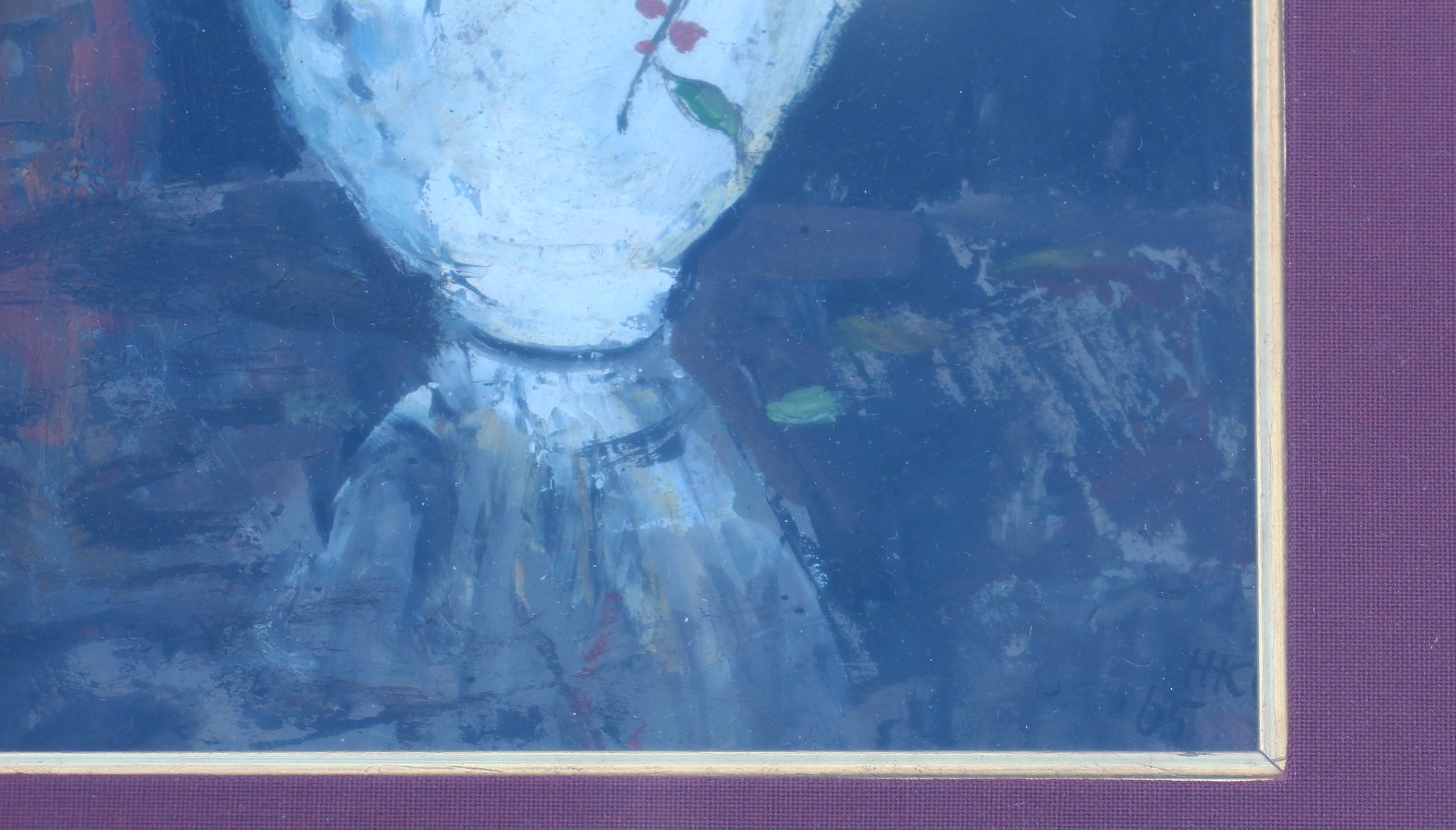 Olieverf, ingelijst van Harm Kamerlingh Onnes. Jaar: 1965. Afmetingen incl lijst: H34 x b29cm. Afmetingen voorstelling: H17 x b12.5cm. Het werk is rechts onderin gesigneerd en gedateerd door de kunstenaar met de letters "HKO" (O staat gedeeltelijk onder passe-partout) en '65. Dit is zeer lastig te fotograferen. De authenticiteit van het werk wordt volledig gegarandeerd. Een certificaat van echtheid kan, op aanvraag, worden gemaild.
