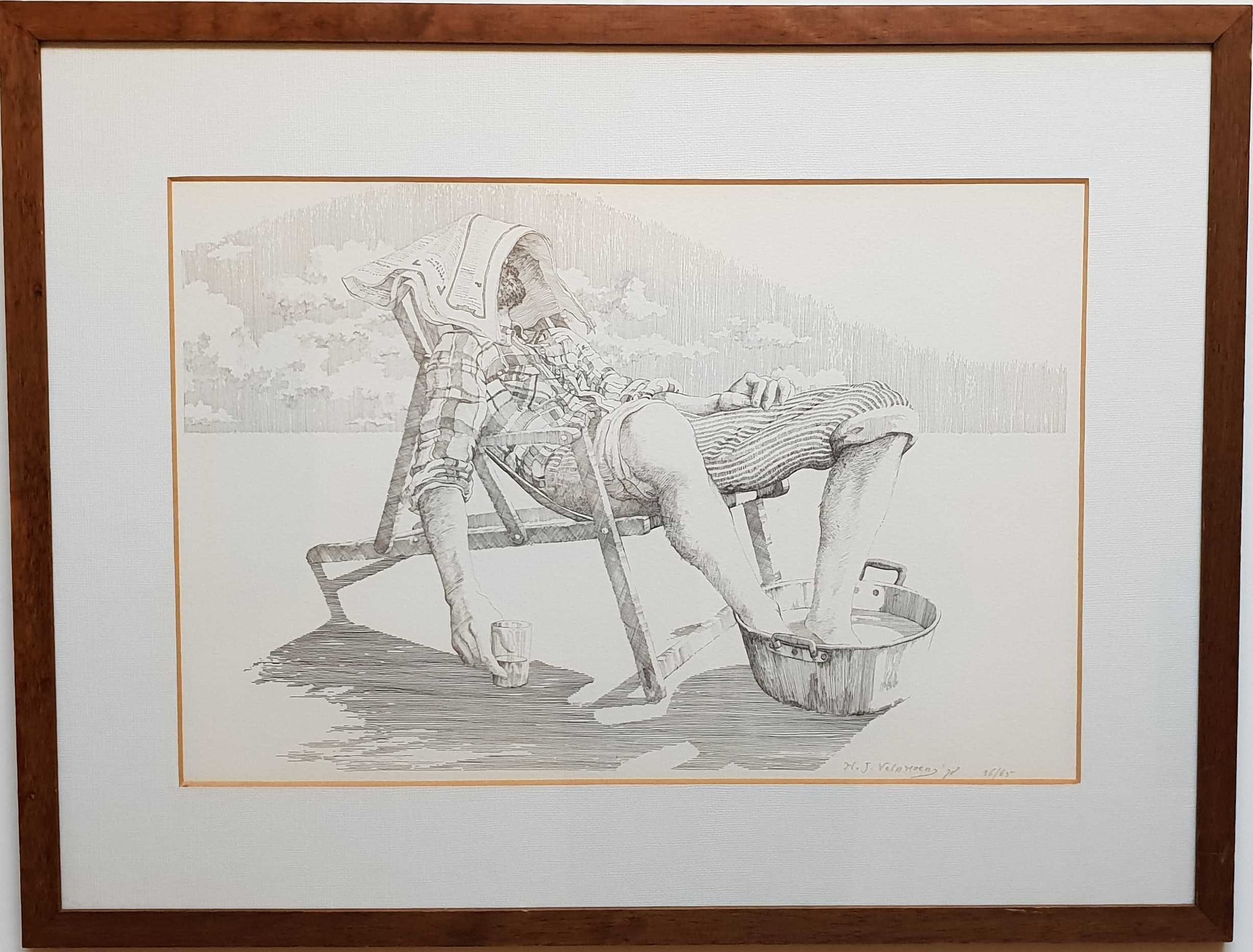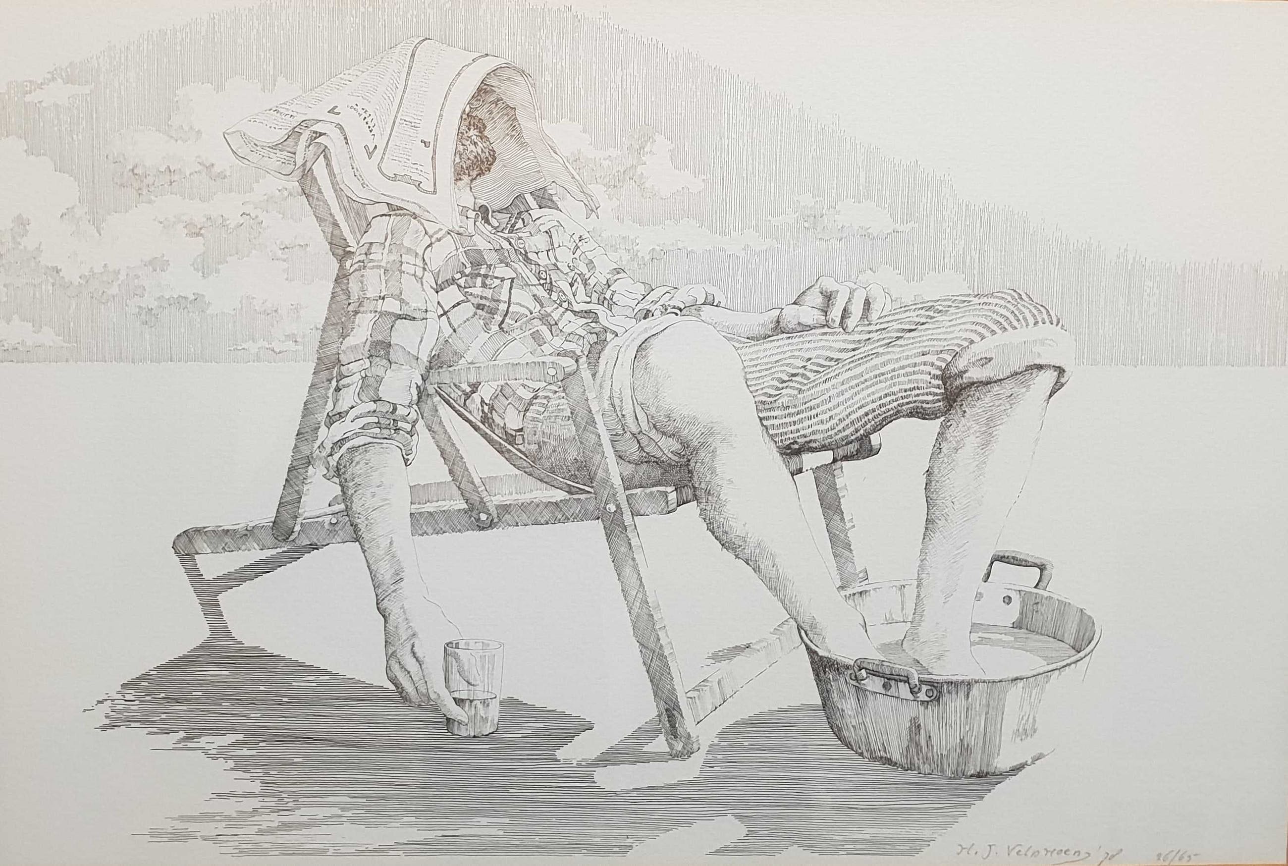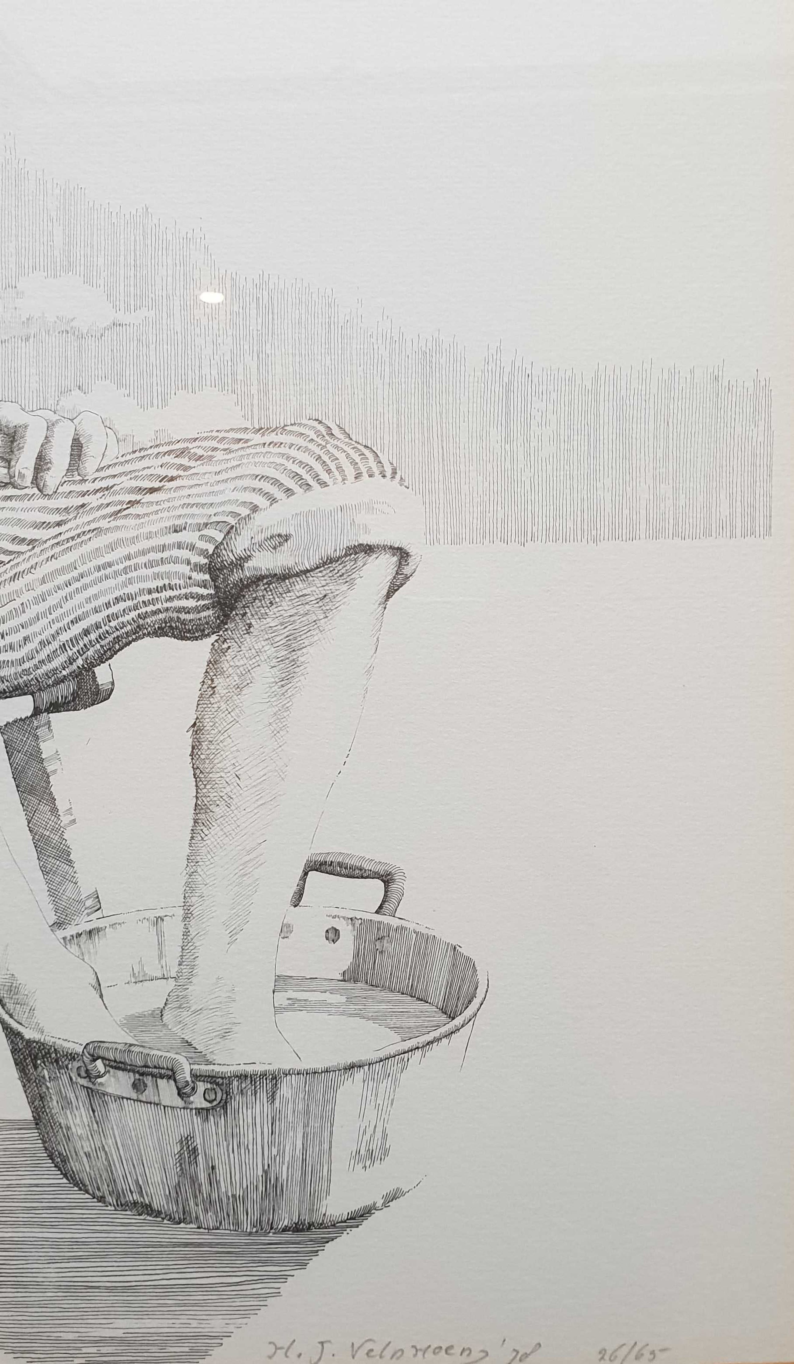 Prachtige ets uit 1978 door H.J. Veldhoen. Nummer 26 uit een oplage van 65 en gesigneerd door de kunstenaar. Dit fraaie werk is ook nog eens heel mooi ingelijst in een houten lijst en passe-partout achter glas. Indien het werk moet worden opgestuurd wordt wel het glas verwijderd, omdat dan de kans op breuk en verdere schade te groot is. Afhalen heeft dus de voorkeur!