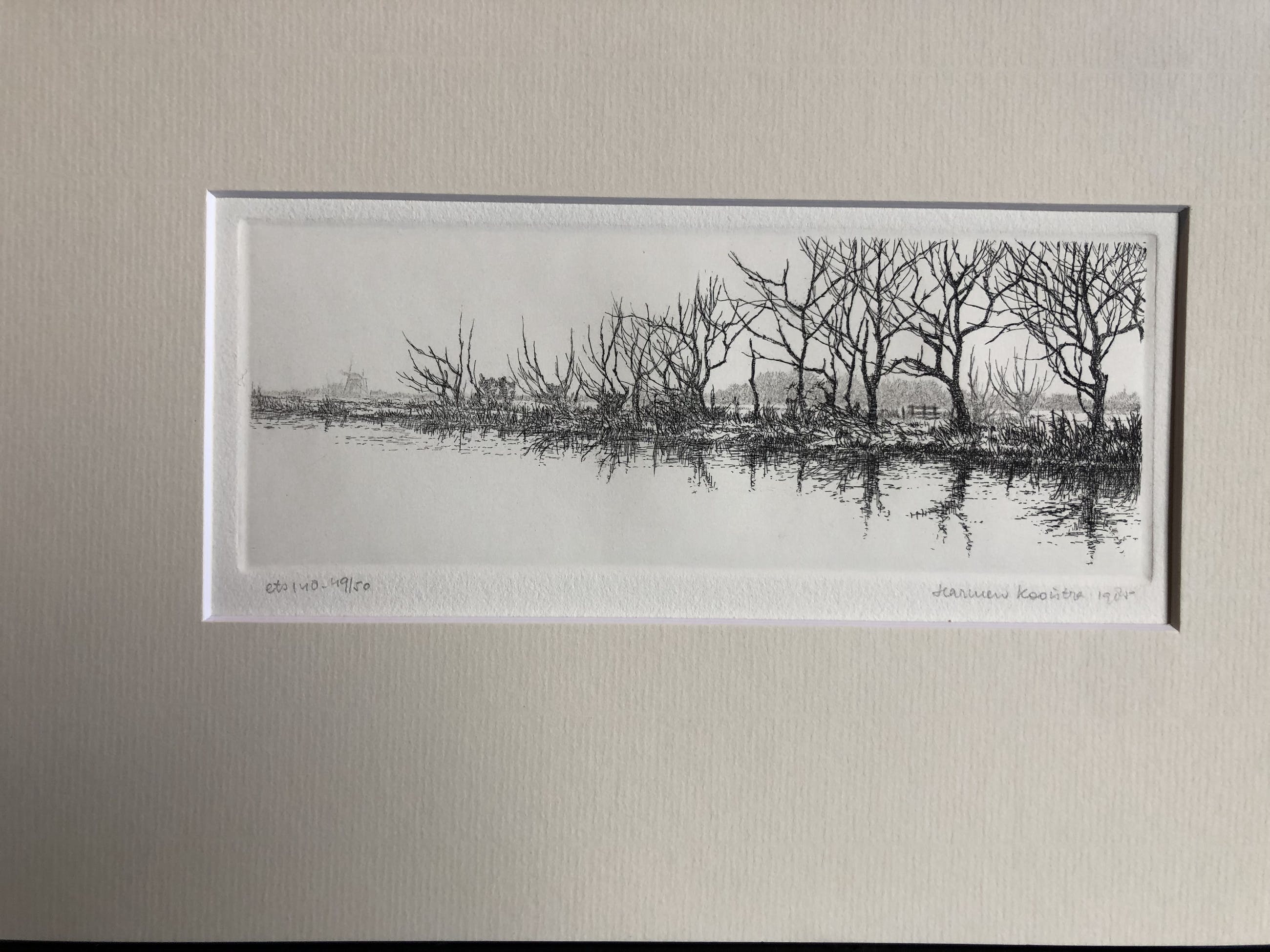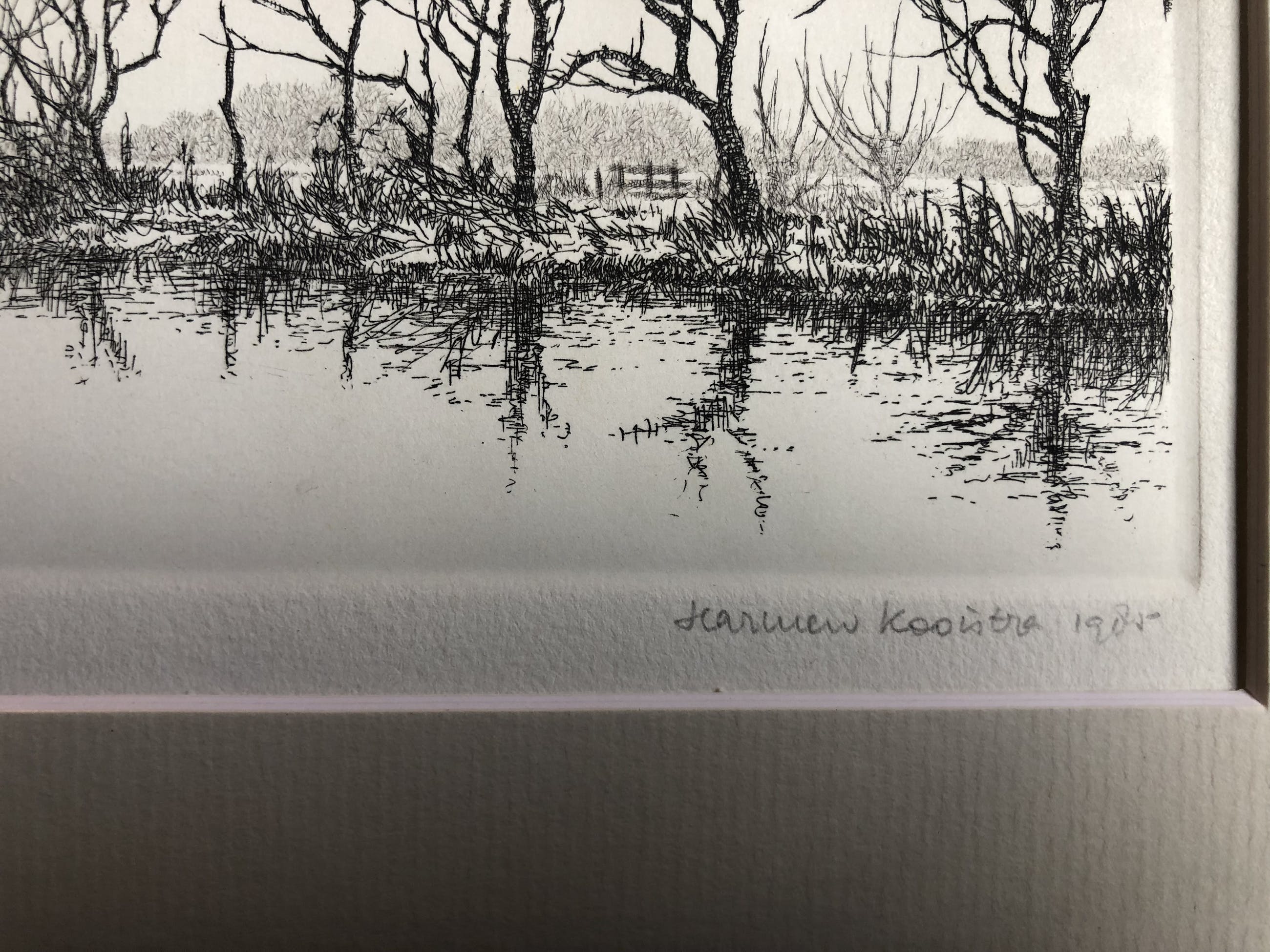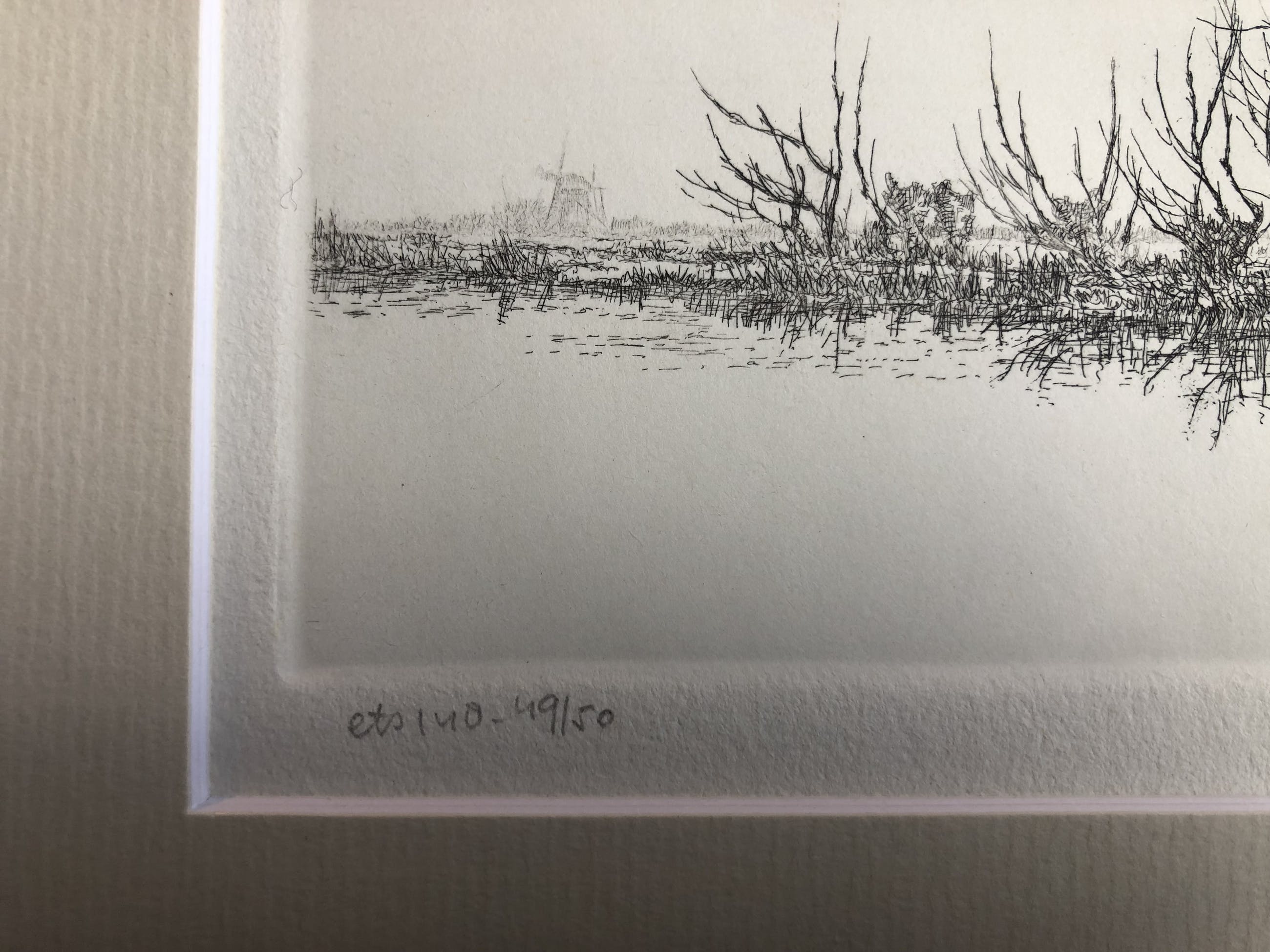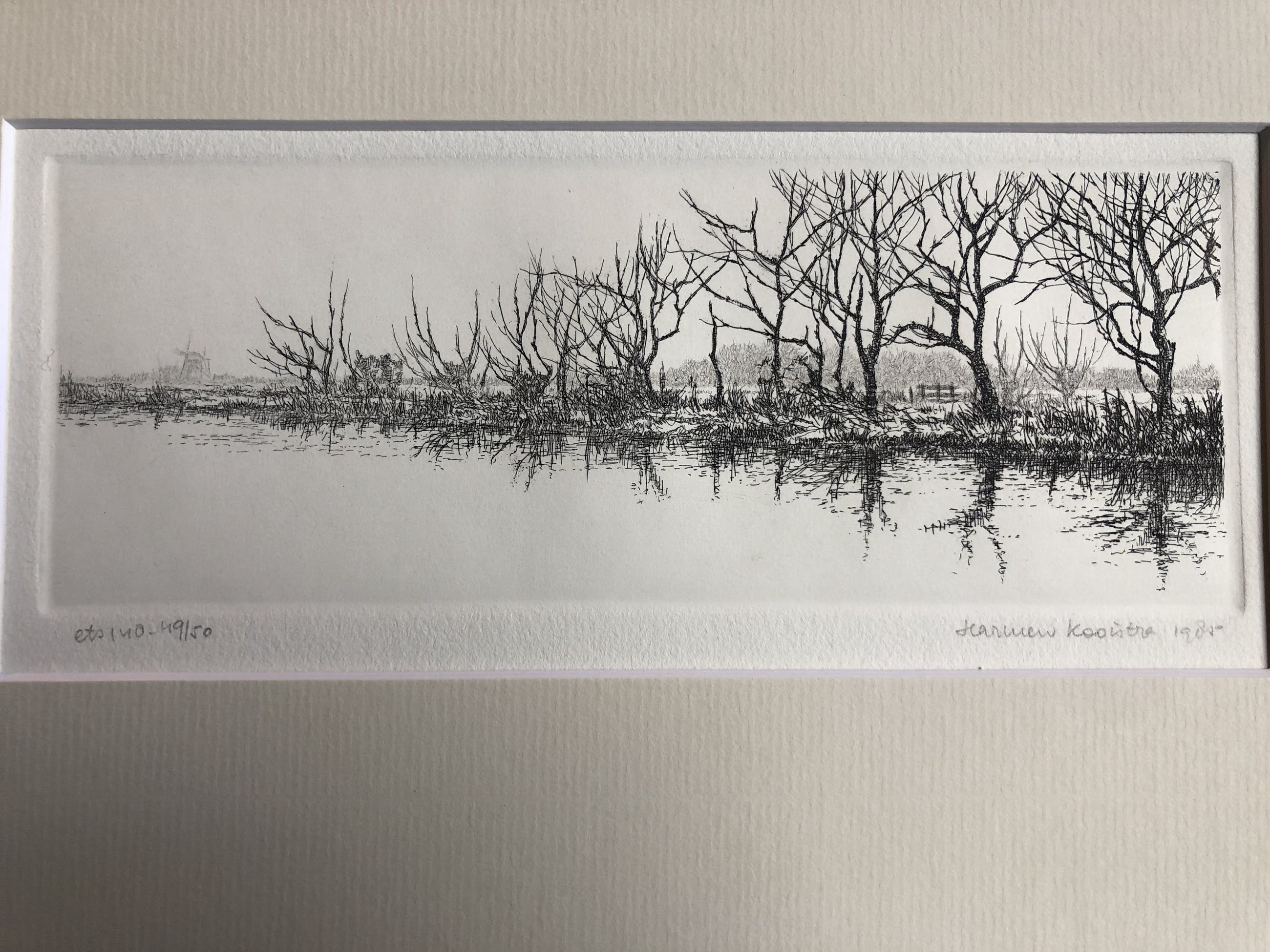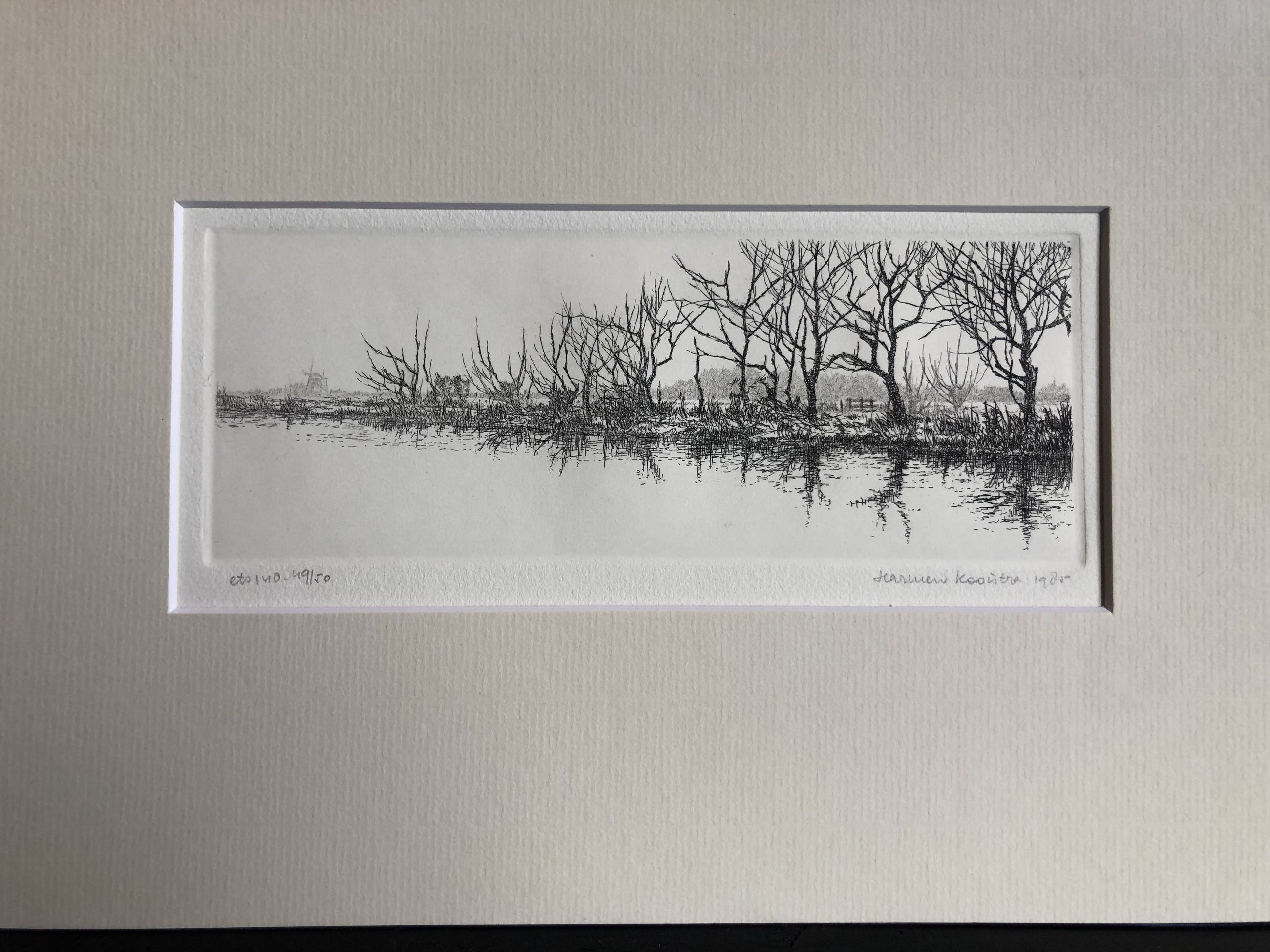 Schitterend werk van Harmen Kooistra zeer gedetailleerde en verfijnde ets van bomenrij langs het water met op achtergrond een molen