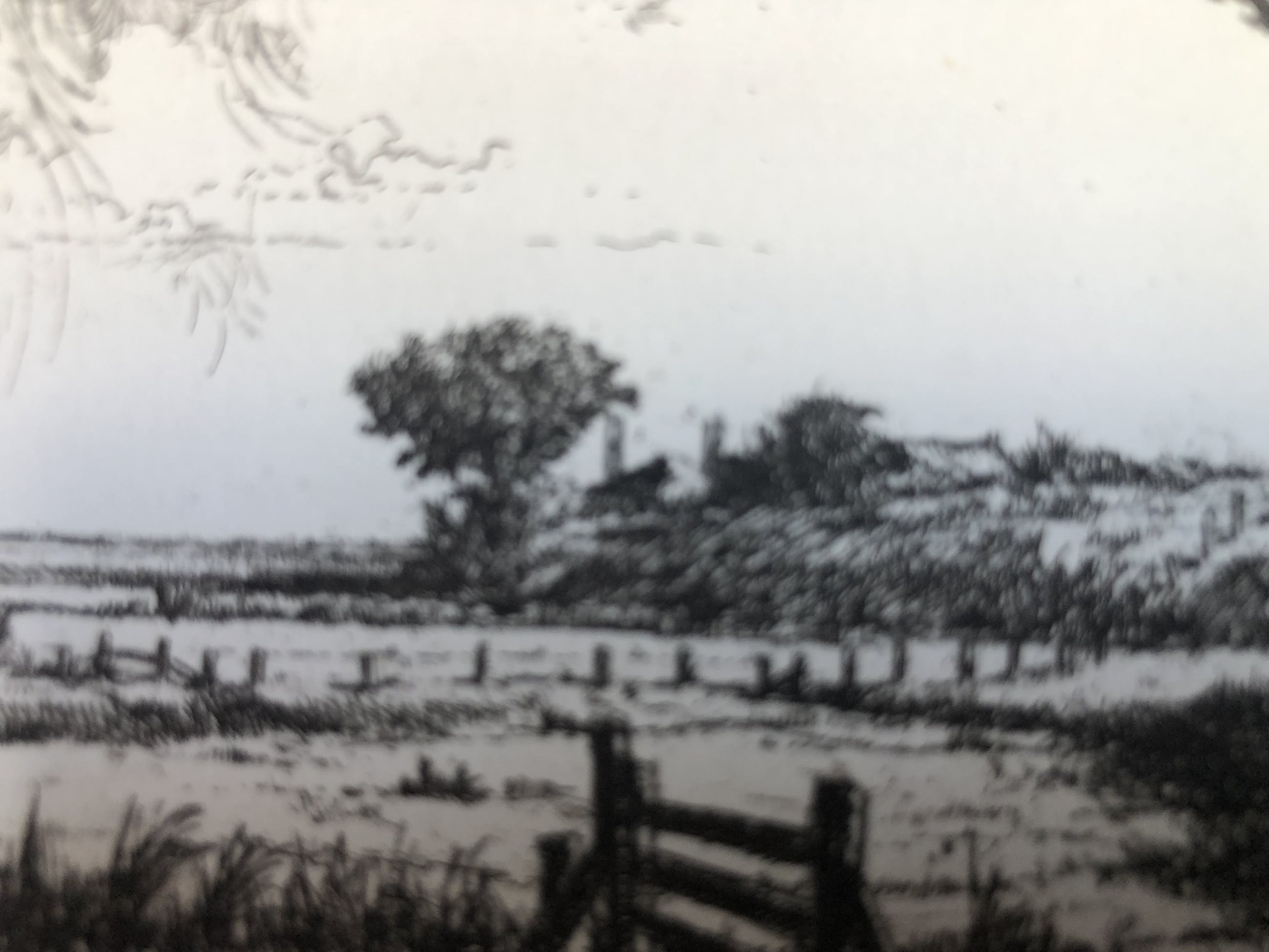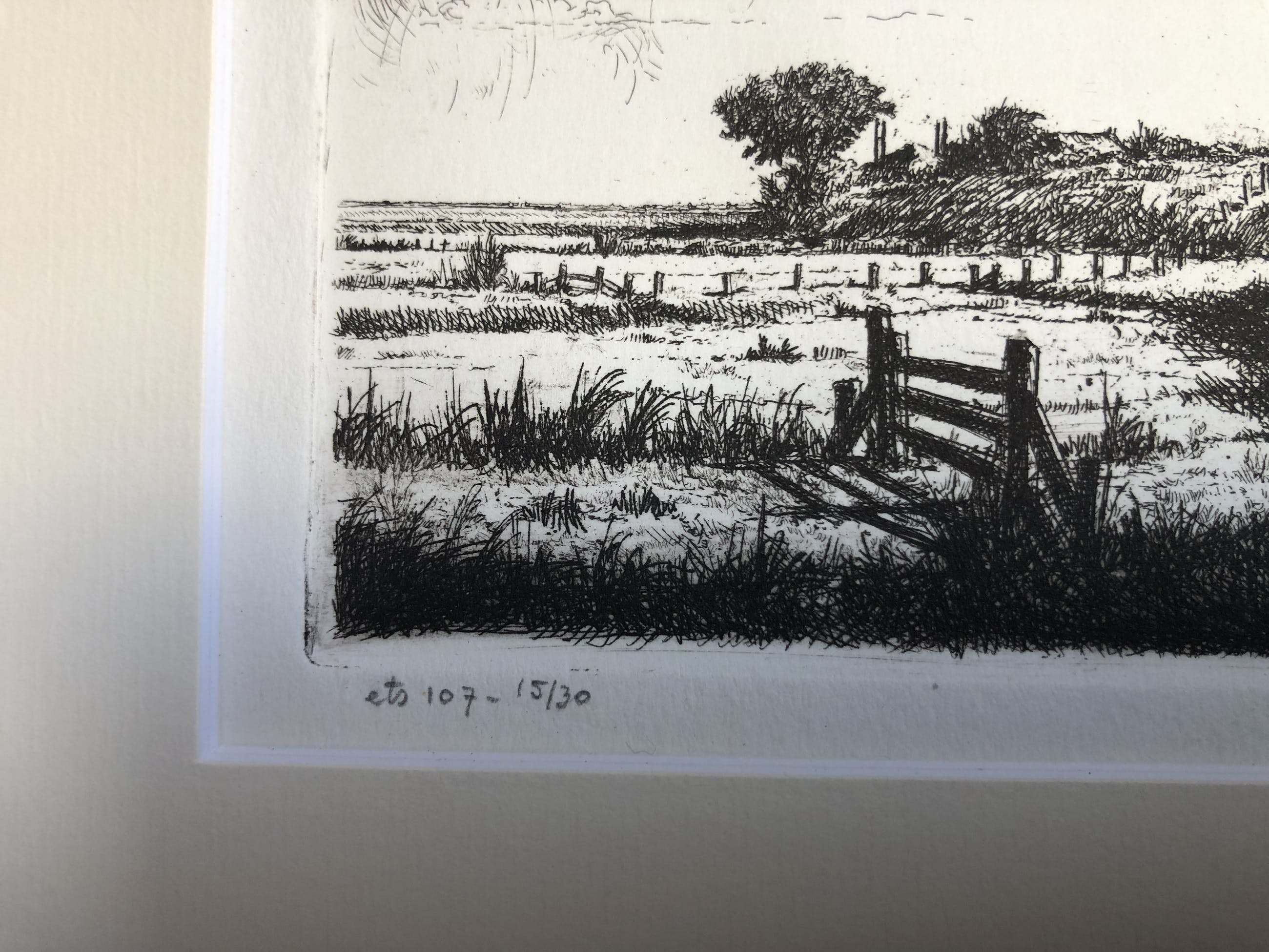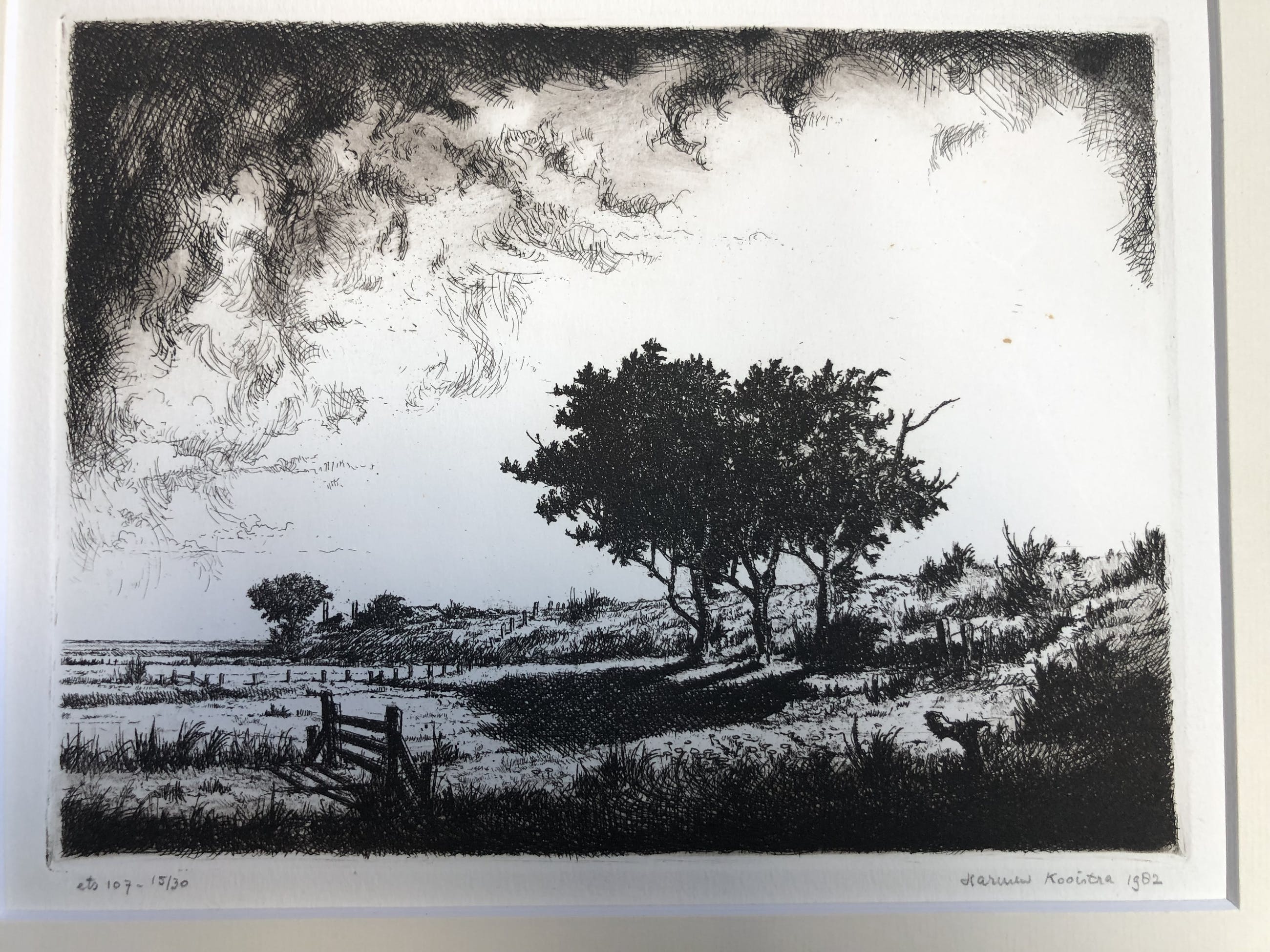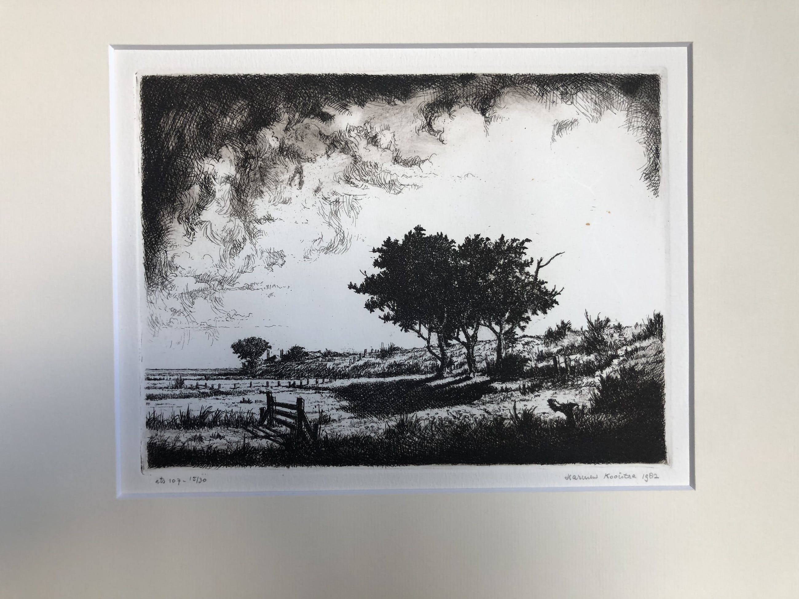 Prachtige gedetailleerde ets van landschap met boerderij en hooiberg op achtergrond met dreigende onweerswolken Ets 107 - 15/30