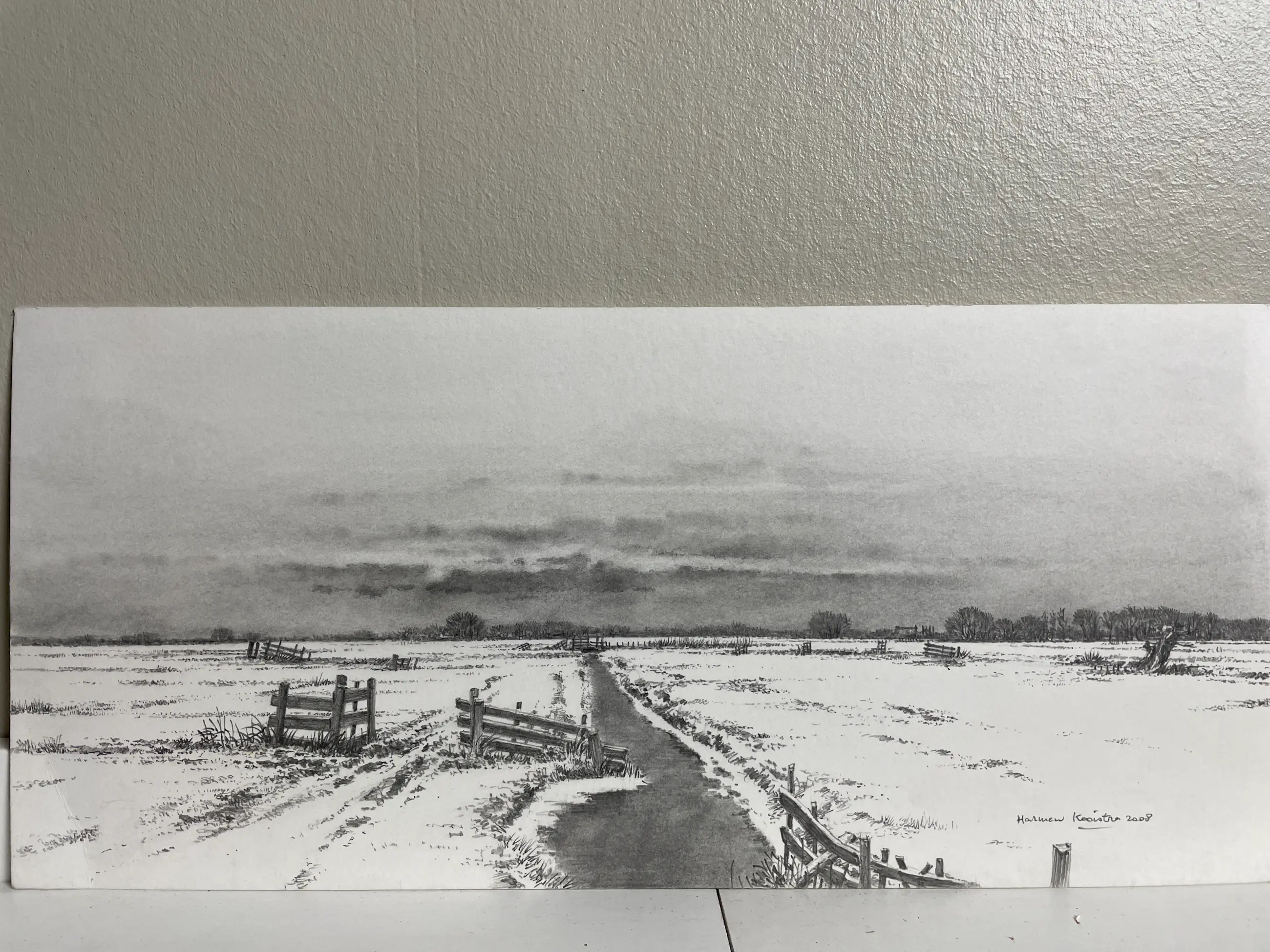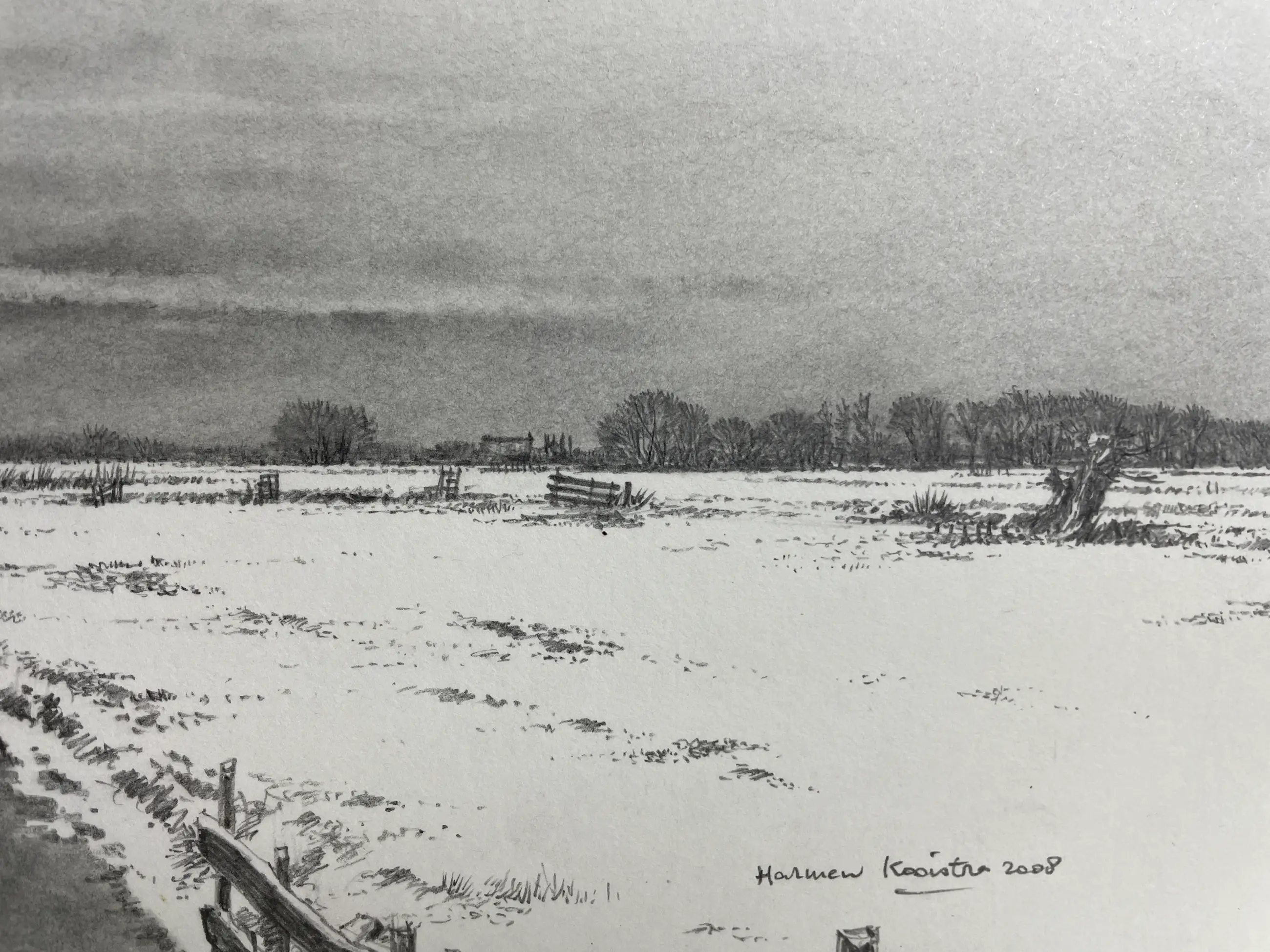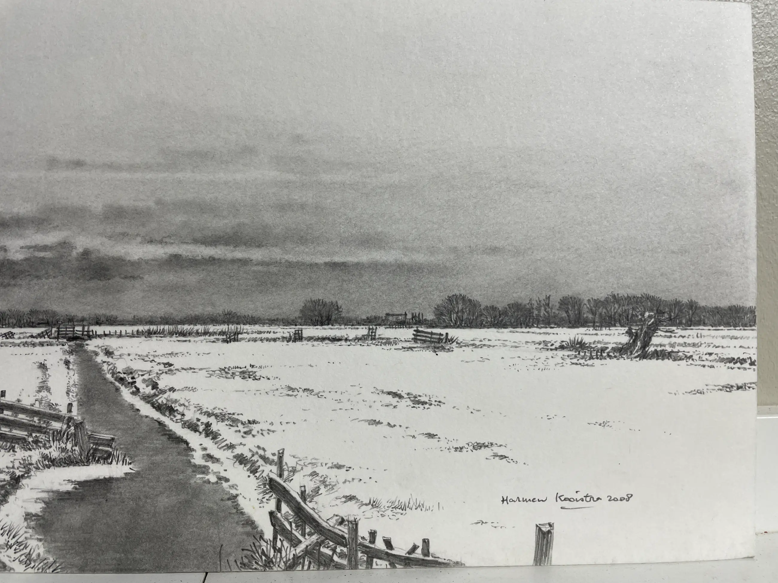 Prachtige gedetailleerde pentekening van Harmen Kooistra. Hier zie je het talent. Polder met slot en hekjes 1 stuk