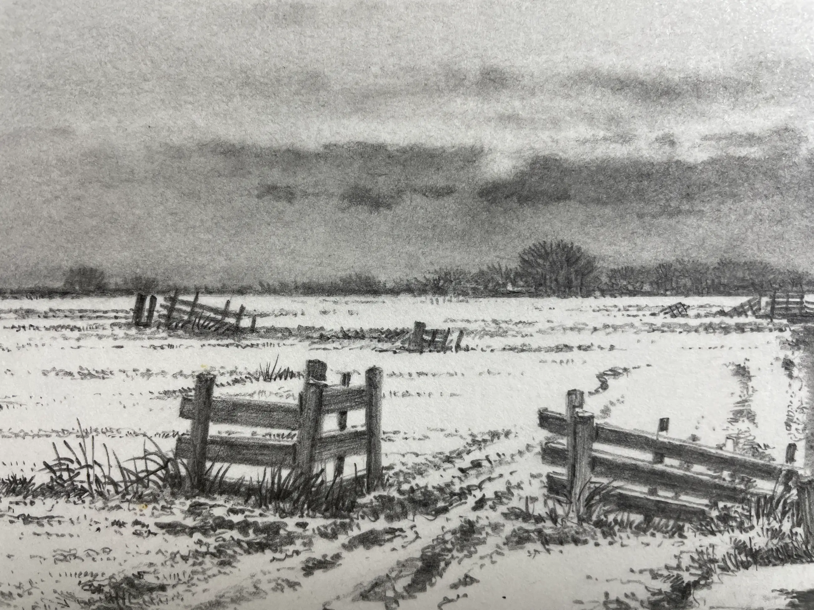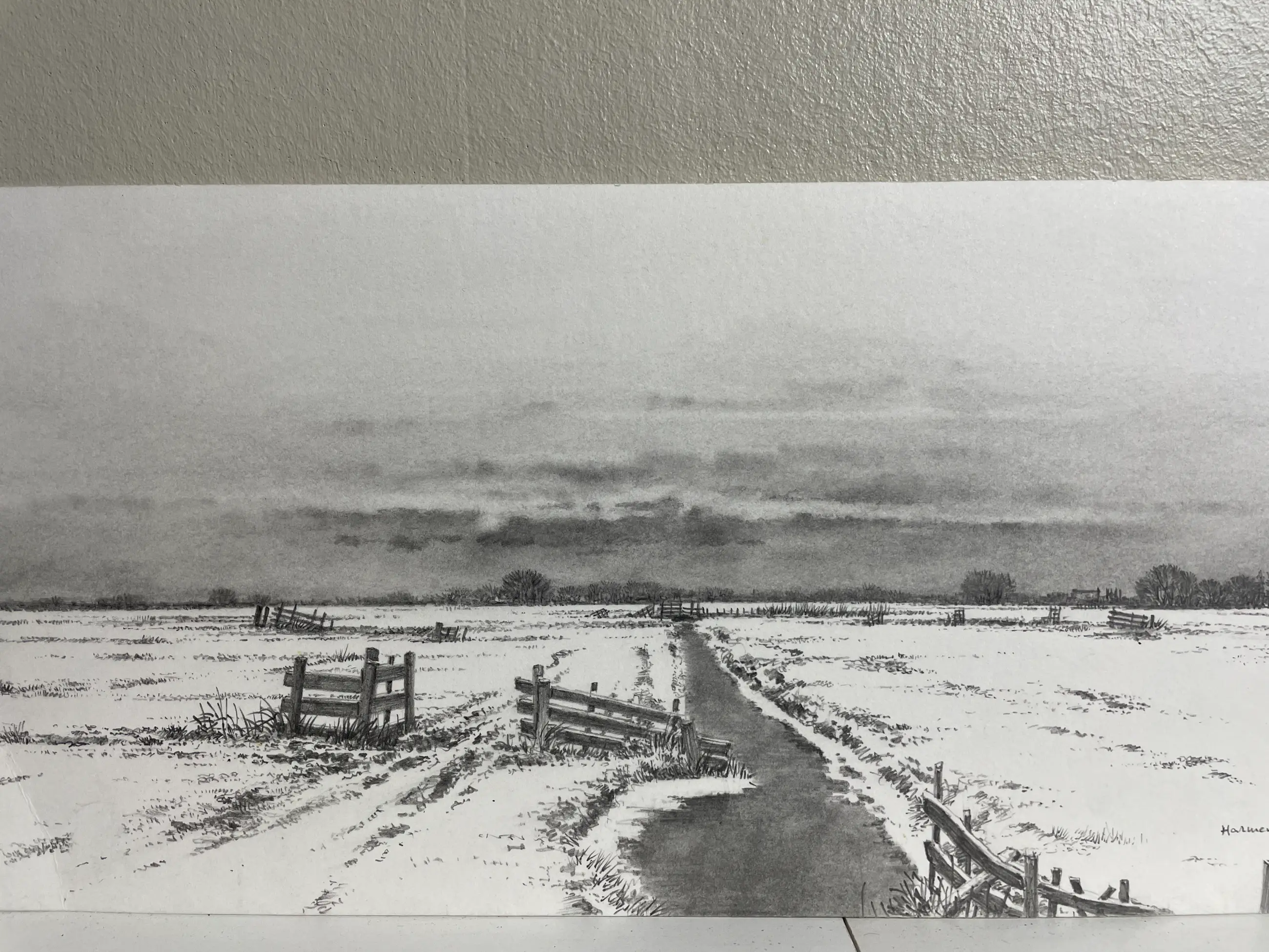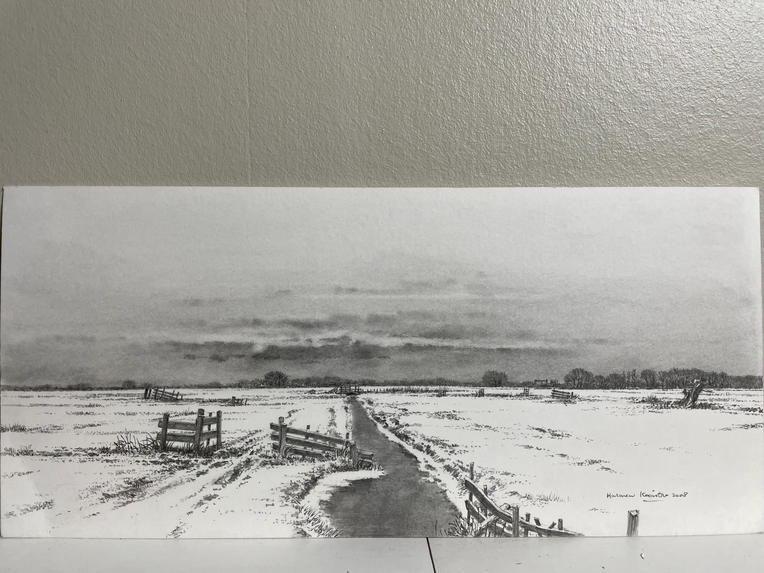 Prachtige gedetailleerde pentekening van Harmen Kooistra. Hier zie je het talent. Polder met slot en hekjes 1 stuk