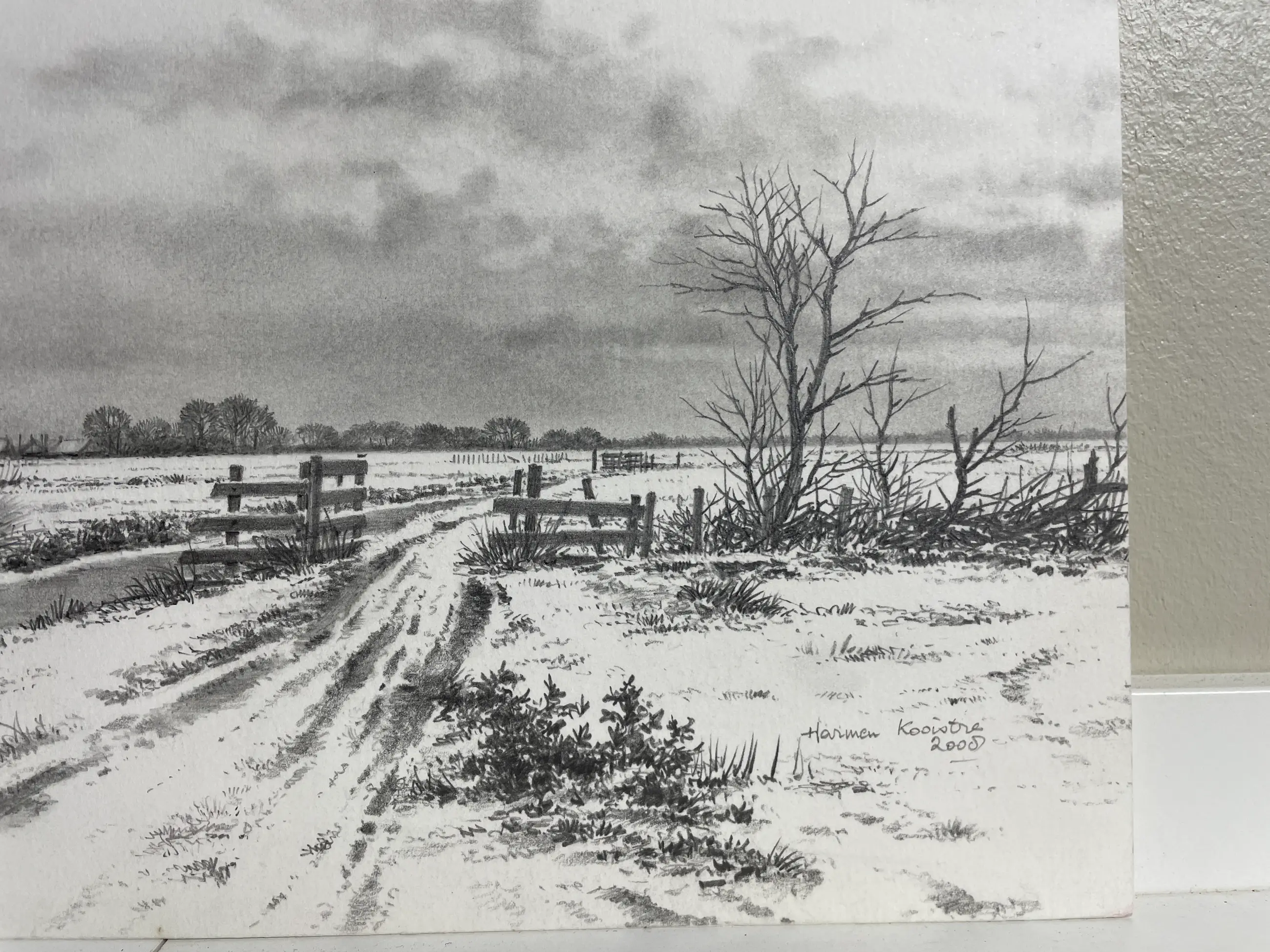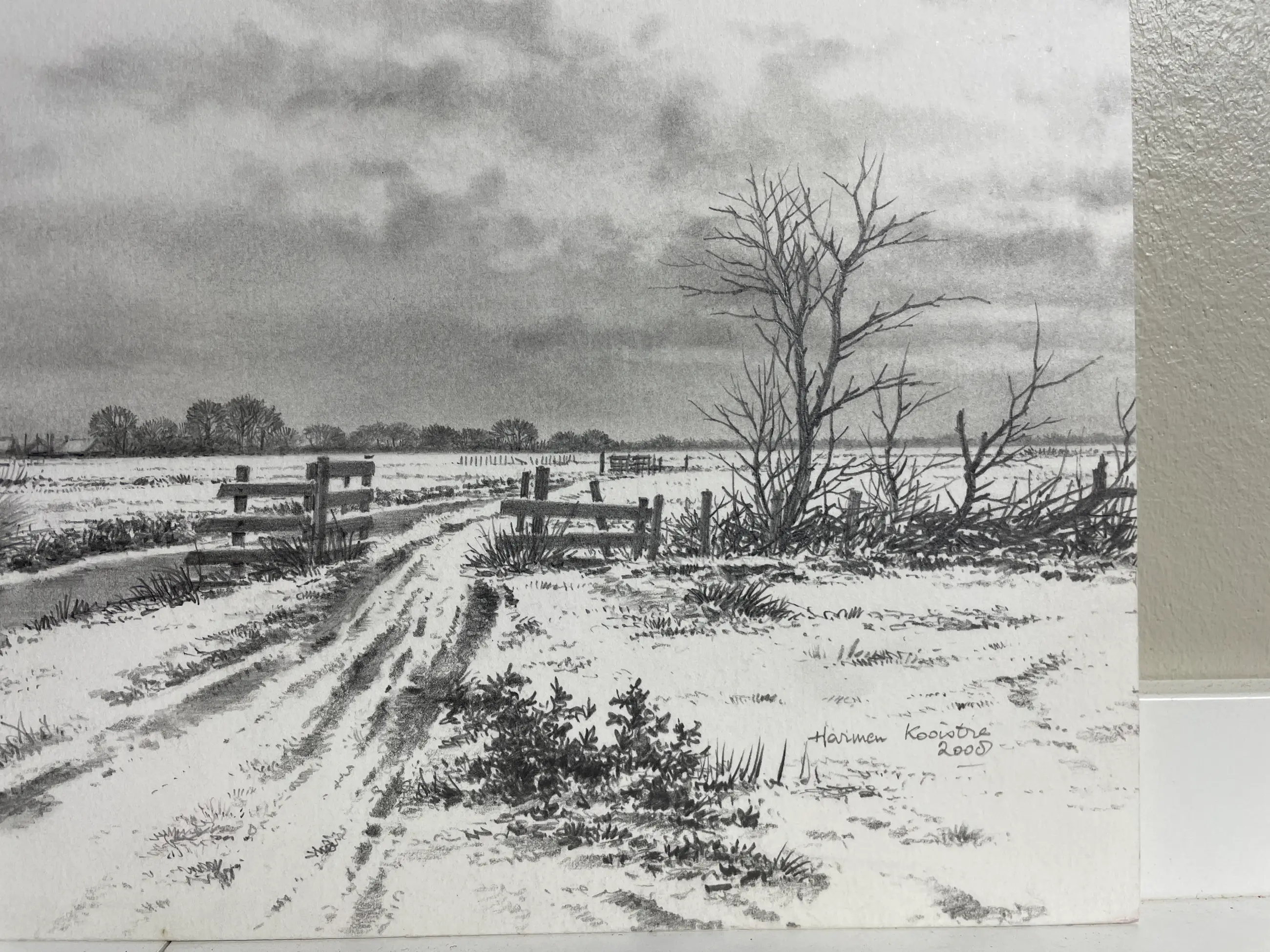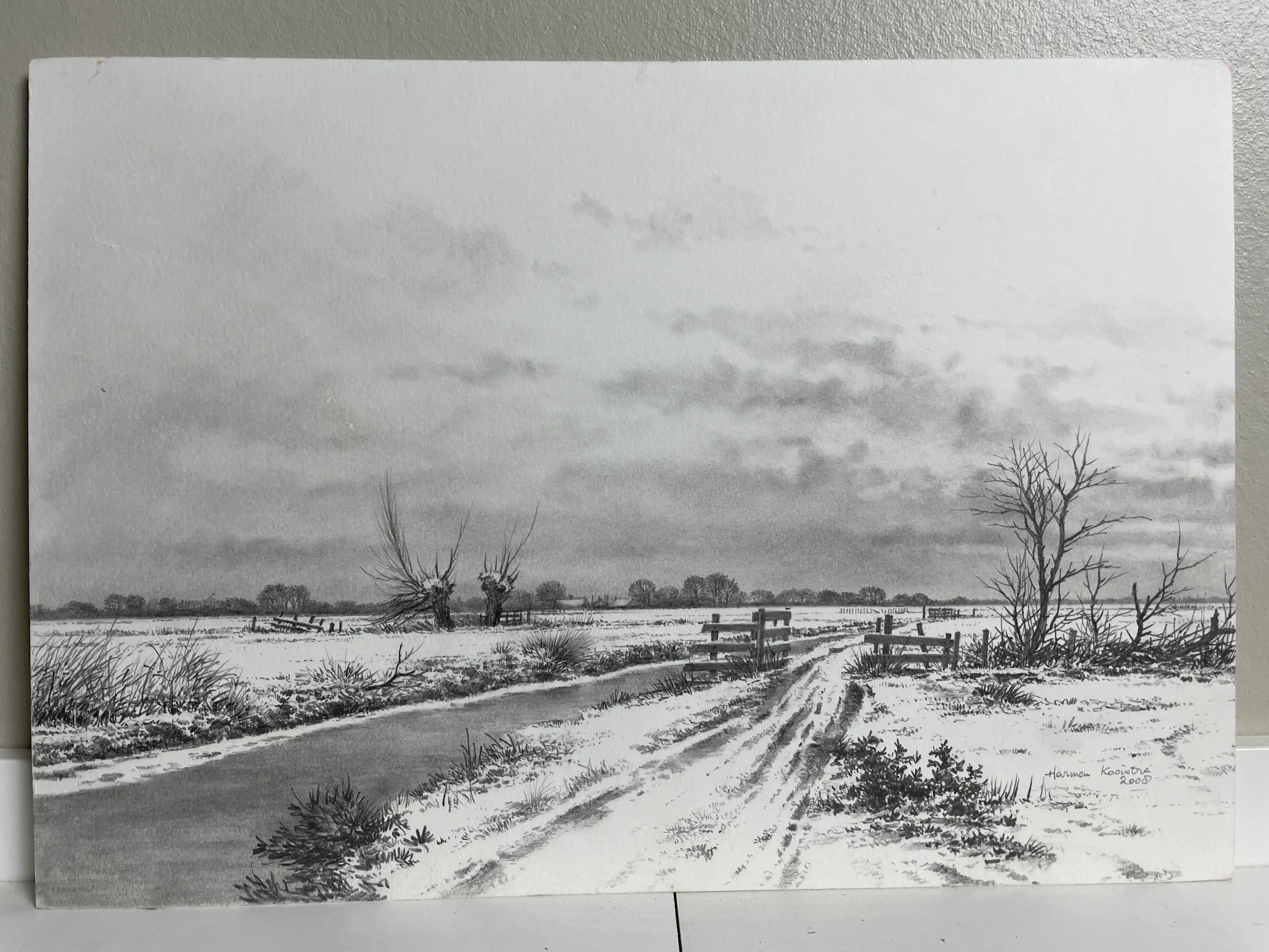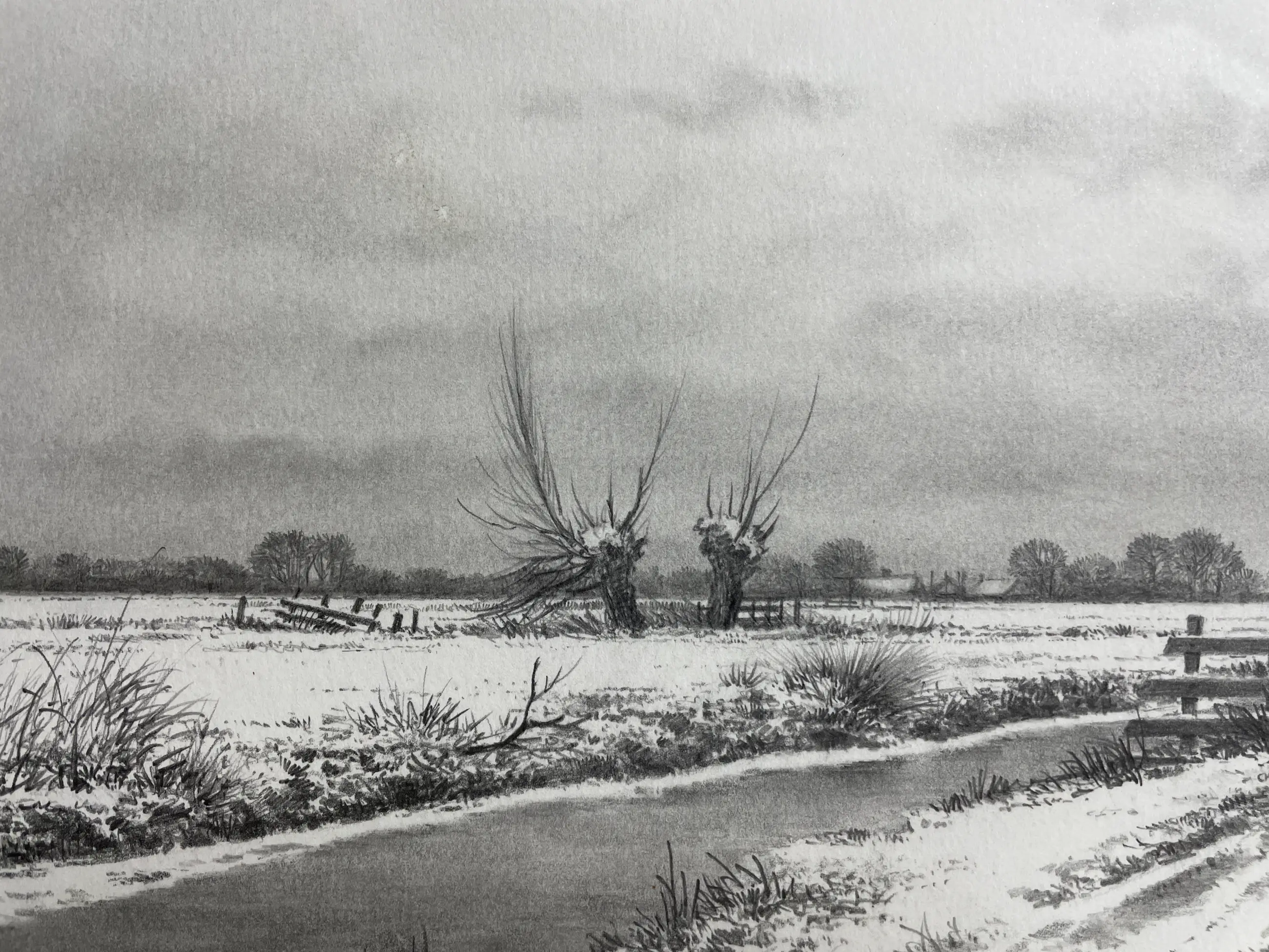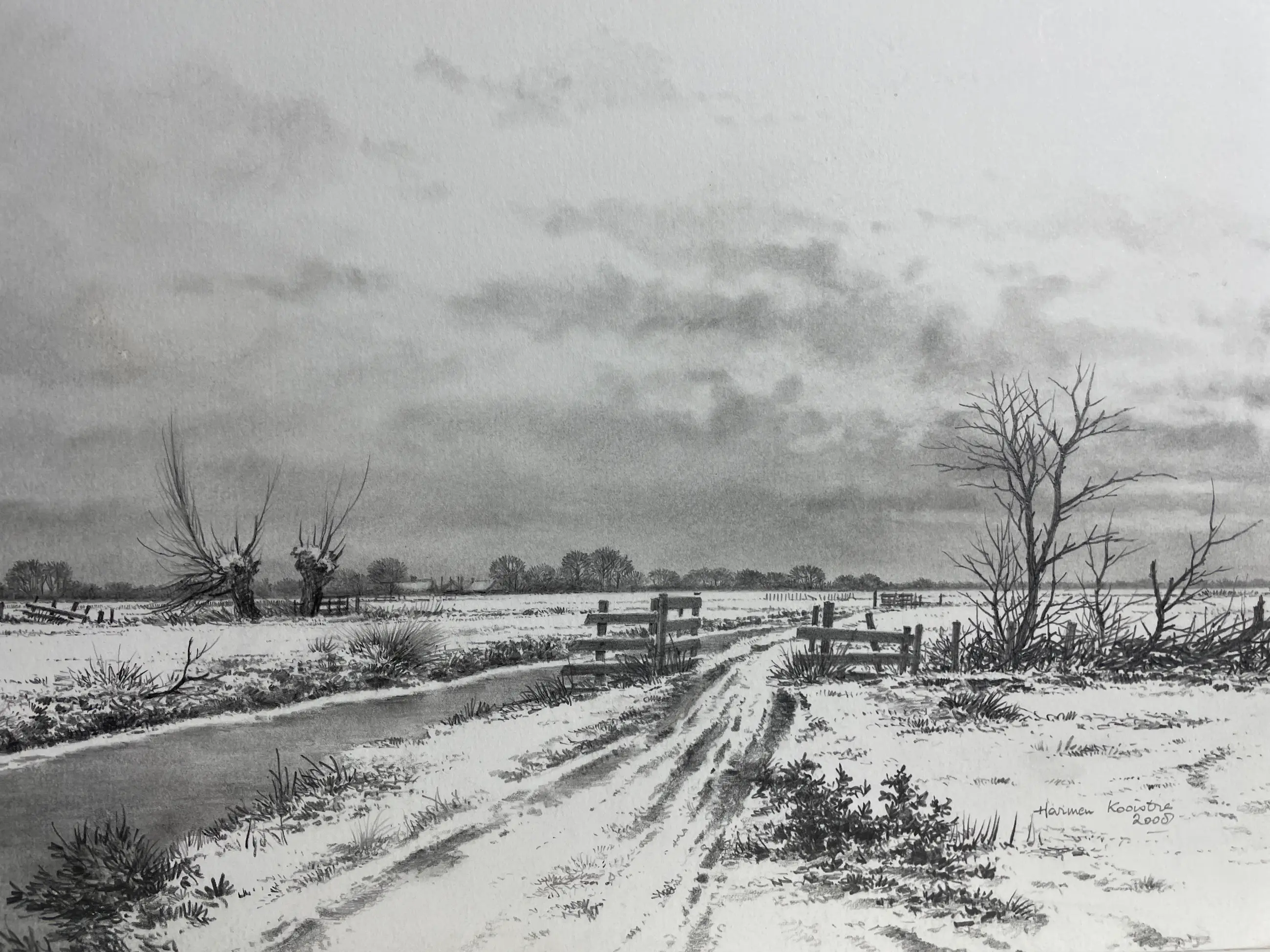 Prachtige pentekening. Specialiteit van Harmen Kooistra Sneeuwlandschap, slootje, knotwilgen