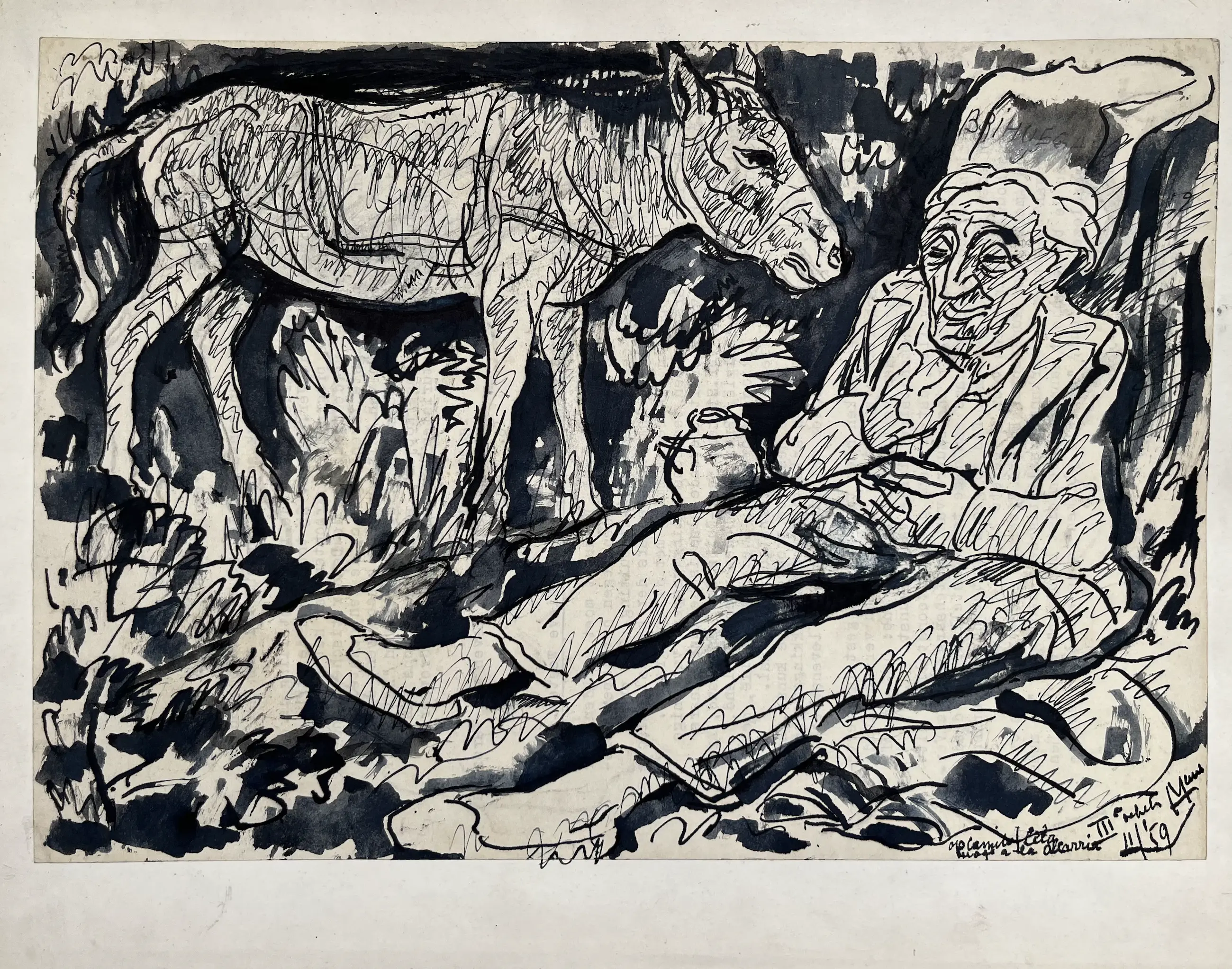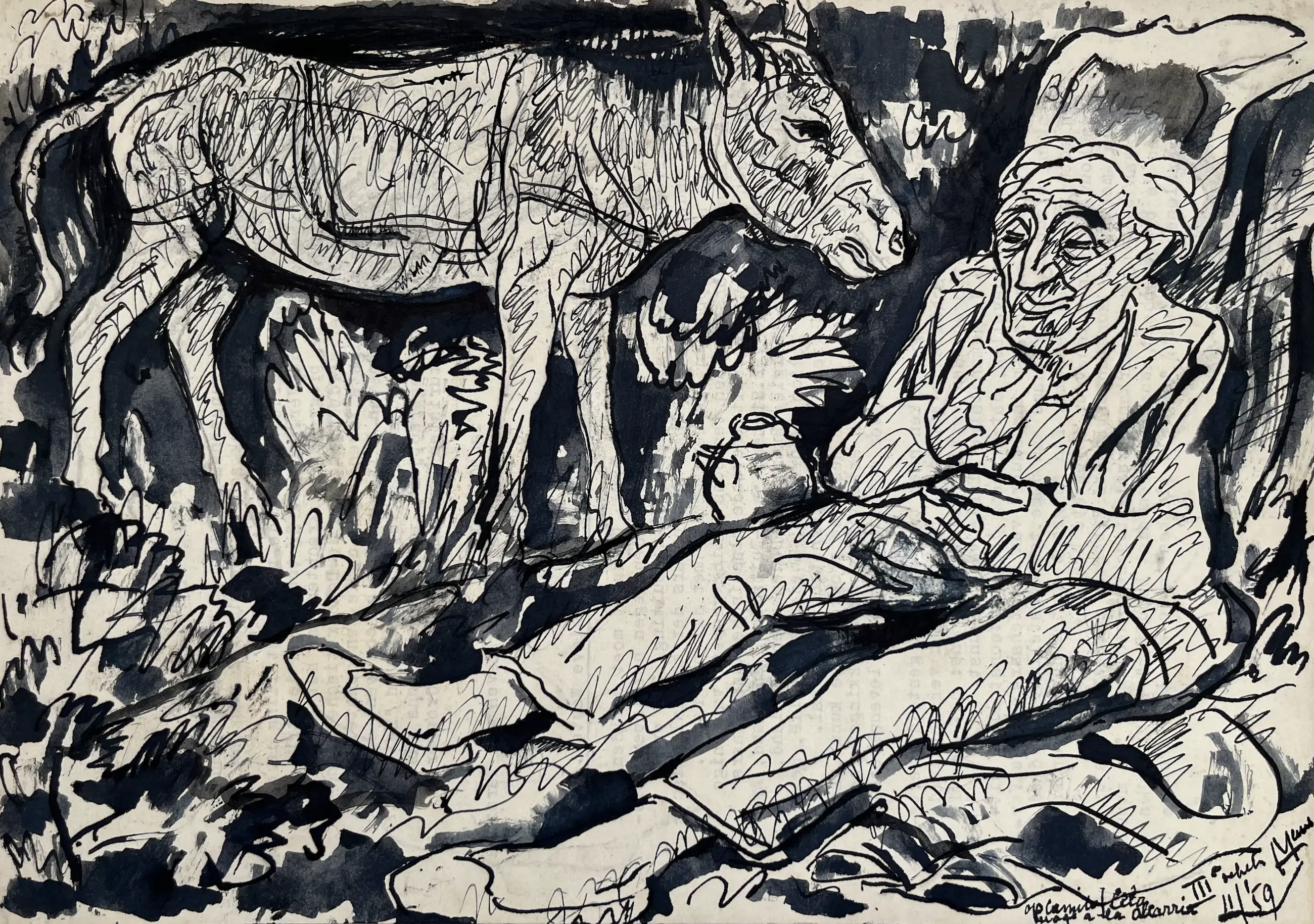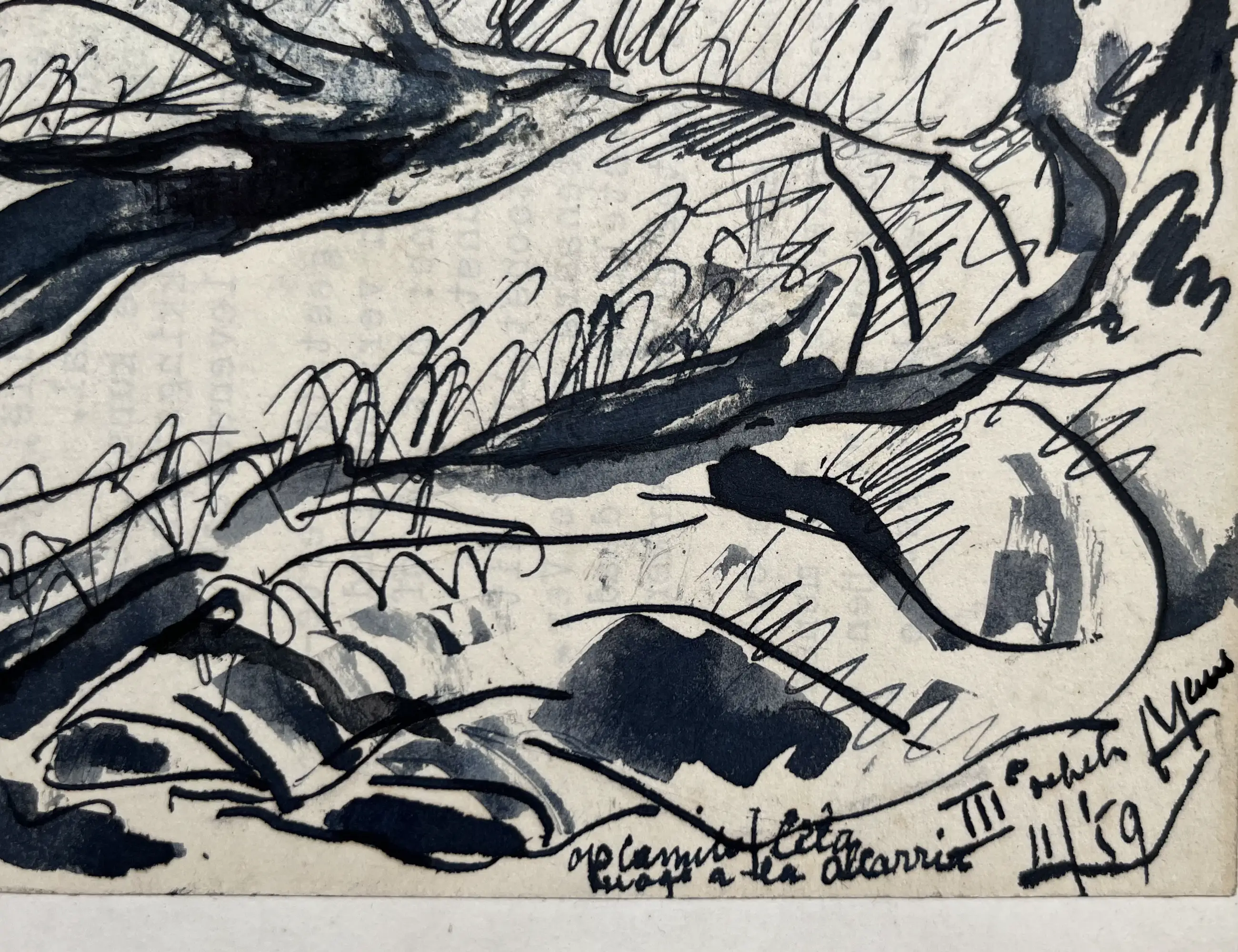 Pen- en penseeltekening tijdens zijn verblijf op Corsica in 1959. Rechtsonder gesigneerd Meurs.