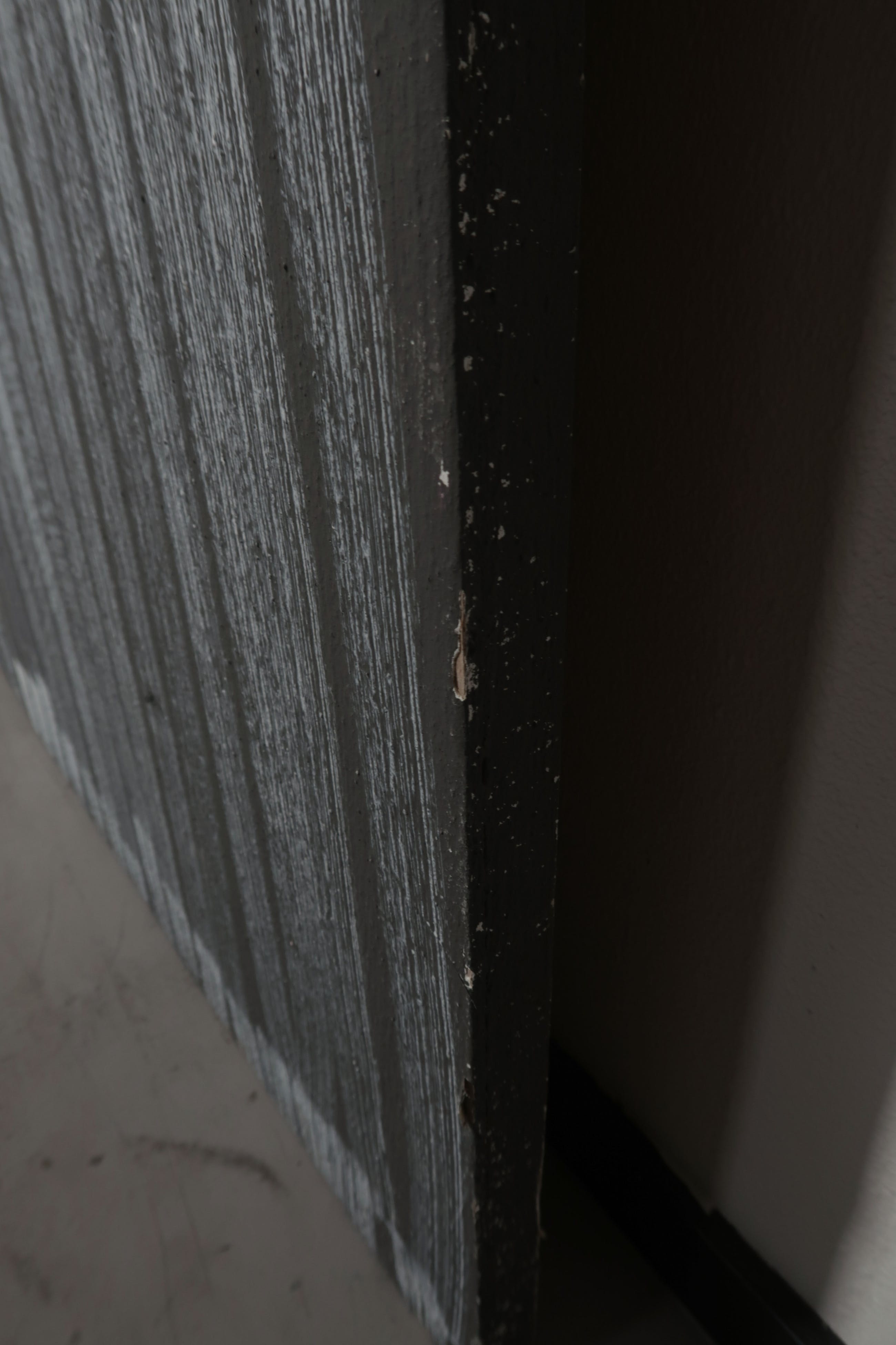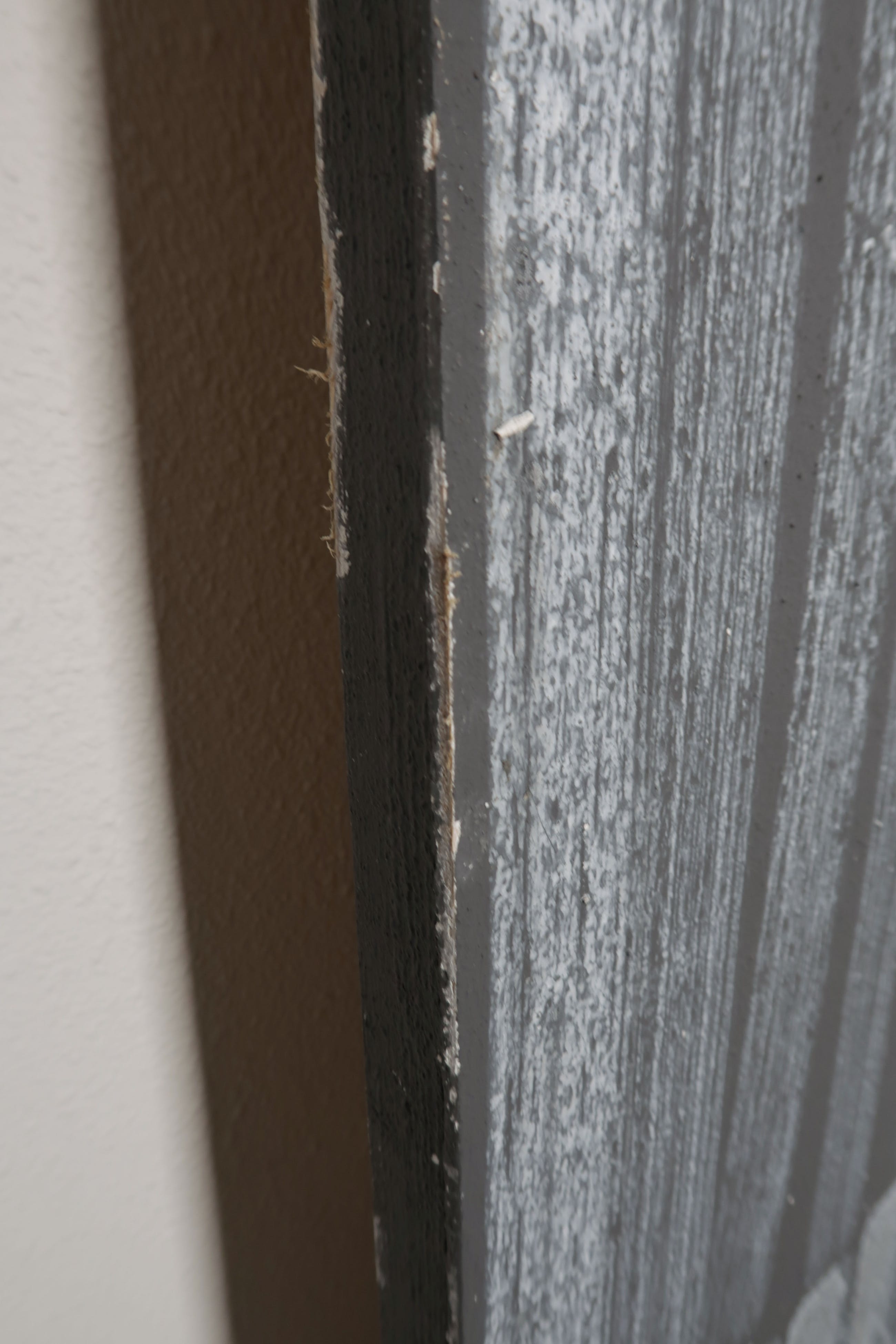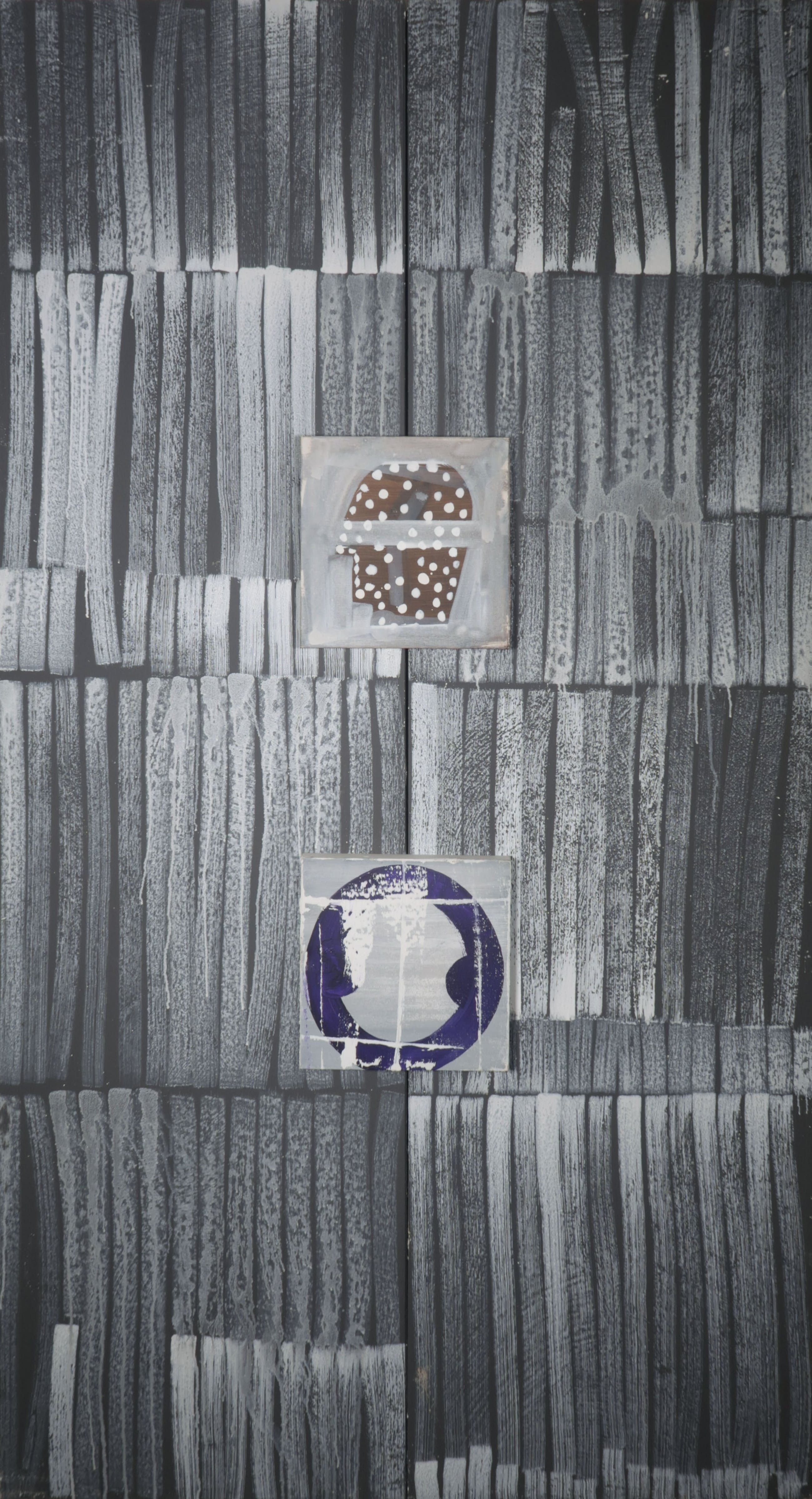 Op het paneel zijn in het midden twee vierkante canvassen op spieraam bevestigd.