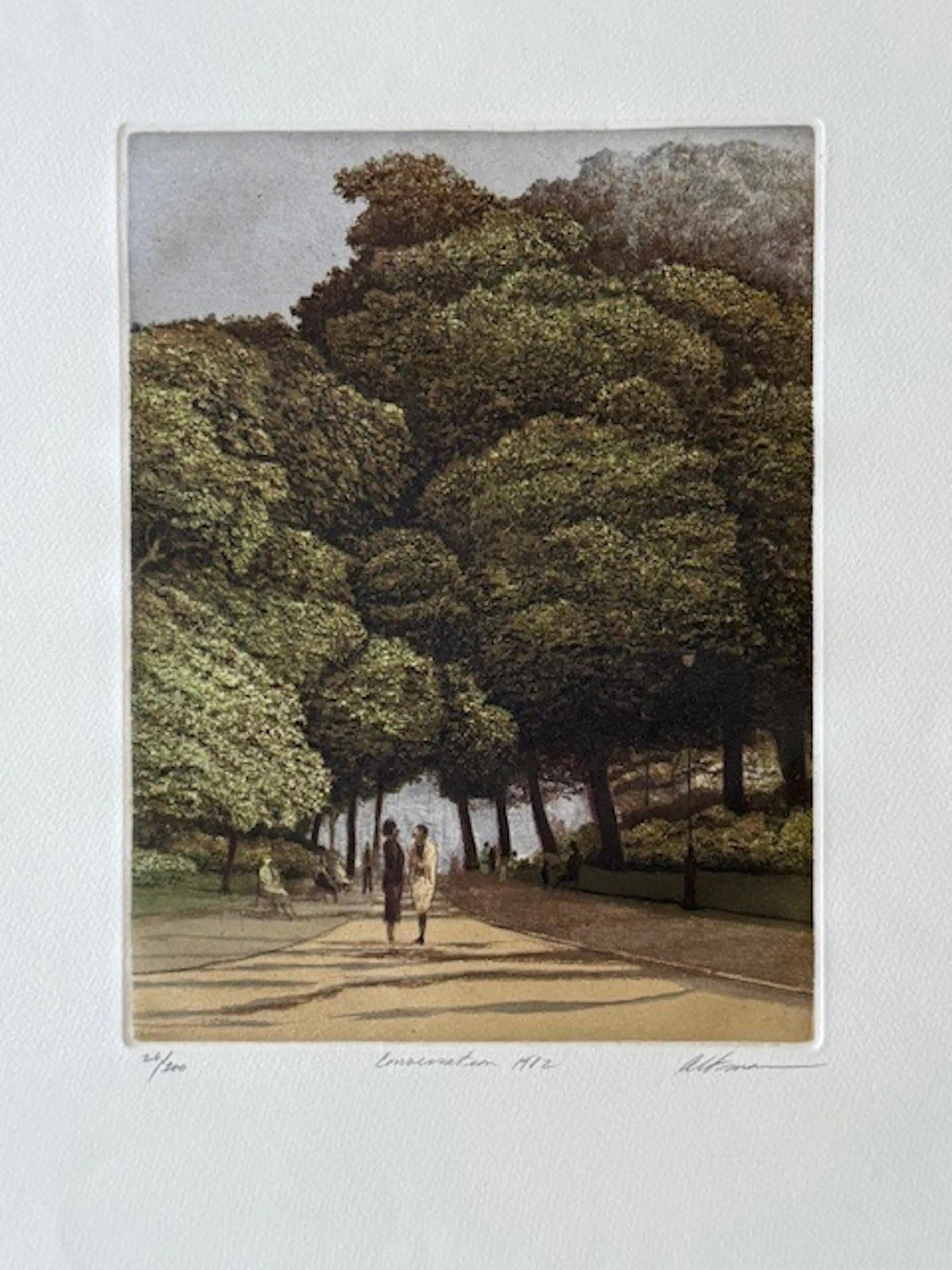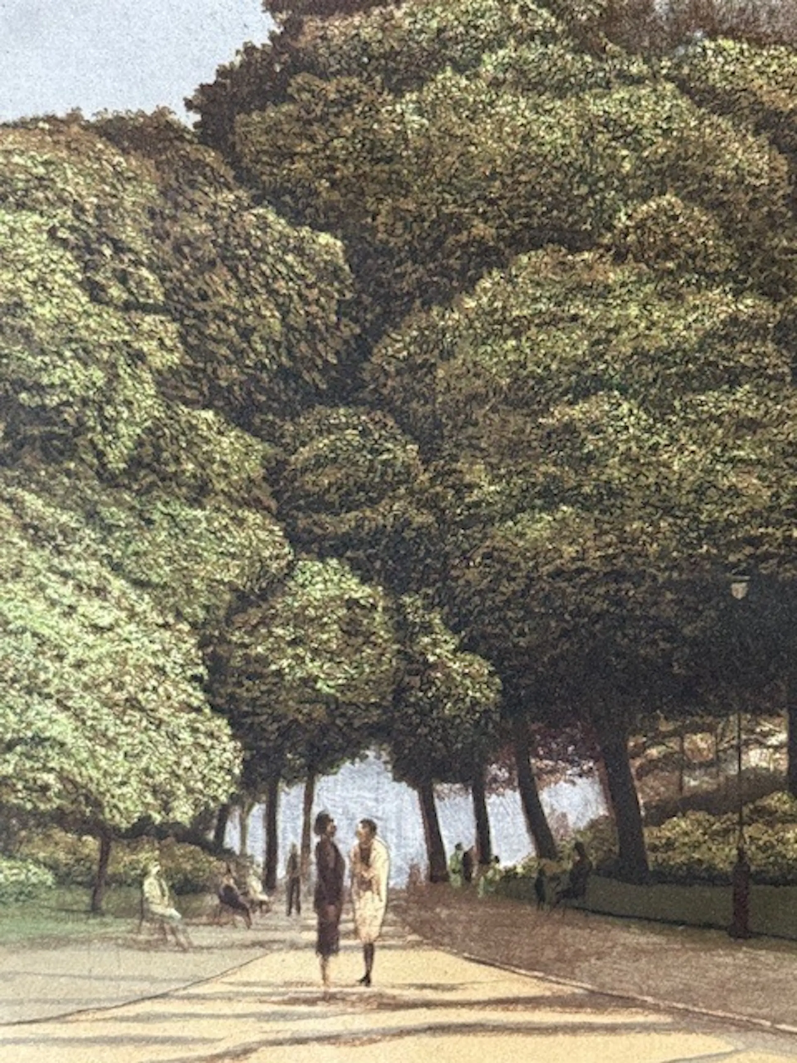 Deze litho toont met zachtheid en een bijna dromerige sfeer twee personages in een park.