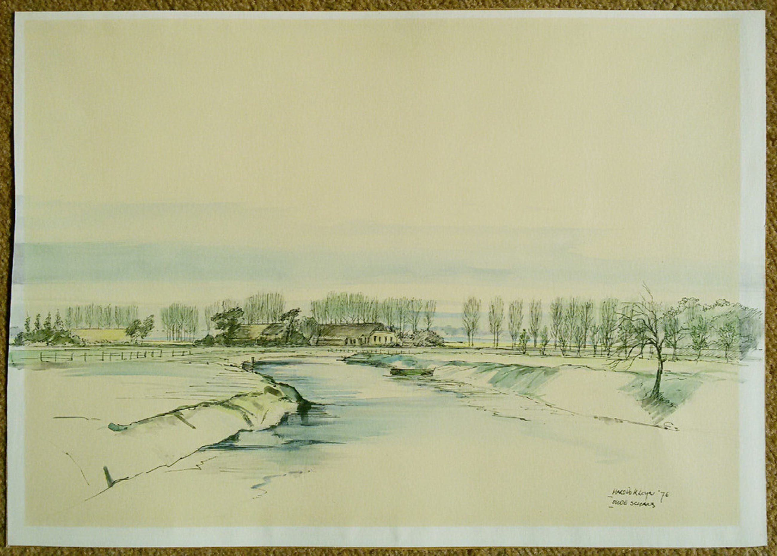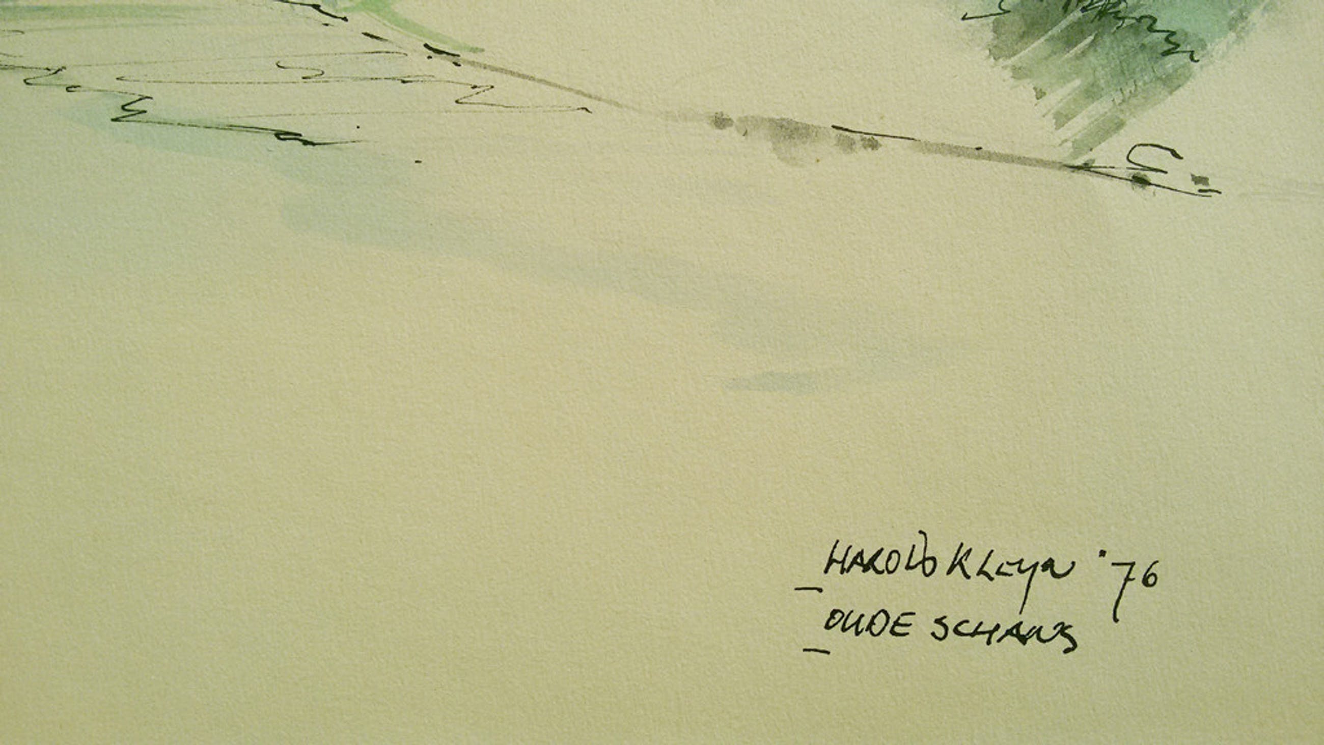 Mooi gezicht op Oudeschans in Oost-Groningen door Harold Kleyn. Pen en waterverf op papier, gesigneerd en gedateerd (‘76) rechtsonder. Afkomstig uit de kunstcollectie van ABNAMRO, in goede staat. Werk heeft wel ingelijst gezeten want er zitten nog taperesten aan de achterkant en het beeld is uniform verkleurd (goed ingelijst met passe-partout zeker niet storend).
