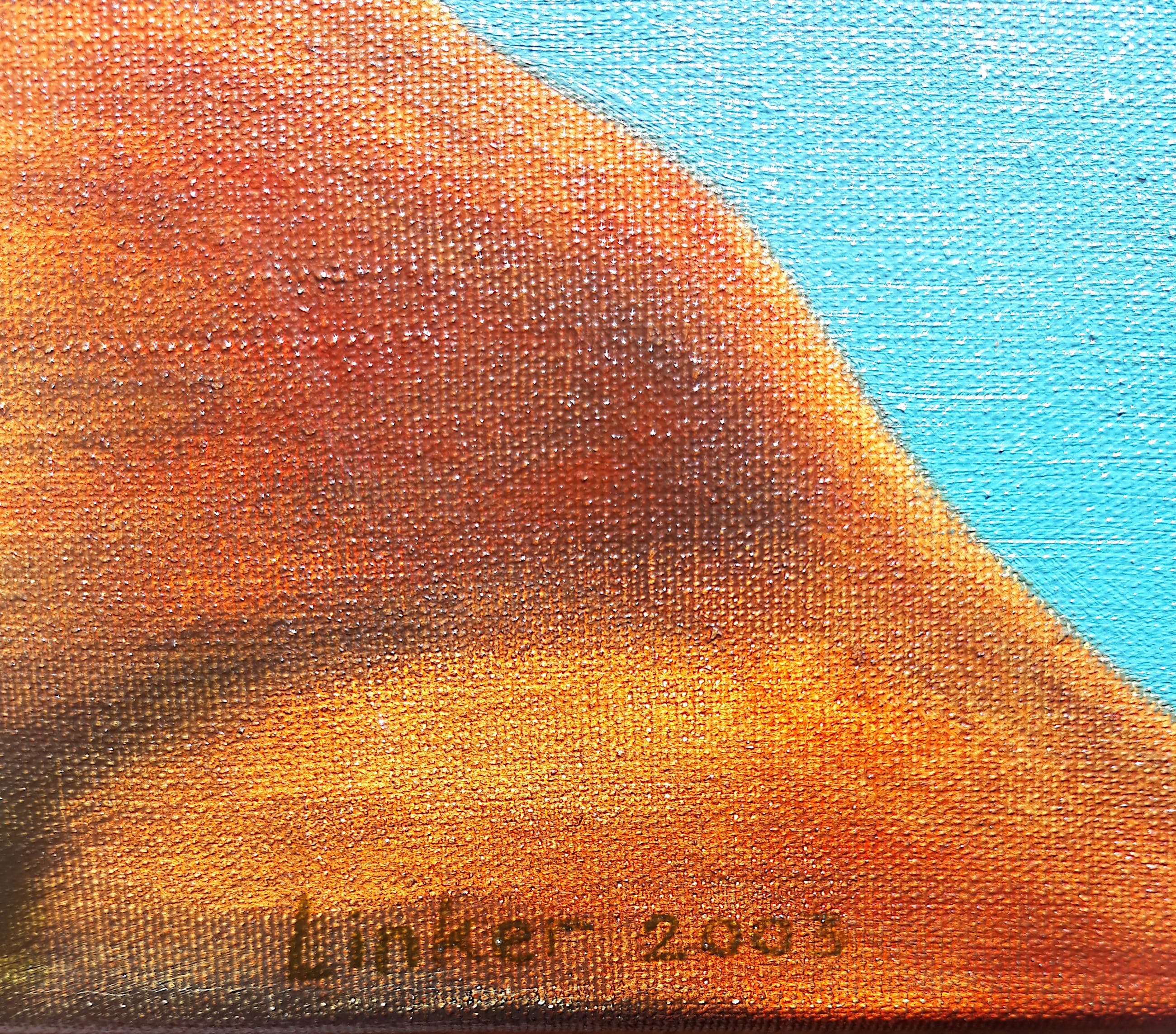 Olieverf op doek, gesigneerd en gedateerd (2003) linksmidden, in verso o.a. getiteld en nogmaals gedateerd (2001) met stift. Ik weet niet zeker of Linker zelf geschreven heeft op de achterkant dus voor de datering houd ik 2003 aan. In zeer goede conditie, over de rand heen geschilderd dus kan zonder lijst opgehangen worden. Geschatte galeriewaarde rond de 4000 euro.