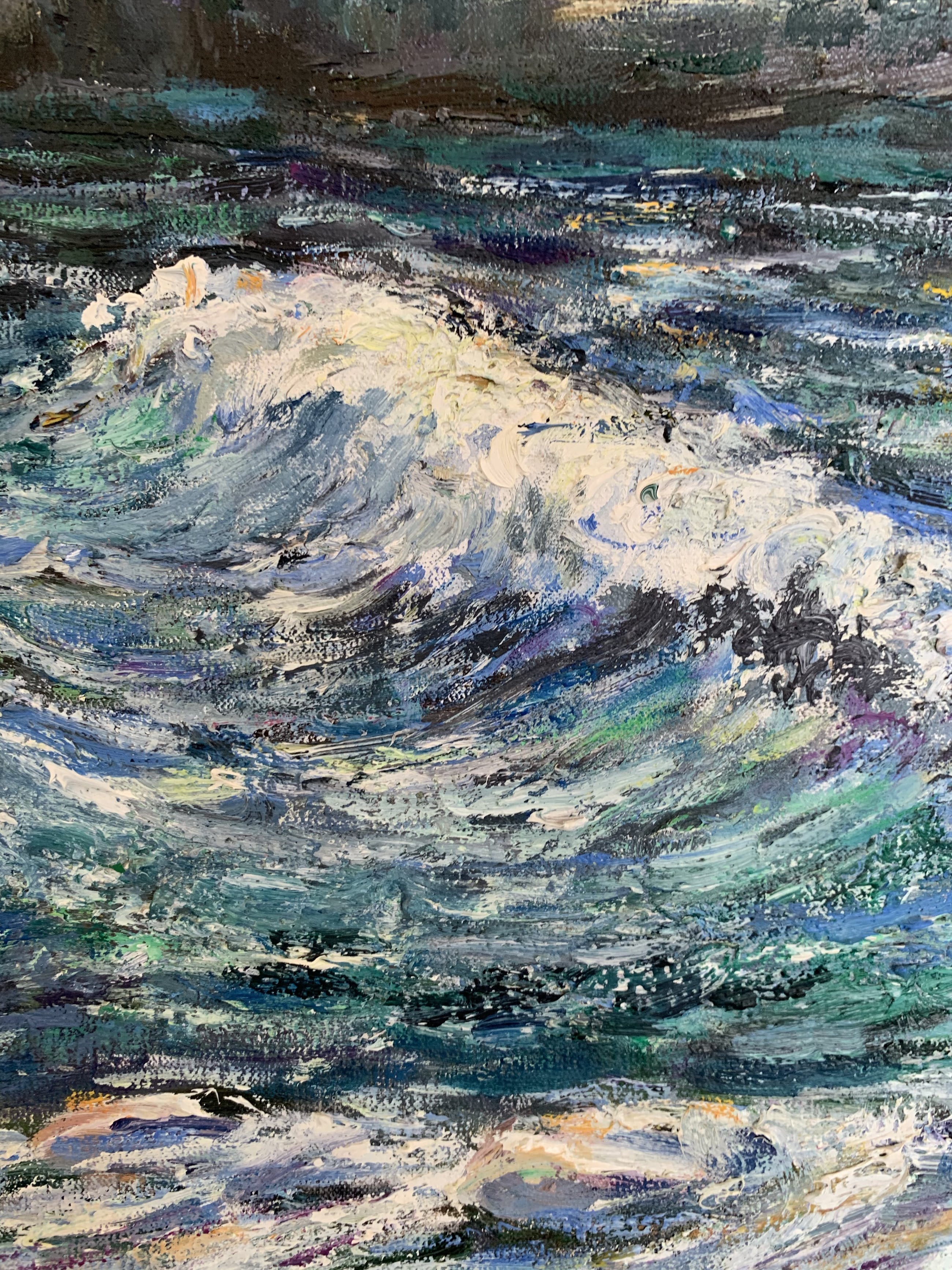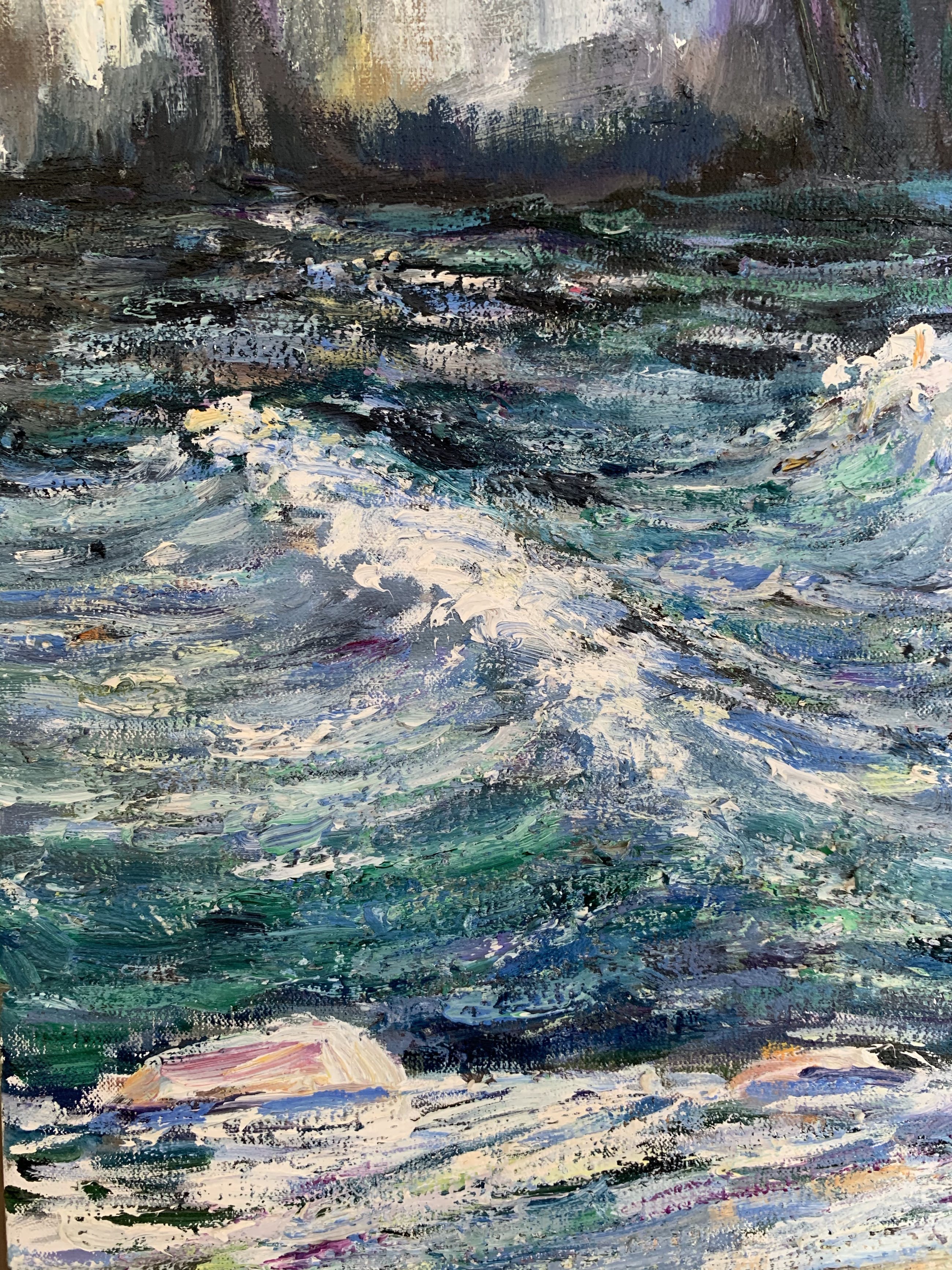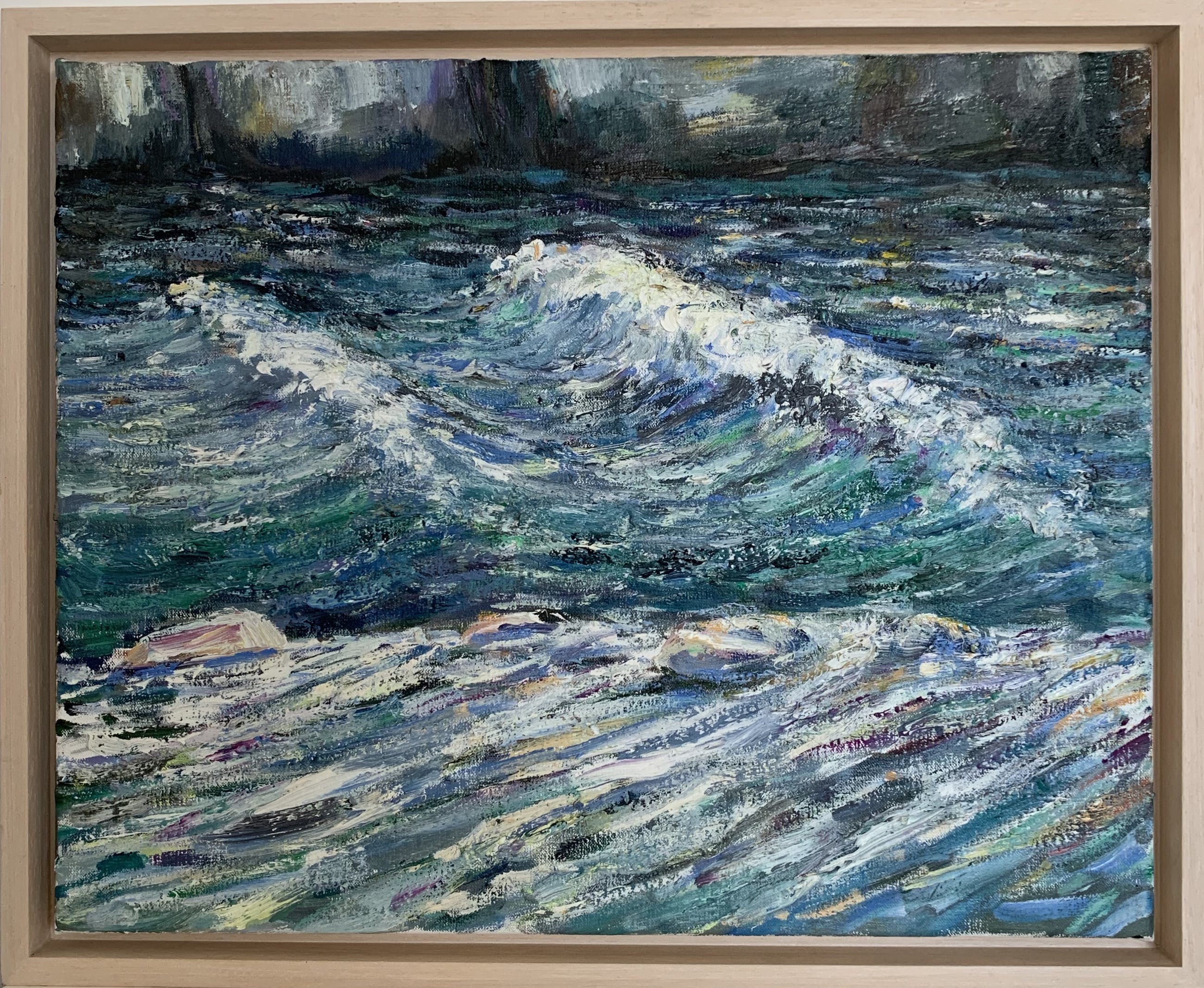 Woeste golven met schuimkoppen. Aan de bovenzijde donkere stenen. De verf is dik aangebracht waardoor er een dieptewerking ontstaat.Verso signatuur: Harold Schouten '02 + titel en op de rand van het doek: HS '02