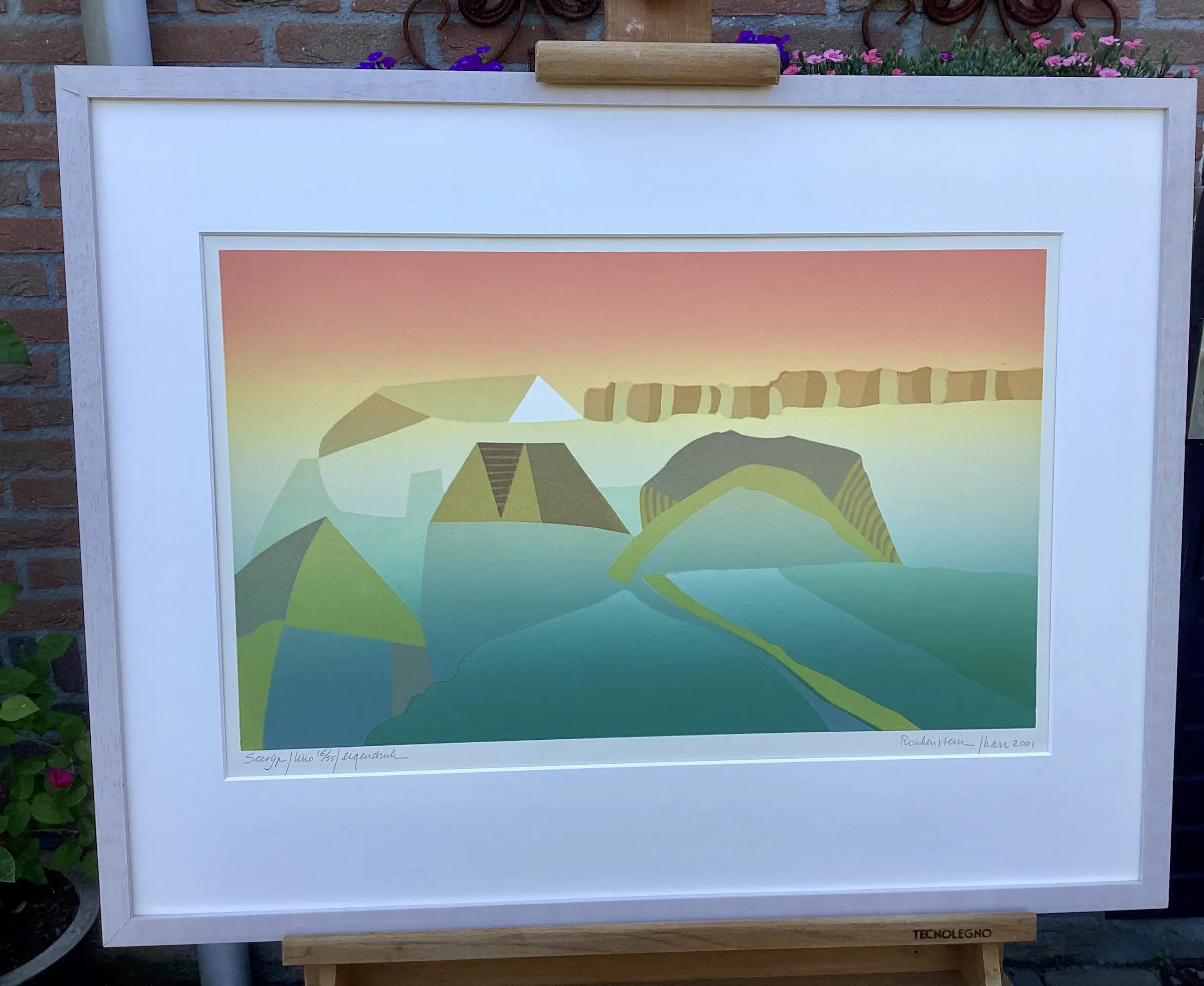 Harr Scheffer (1937-2016) Geboren te Venlo Opleiding aan de academie van 1951-1961 op grafische school te Roermond. Lid van kunstkring Kyra Veel van zijn werken werden gemaakt op Landgoed Ronkenstein - Reuver - Limburg. Gebruik van pastelkleuren die zijn geheel eigenstijl van vormgeven. Prachtige landschappen in een moderne jas. Dit schilderij heeft een mooie krijtwitachtige lijst. Kavel wordt verzonden maar zonder glasplaat.Dit ivm schade tijdens bezorging. Haalt u het werk zelf op dan wordt de glasplaat natuurlijk meegeleverd.