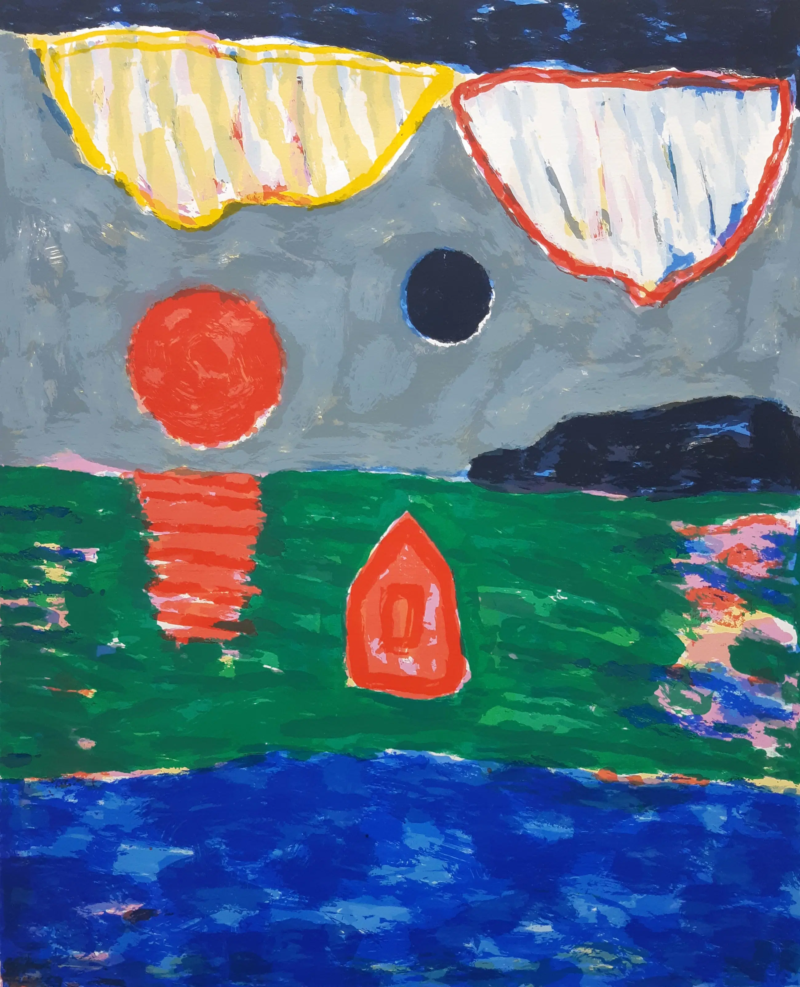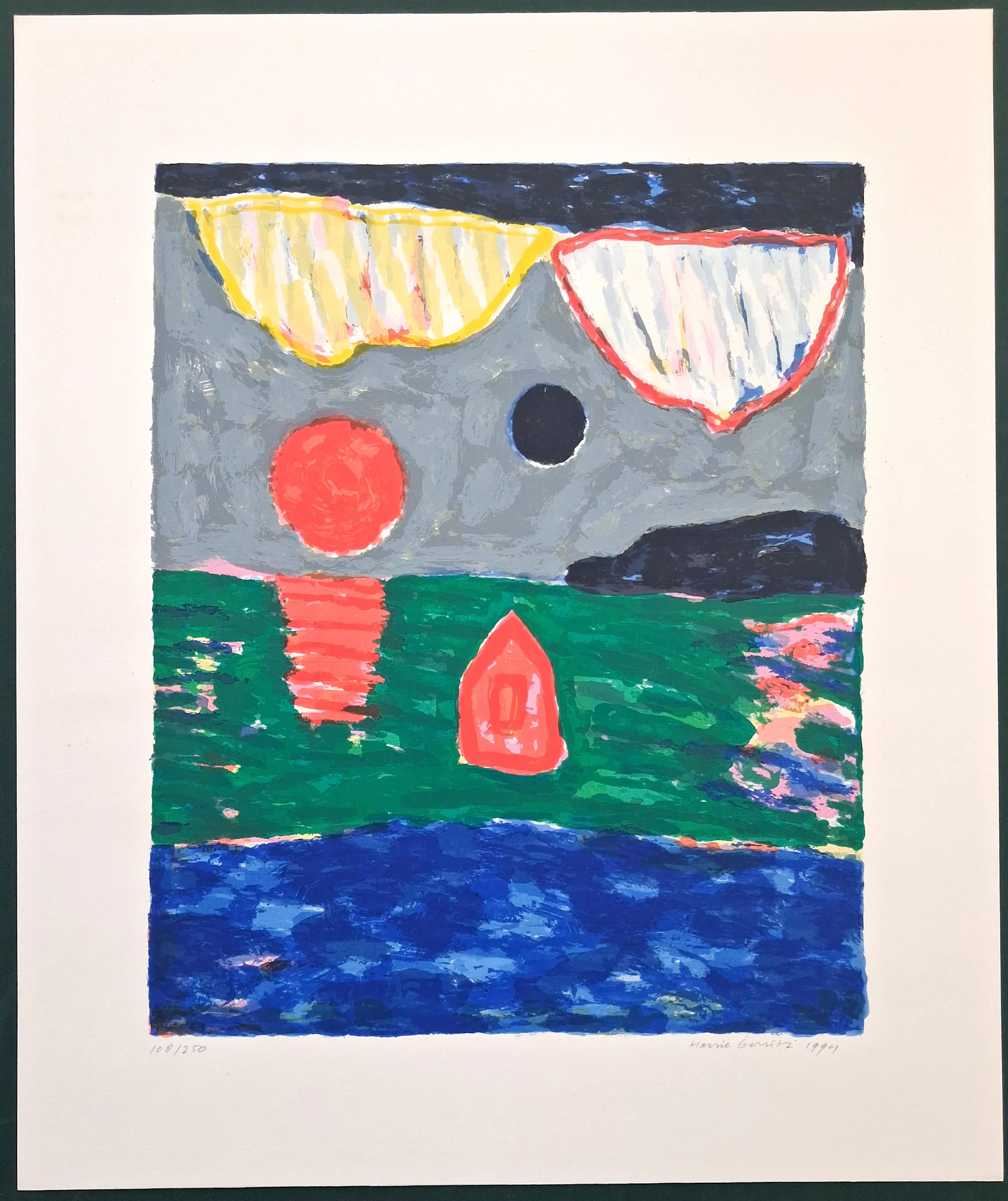 Kleurrijke zeefdruk van Harrie Gerritz, zonder titel. Met potlood door de maker gesigneerd, genummerd en gedateerd. De afbeelding meet 44 x 36 cm. De conditie is zeer goed, wat vlekken op de achterkant.
