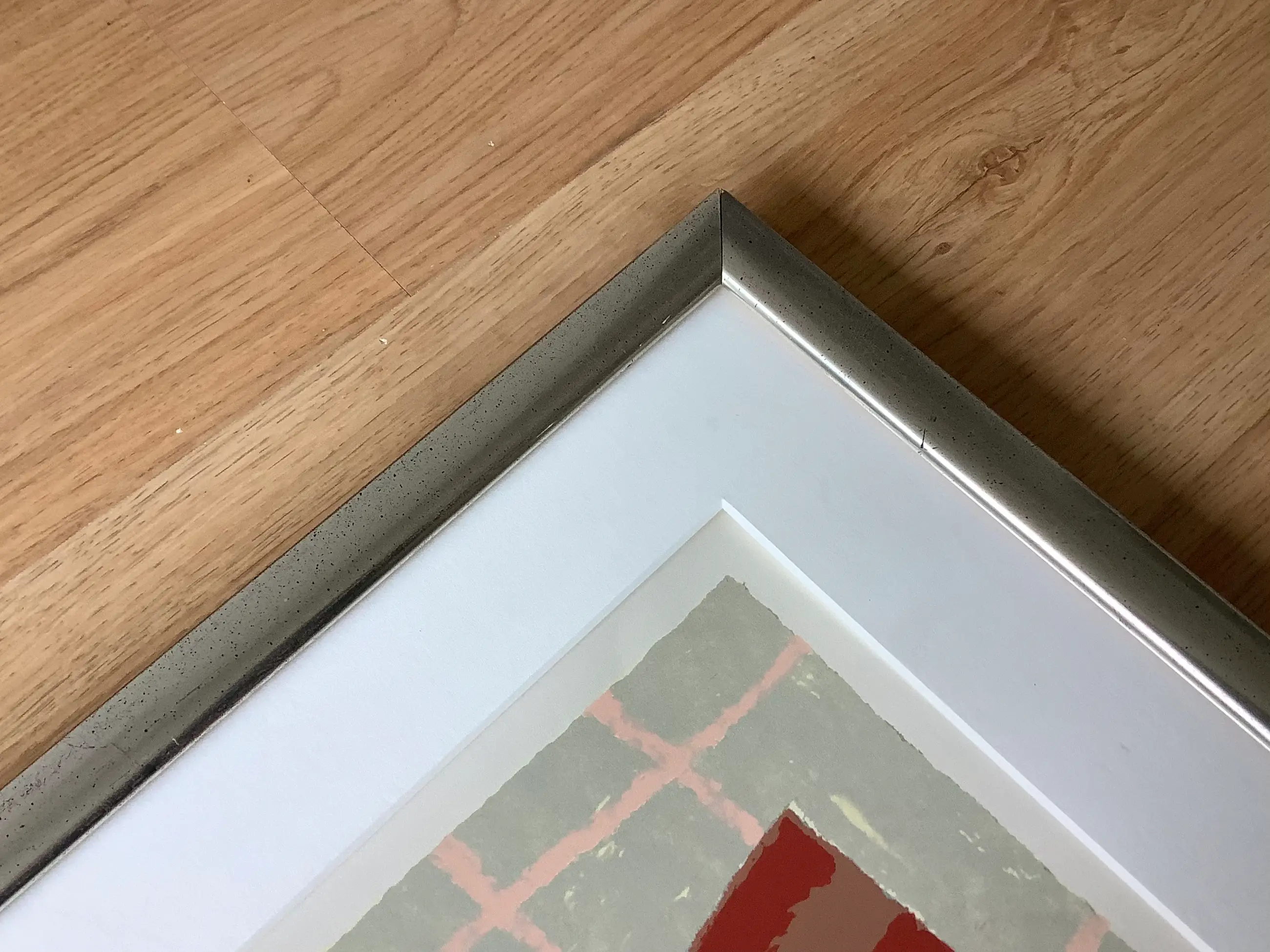 Deze zeefdruk is ingelijst in een houten zilveren lijst. De lijst is 2,5 cm breed en 1,5 cm hoog, de lijst heeft enige gebruikersschade zie foto’s.