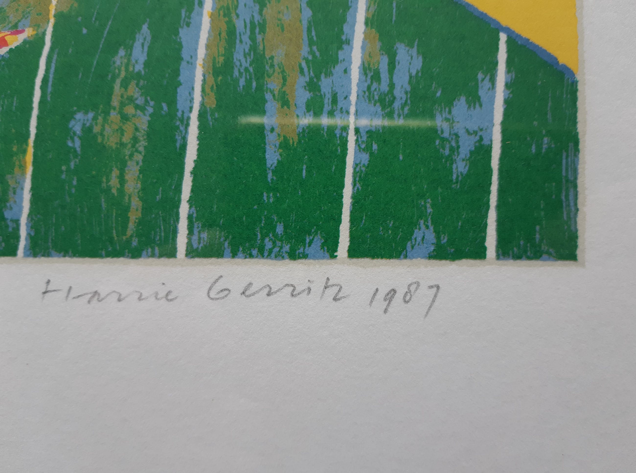 Zeefdruk van Harry Gerritz, door de maker gesigneerd en gedateerd. De zeefdruk is niet ingelijst. De afbeelding is 48 x 36 cm groot en in uitstekende conditie. De uiterste rand van het blad is nauwelijks zichtbaar vergeeld door eerdere inlijsting. Dit valt weg bij opnieuw inlijsten. Zie laatste foto.