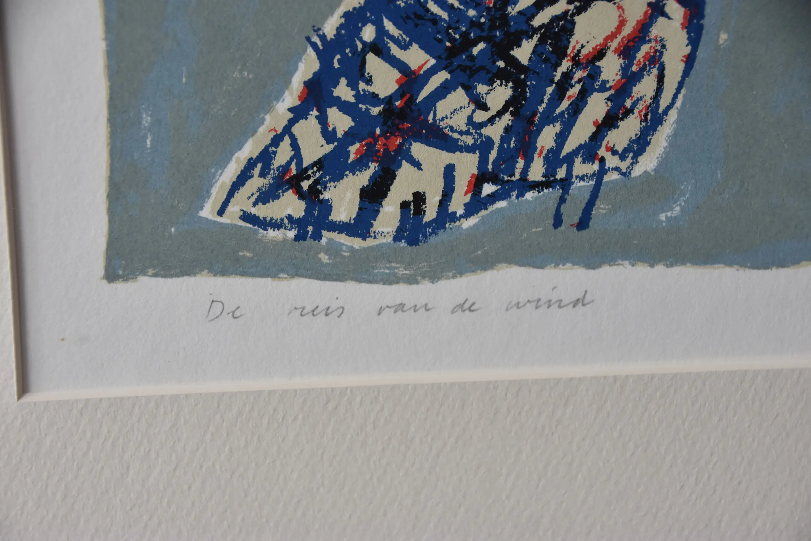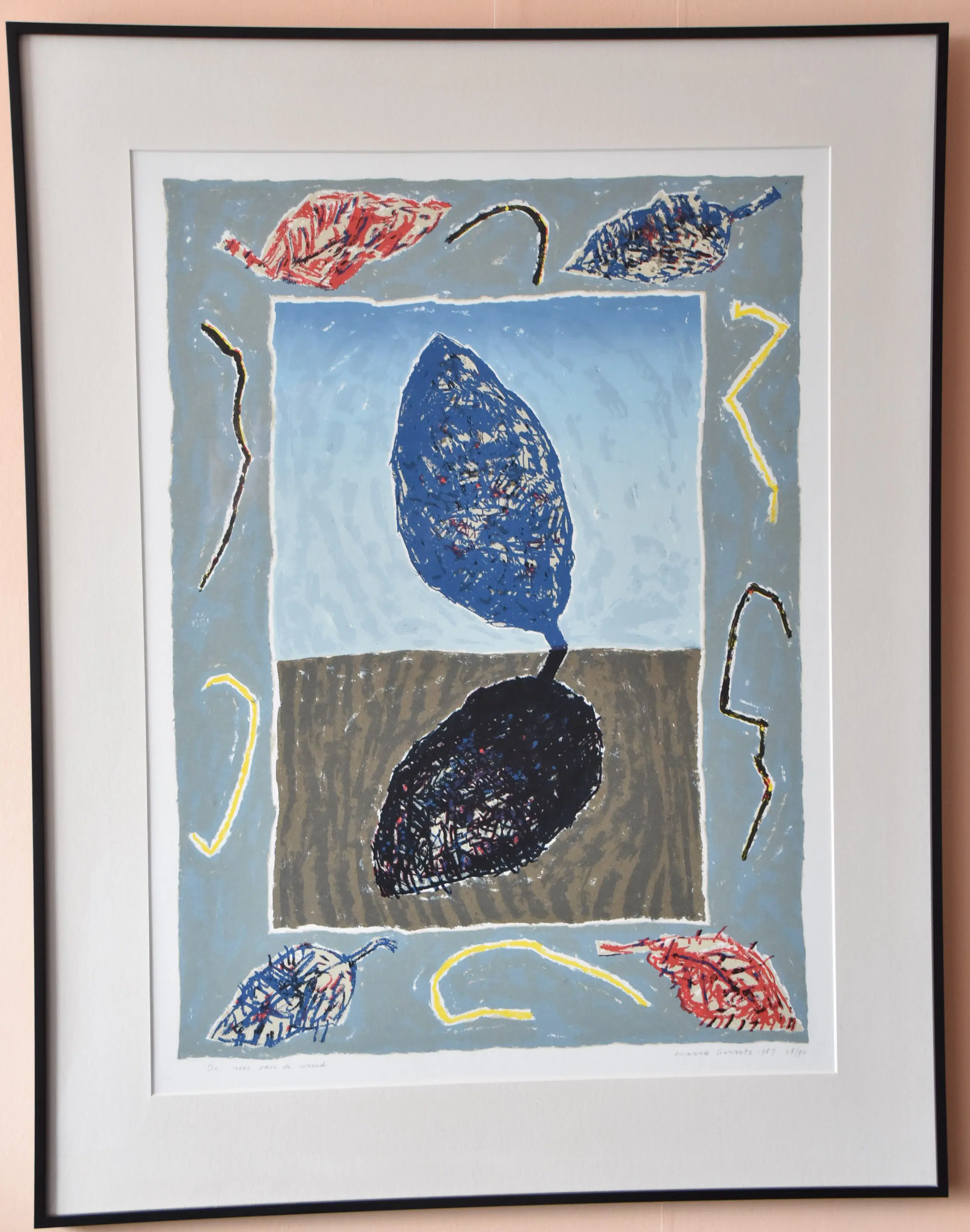 Expressionistisch abstract landschap met boom, schaduw en horizon. Daaromheen een rand van bladeren en abstracte ornamenten. Beperkt helder kleurenpalet met grijs-blauwe en groen-bruine ondergrond waarin het silhouet van een donkerblauwe boom afsteekt. In de rand felrode en blauwe bladeren met een zwarte toets.