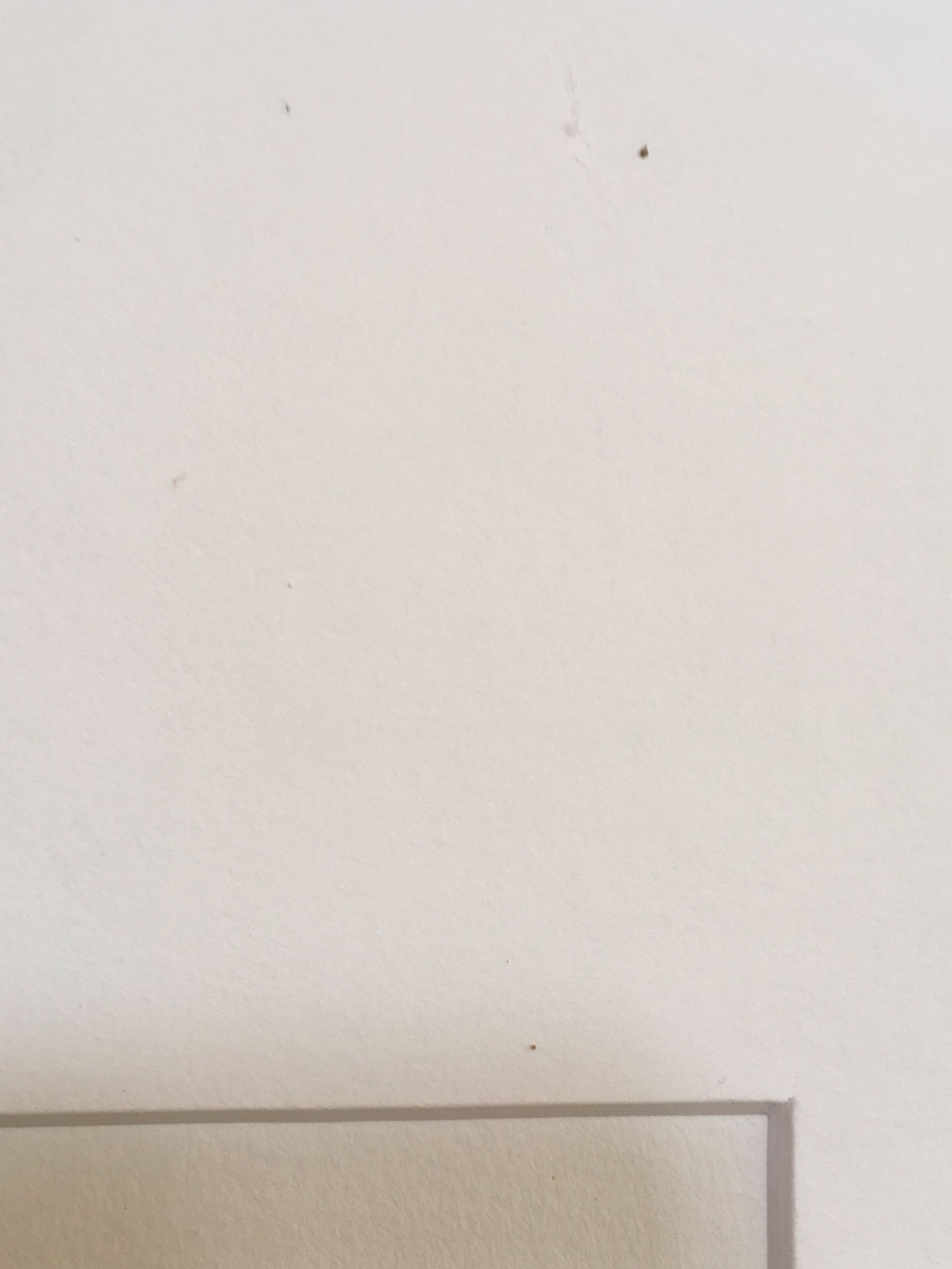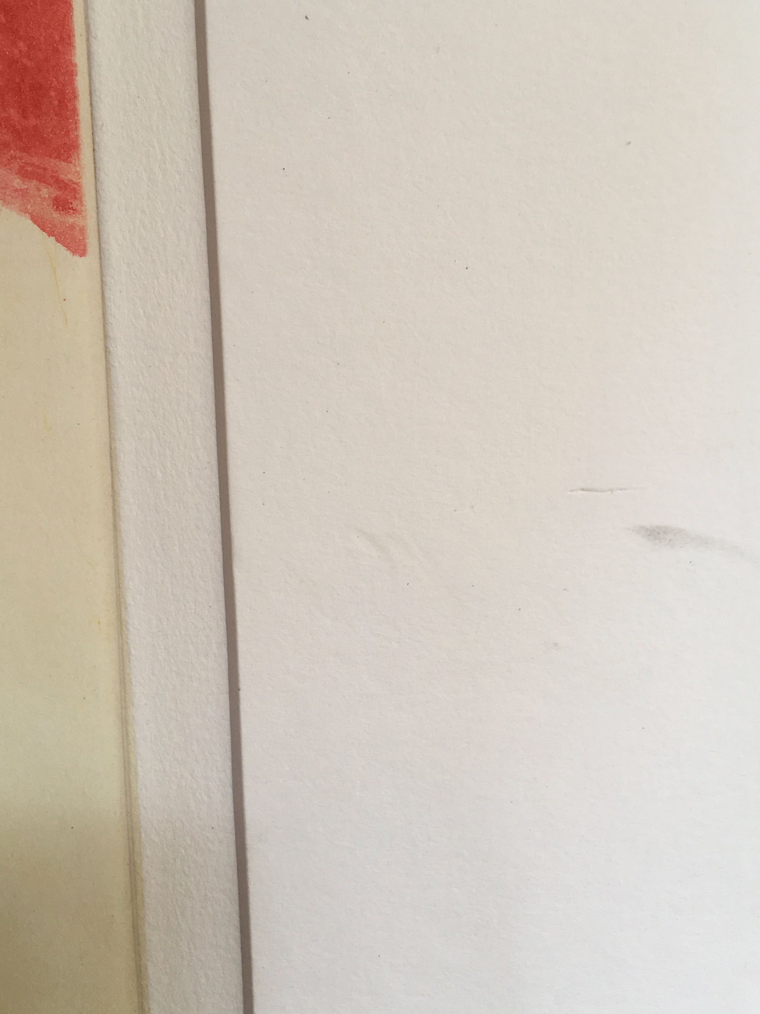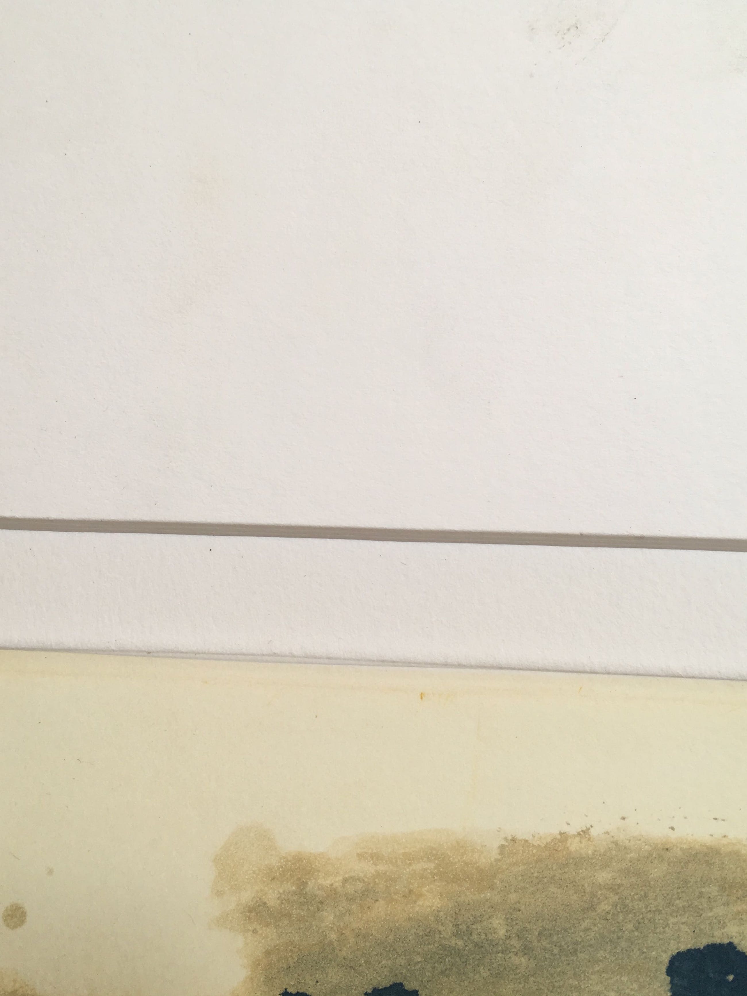 Wil voorkomen dat iemand misschien een oneffenheid ontdekt. Het werk is altijd ingelijst en achter glas bewaard. Passe partout heeft een paar lichte beschadigingen. Kleine lichte veeg en krasje.