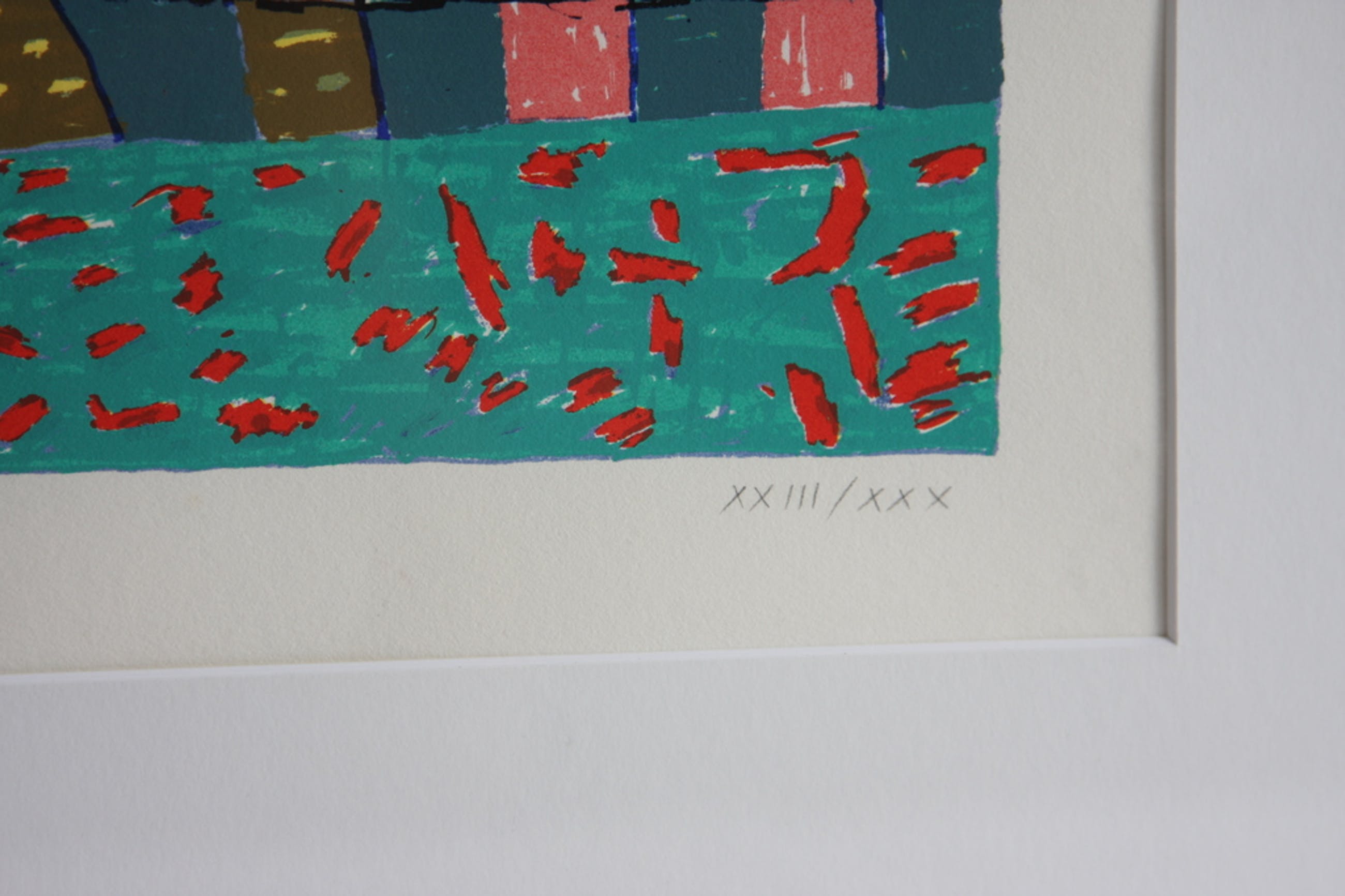 Kleurrijke zeefdruk van Harrie Gerritz. Ingelijst in zwarte, metalen lijst. Met potlood gesigneerd. Dit is nummer 23/30. Afmeting van het beeld is 37x30 cm, de lijst is 62x53 cm.