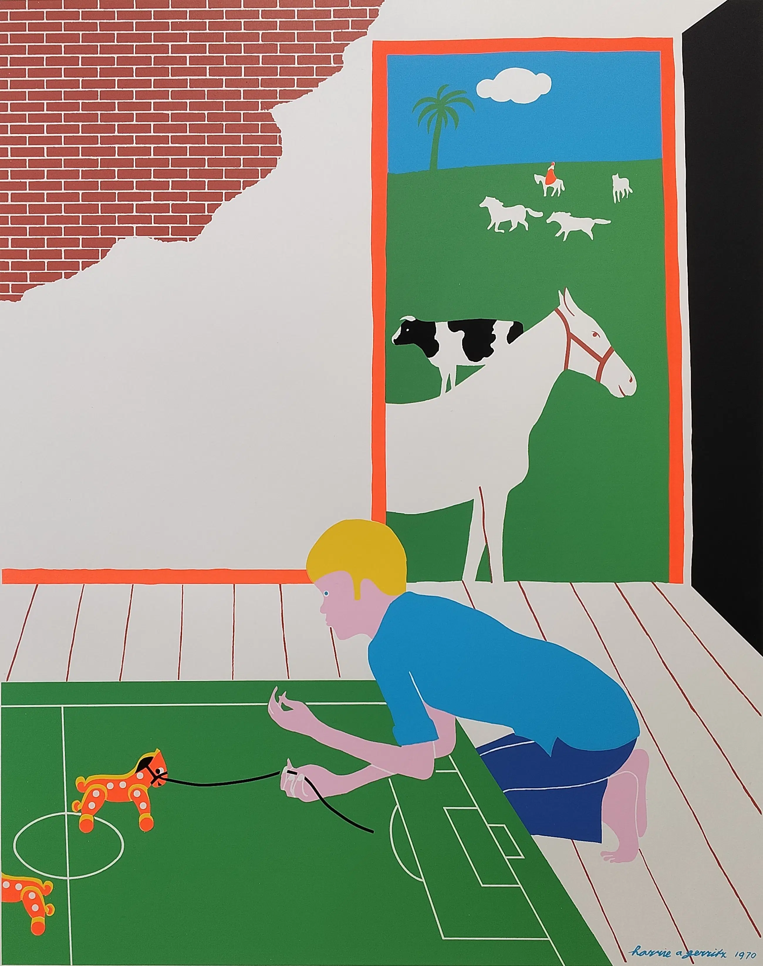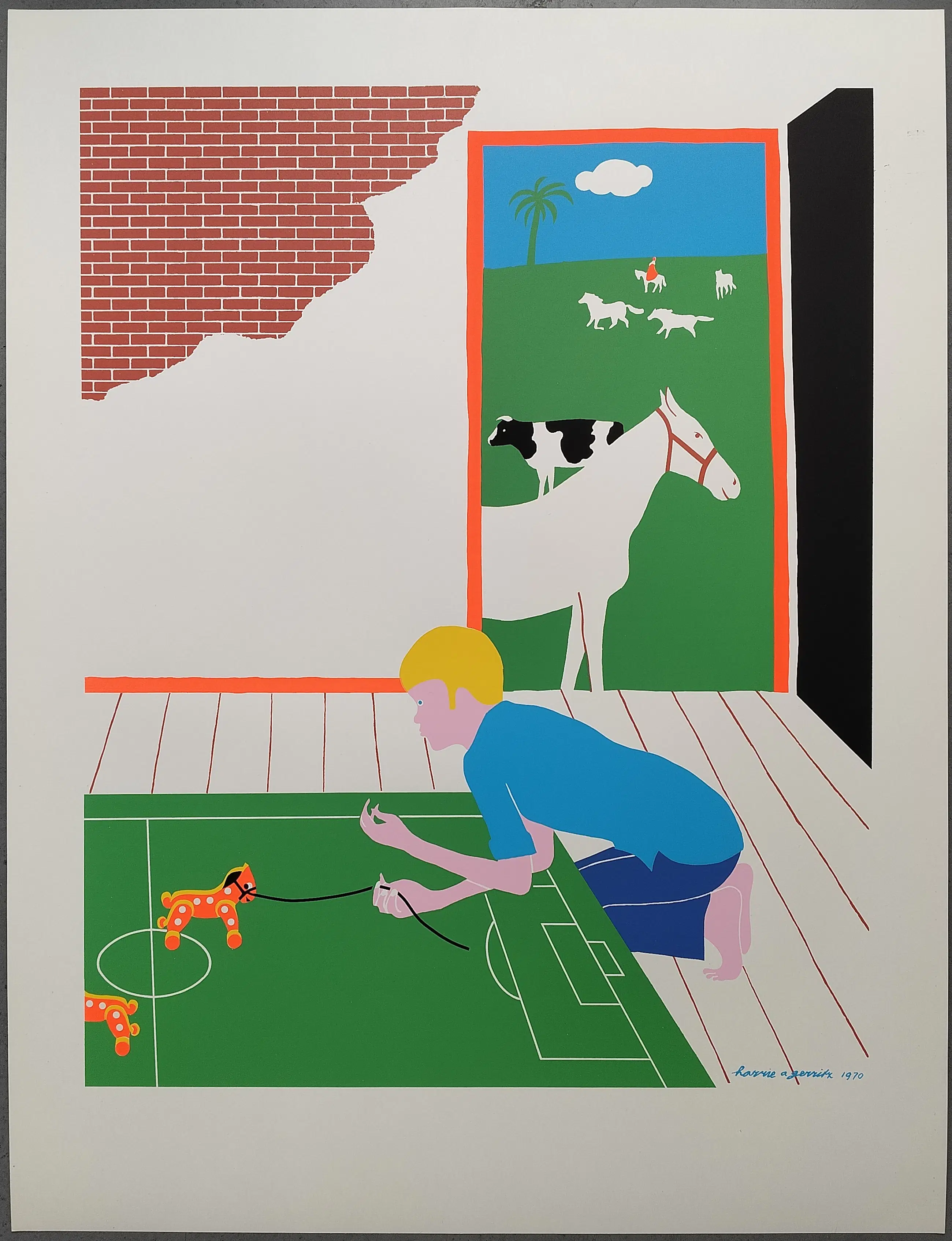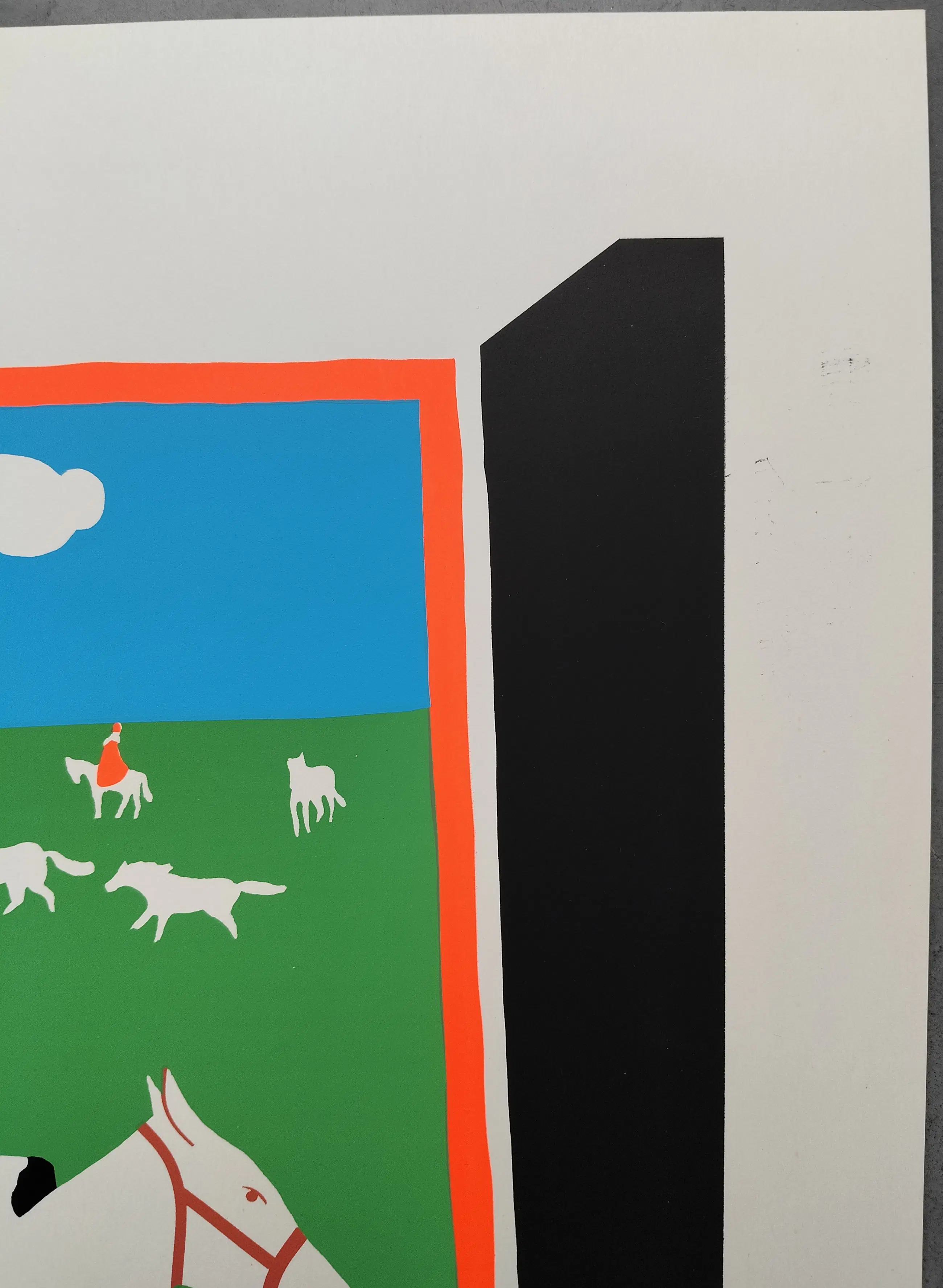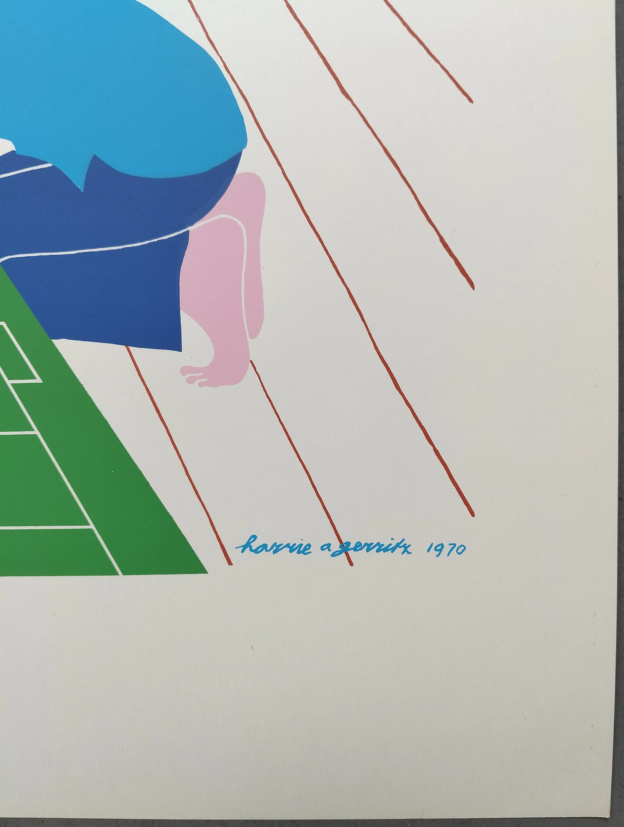 Zeefdruk van Harrie Gerritz (1940) uit 1970 Rechtsonder is het werk in de druk gesigneerd en gedateerd met 1970. Afmeting papier 65.5 x 50 cm (h x b) Op een paar plekken zijn wat kleine stipjes zichtbaar. Rechts boven aan de rand is een veeg van de zwarte inkt zichtbaar. Verder is de zeefdruk in goede staat.