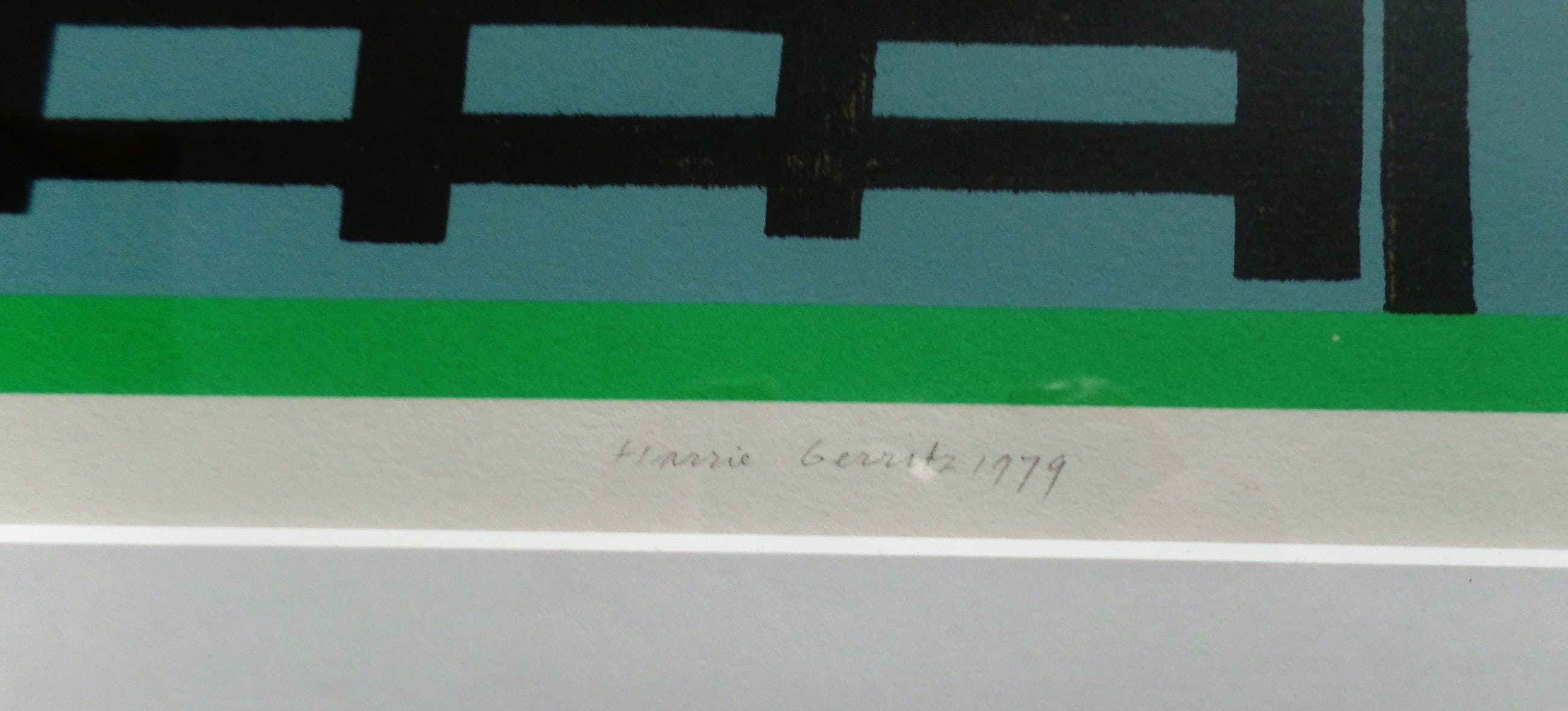 Mooie grote zeefdruk gesigneerd en gedateerd Harrie Gerritz 1979Ingelijst met passepartout in bijpassende groene houten lijst ( groot ) In verband met afmeting en glasplaat alleen ophalen of met koerier verzenden