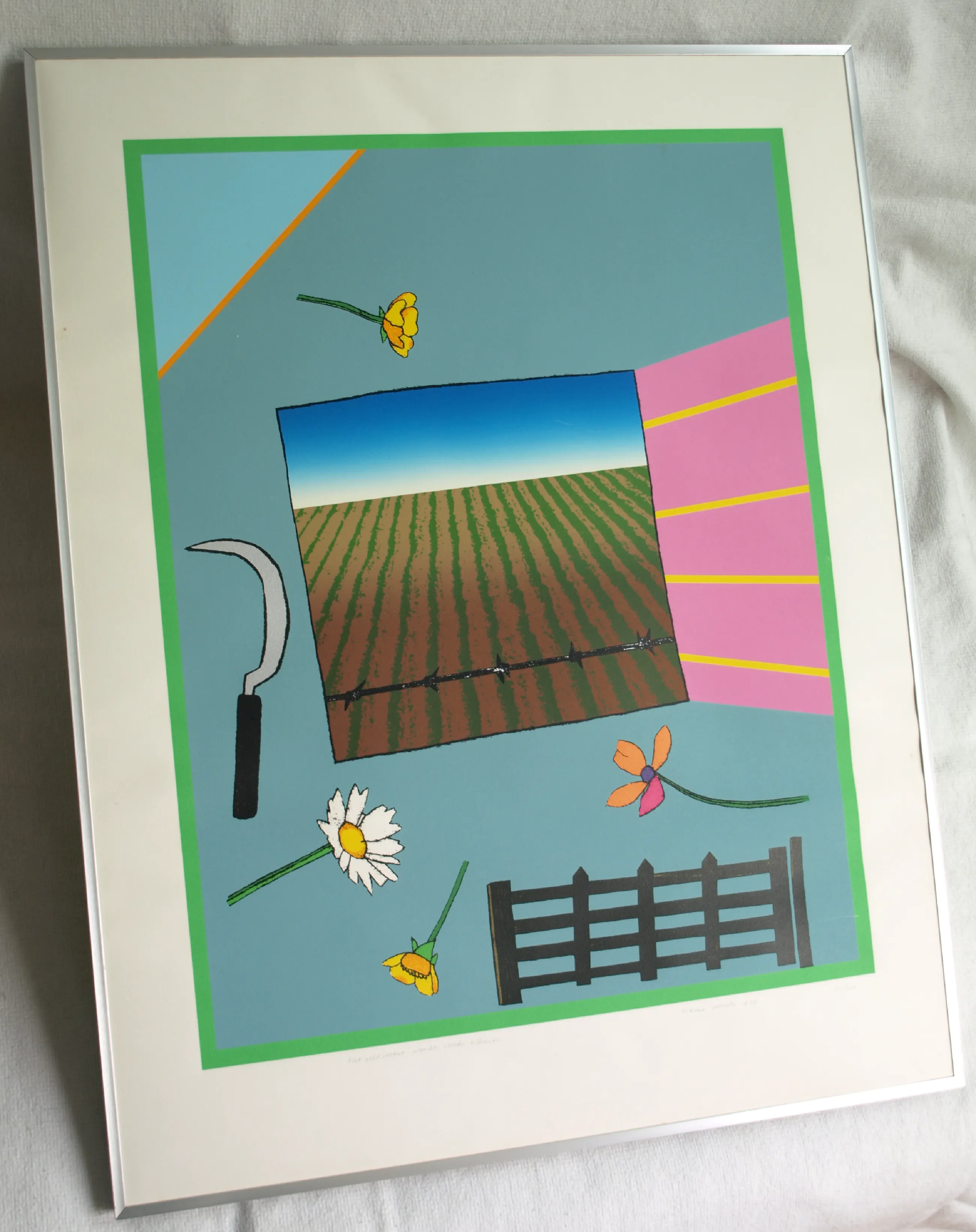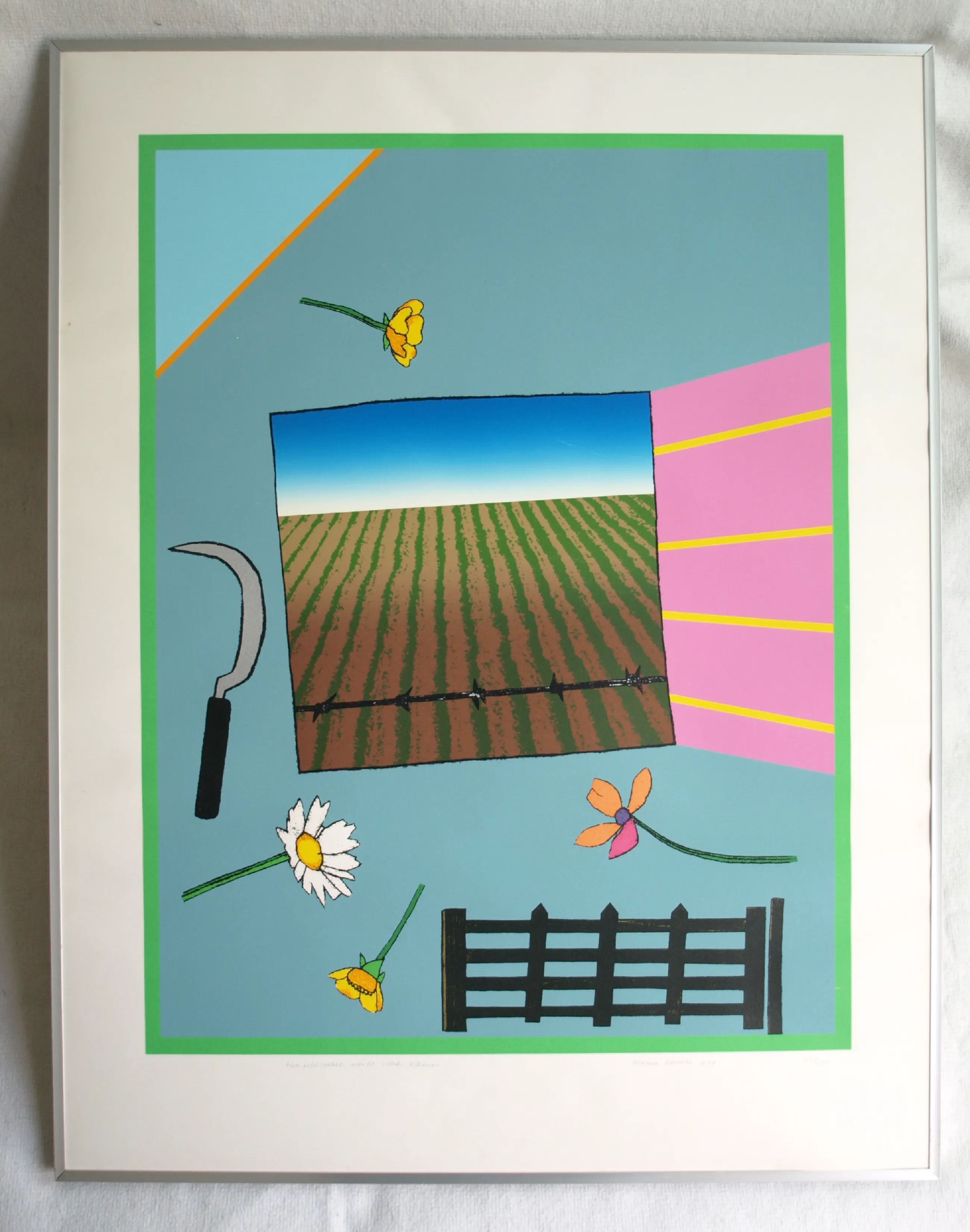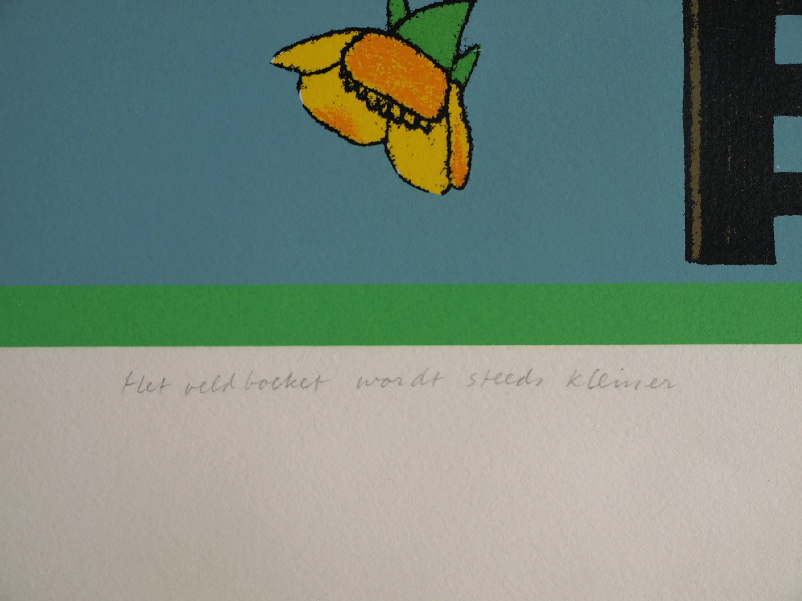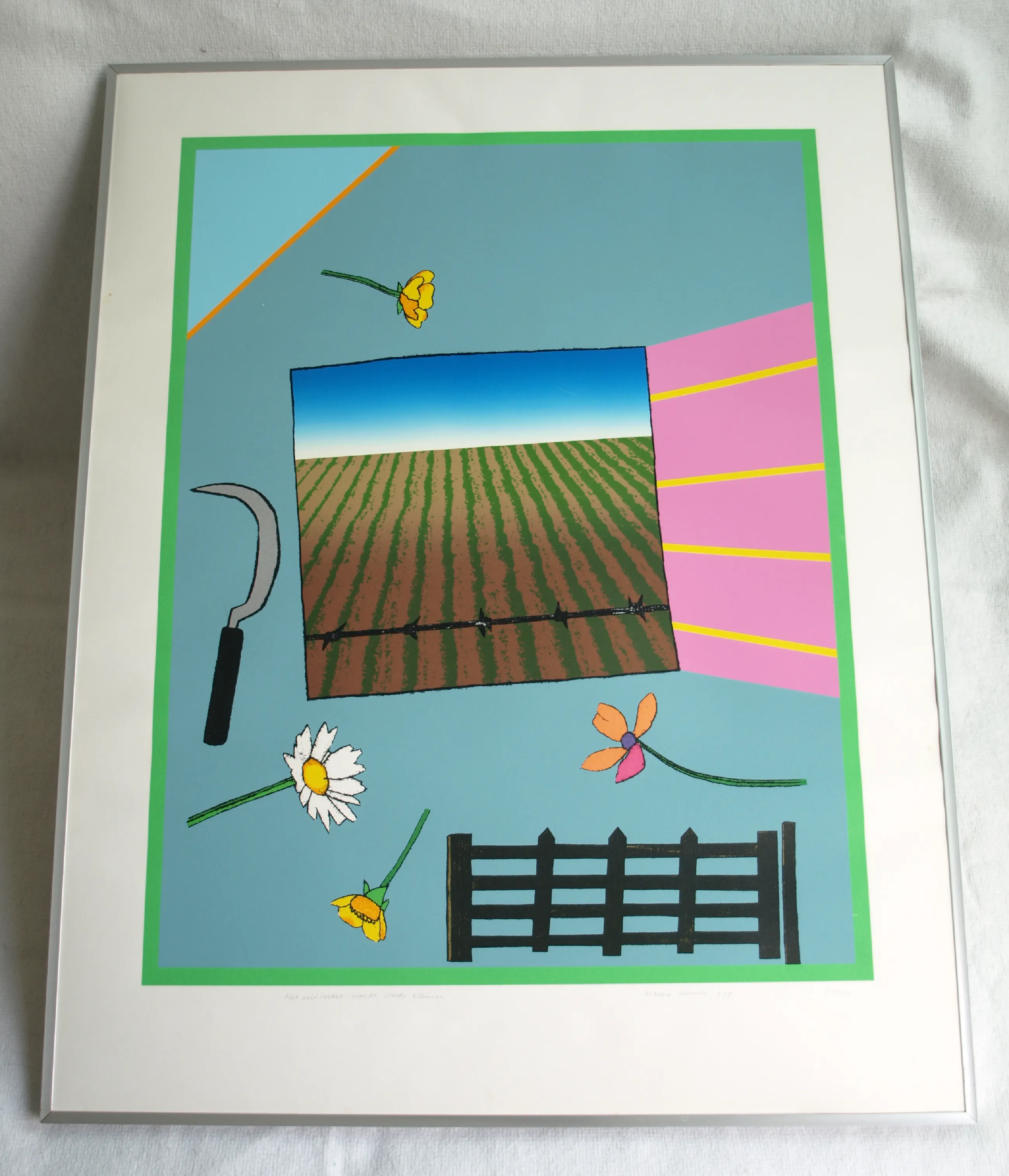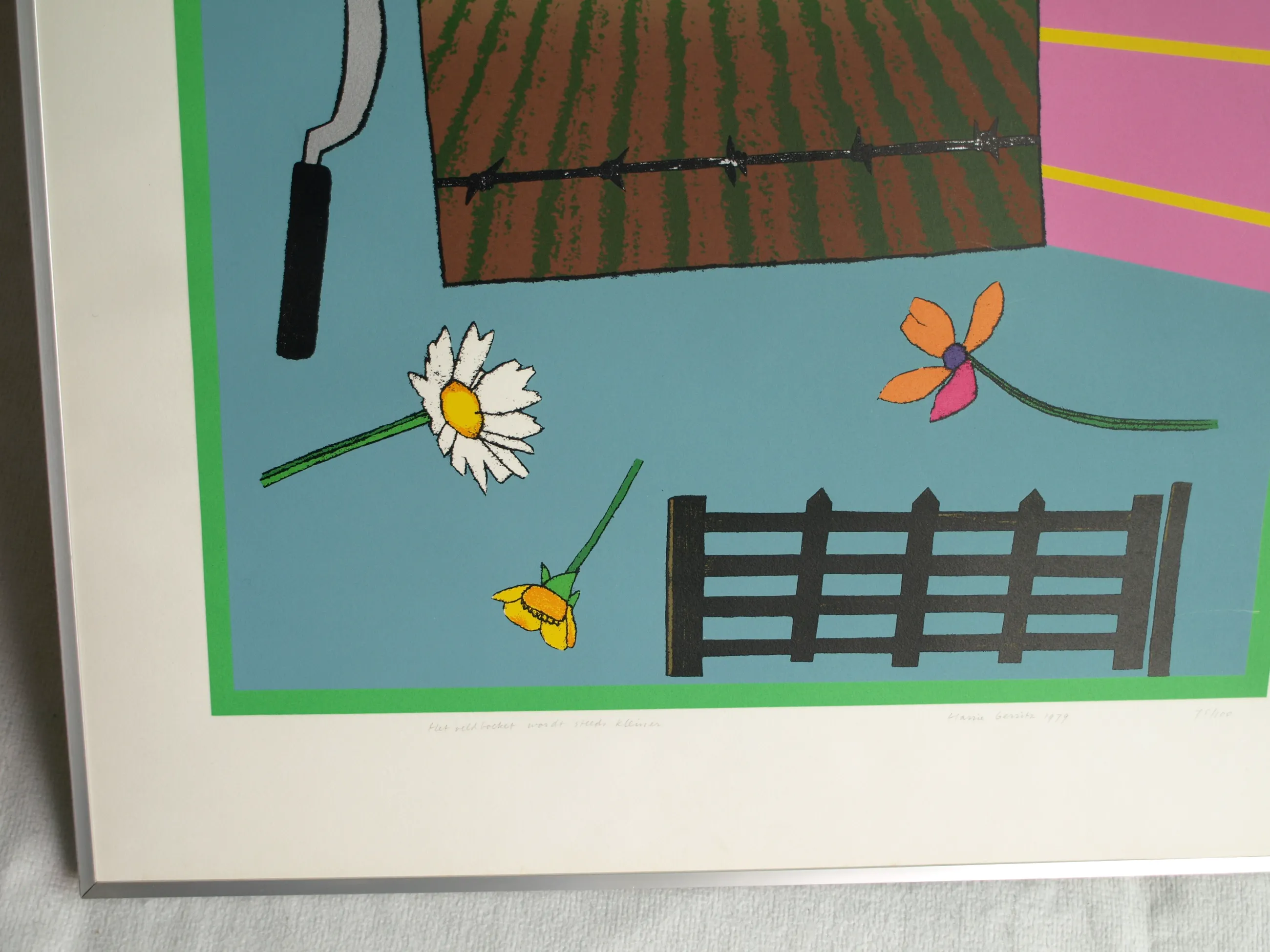 Een vroege, ingelijste zeefdruk uit 1979 van de Nederlandse kunstenaar Harrie Gerritz (1940), getiteld “Het veldboeket wordt steeds kleiner”. -Gesigneerd, gedateerd, getiteld en genummerd met potlood. Nr. 75 van 100. -Gedrukt door drukker Bernard Ruygrok. De blinddruk / reliëfdruk van deze drukker zit rechtsonder in het papier. -Ingelijst in een aluminium lijst (zonder glasplaat). -Afmetingen: Lijst, 81 x 63 cm. Beeld / zeefdruk, 65 x 50 cm. -Herkomst: Uit een inboedel. -Conditie: Het werk is in goede staat met een paar lichte krasjes. De lijst heeft geen glasplaat. Zie ook de foto’s voor een eigen indruk. Kan zo aan de muur.