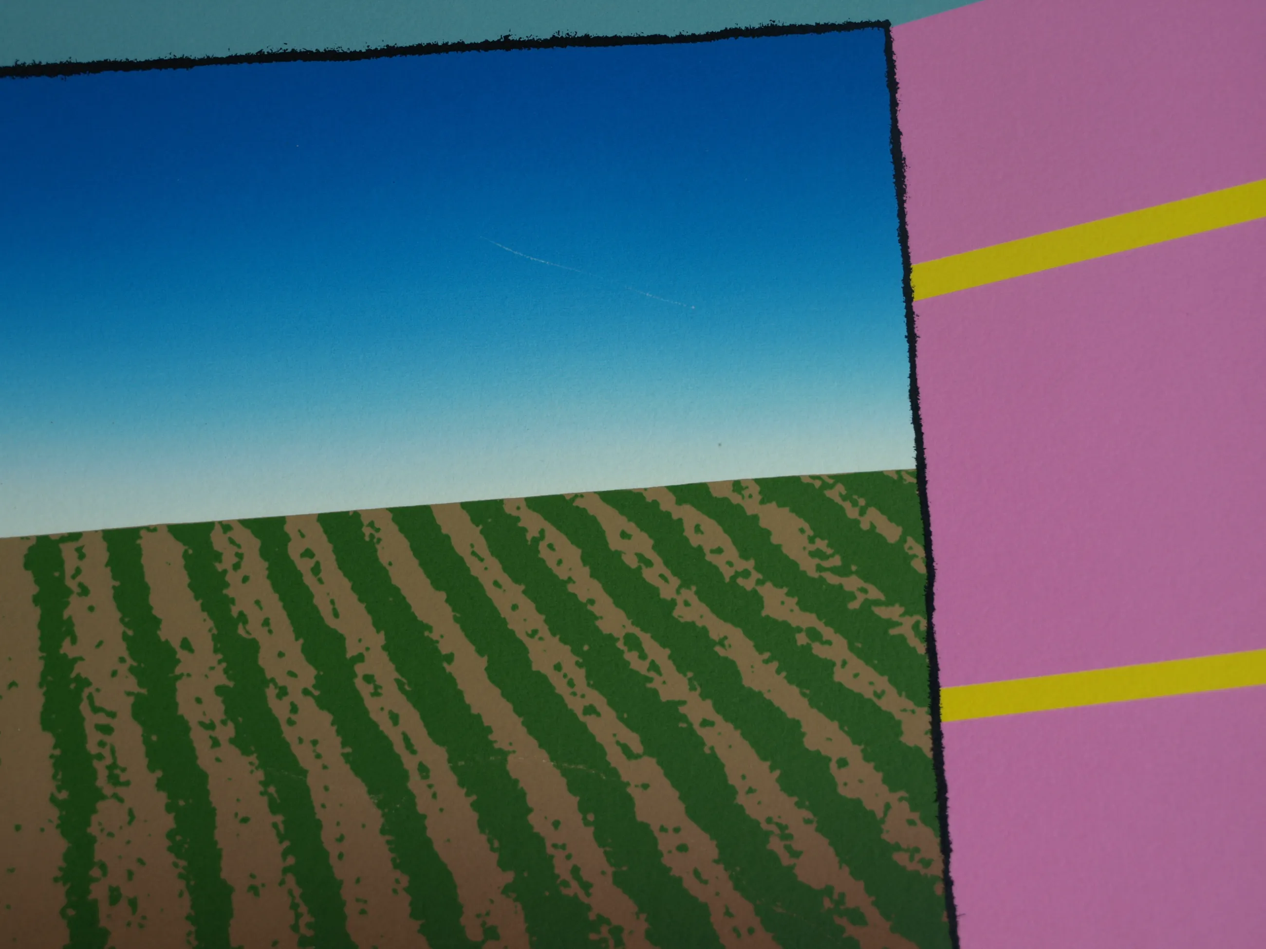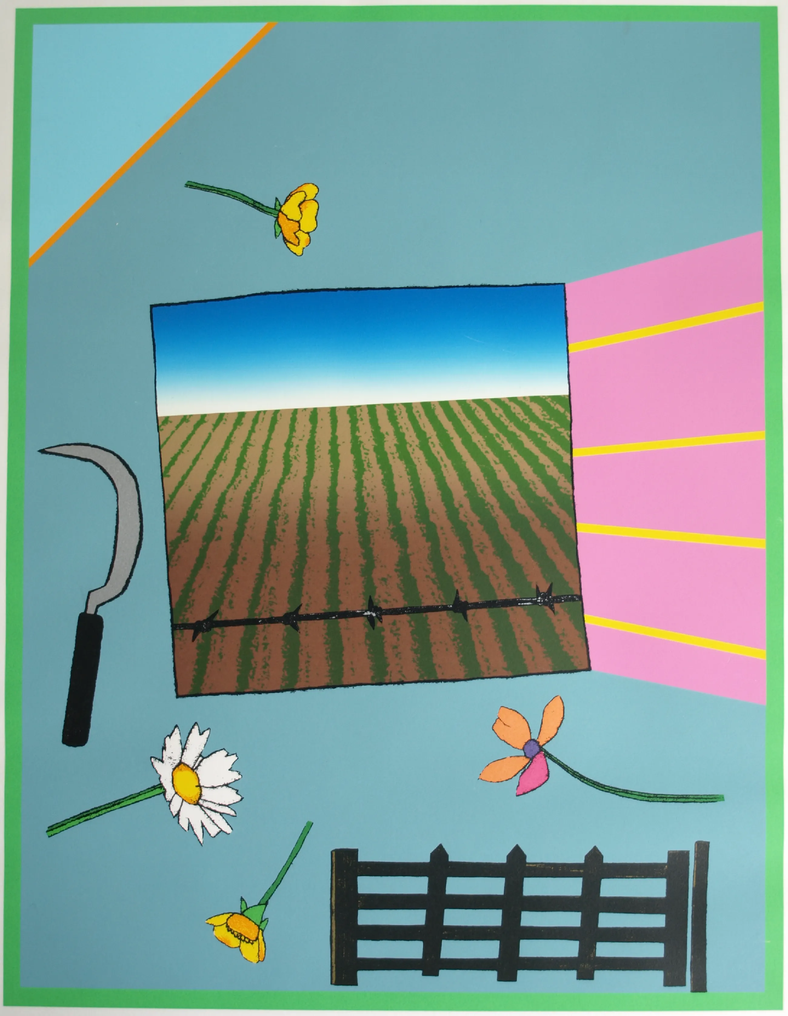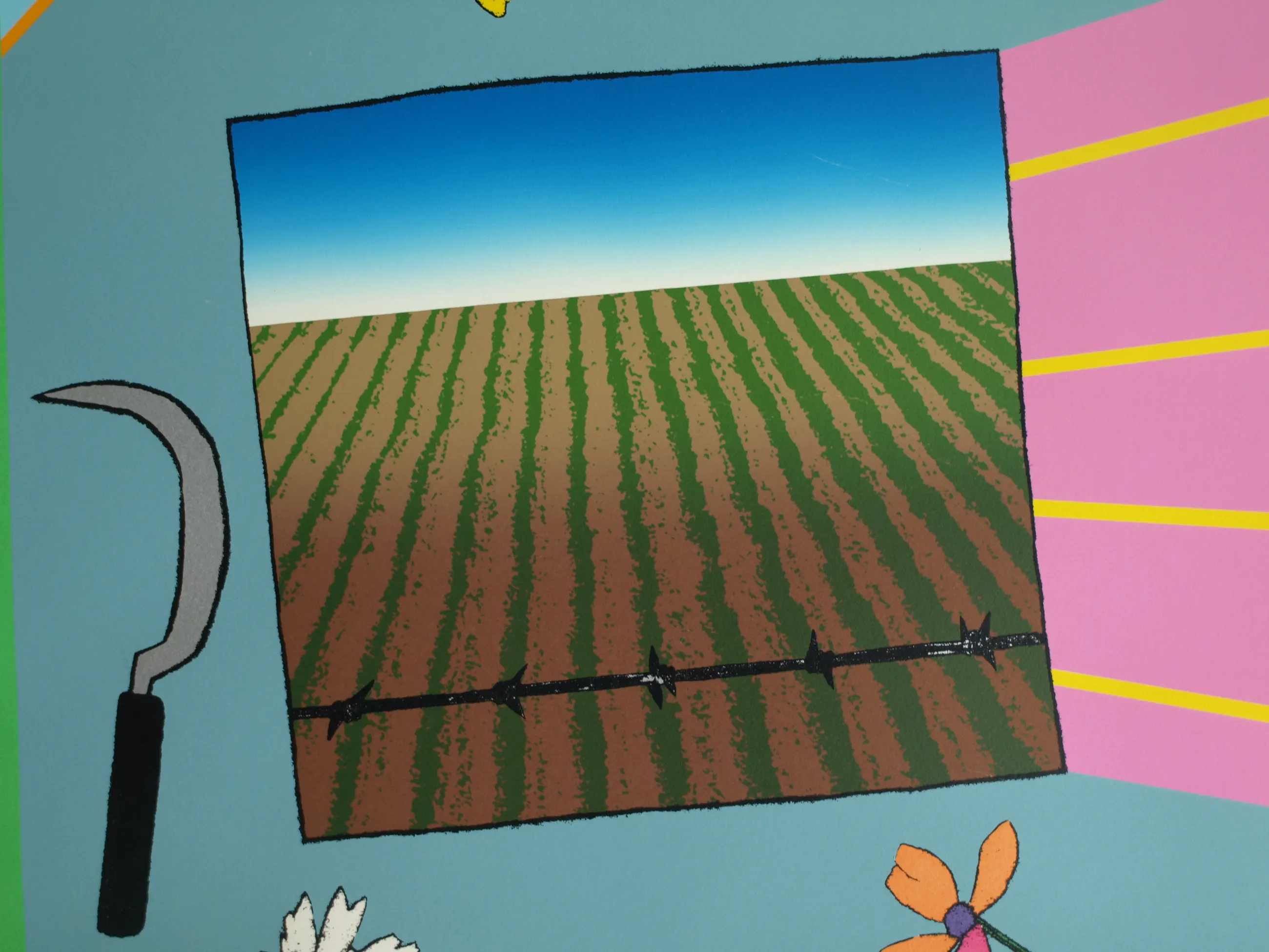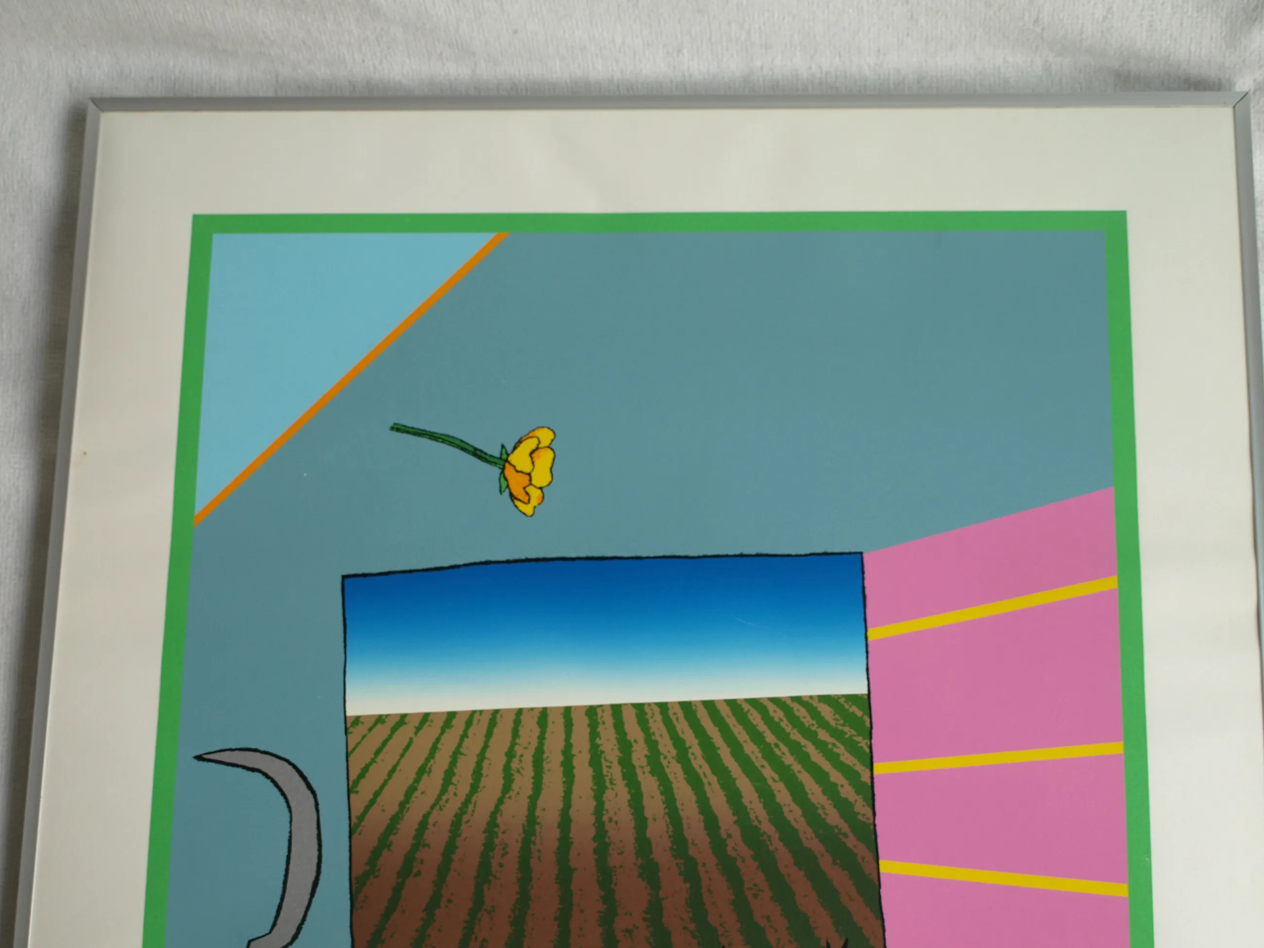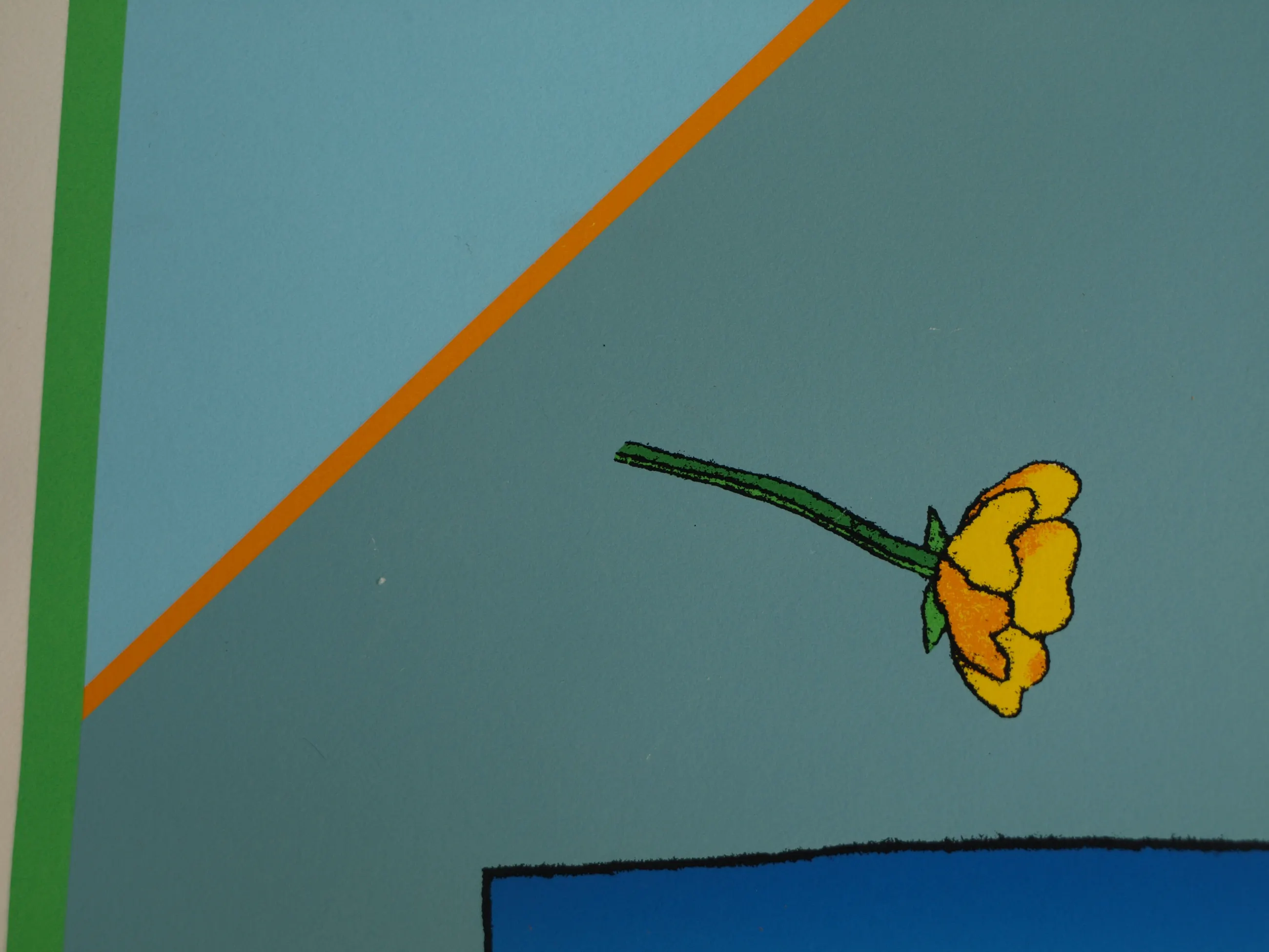 Een vroege, ingelijste zeefdruk uit 1979 van de Nederlandse kunstenaar Harrie Gerritz (1940), getiteld “Het veldboeket wordt steeds kleiner”. -Gesigneerd, gedateerd, getiteld en genummerd met potlood. Nr. 75 van 100. -Gedrukt door drukker Bernard Ruygrok. De blinddruk / reliëfdruk van deze drukker zit rechtsonder in het papier. -Ingelijst in een aluminium lijst (zonder glasplaat). -Afmetingen: Lijst, 81 x 63 cm. Beeld / zeefdruk, 65 x 50 cm. -Herkomst: Uit een inboedel. -Conditie: Het werk is in goede staat met een paar lichte krasjes. De lijst heeft geen glasplaat. Zie ook de foto’s voor een eigen indruk. Kan zo aan de muur.