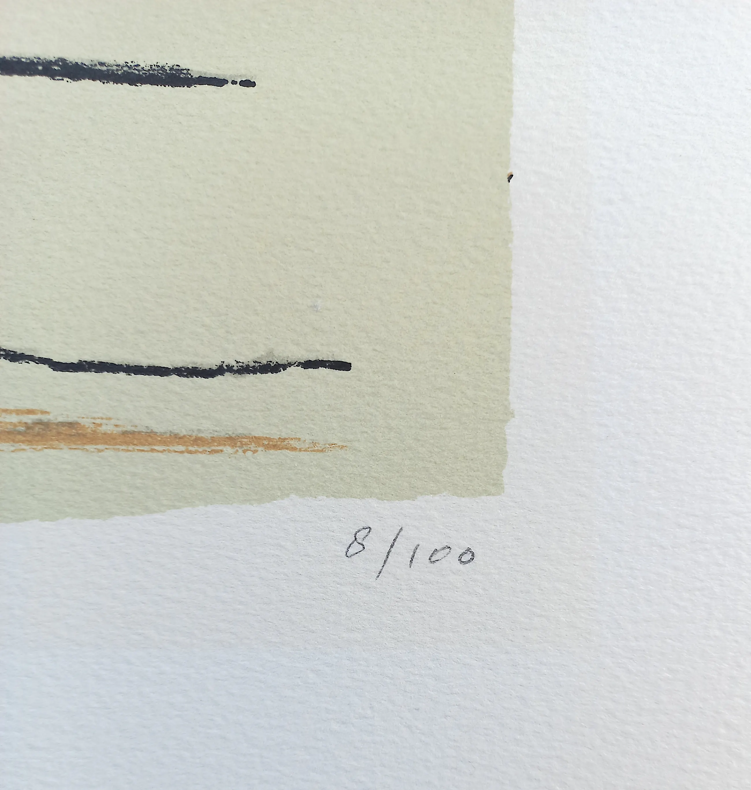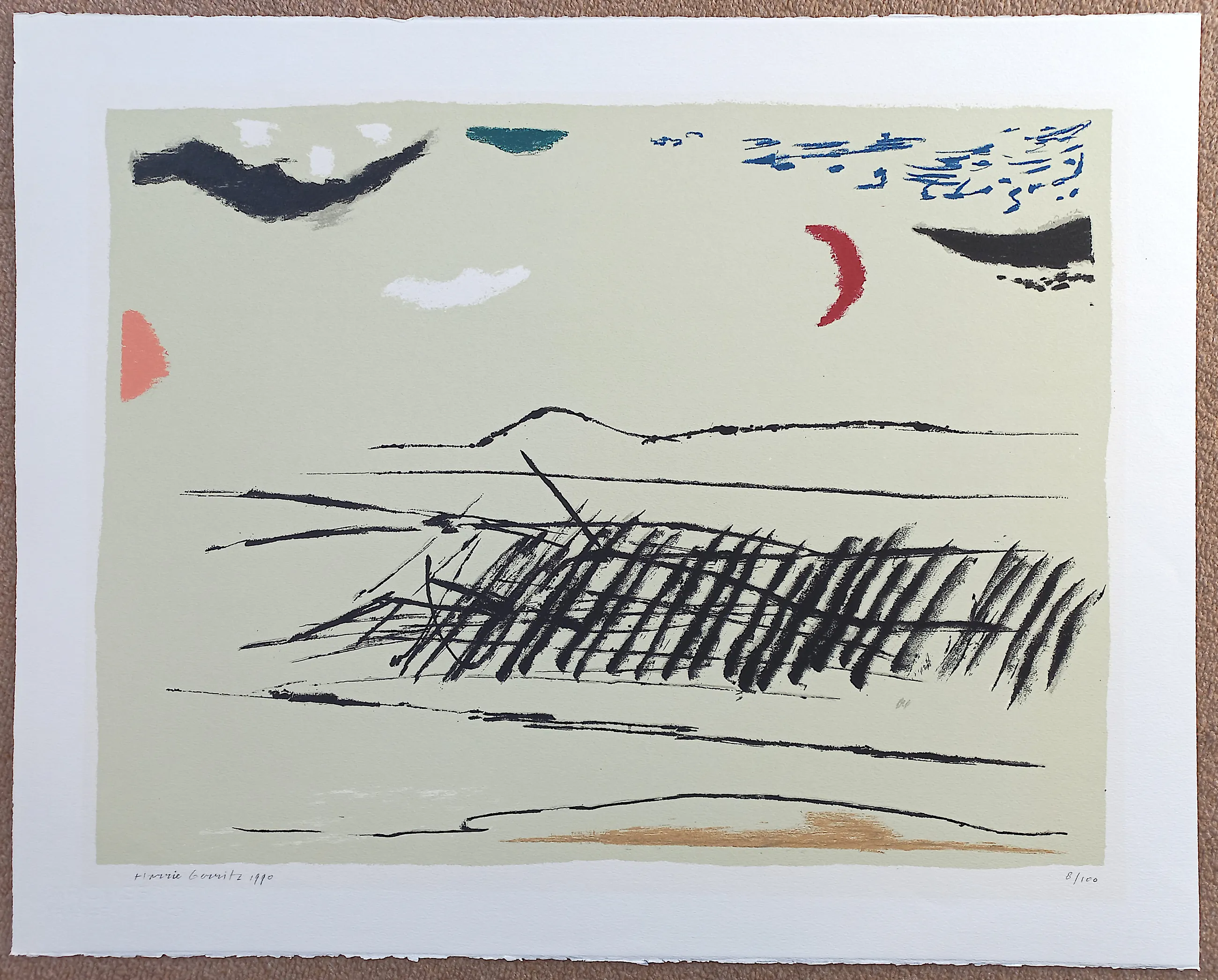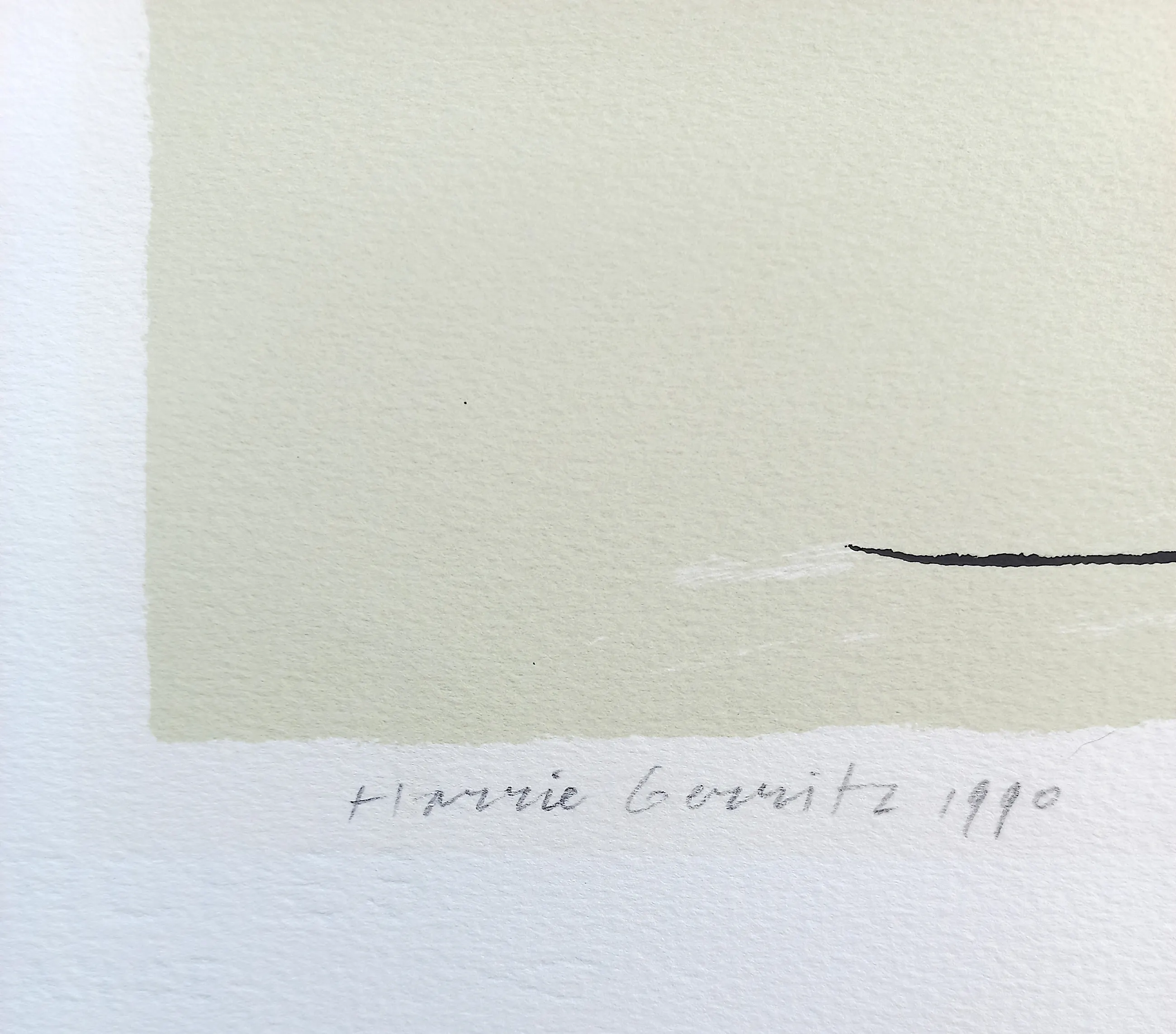 Karakteristiek werk van Harrie Gerritz. Litho op Arches papier, met potlood gesigneerd, gedateerd (1990) en genummerd (8/100). Afkomstig uit de kunstcollectie van ABNAMRO, in goede conditie.