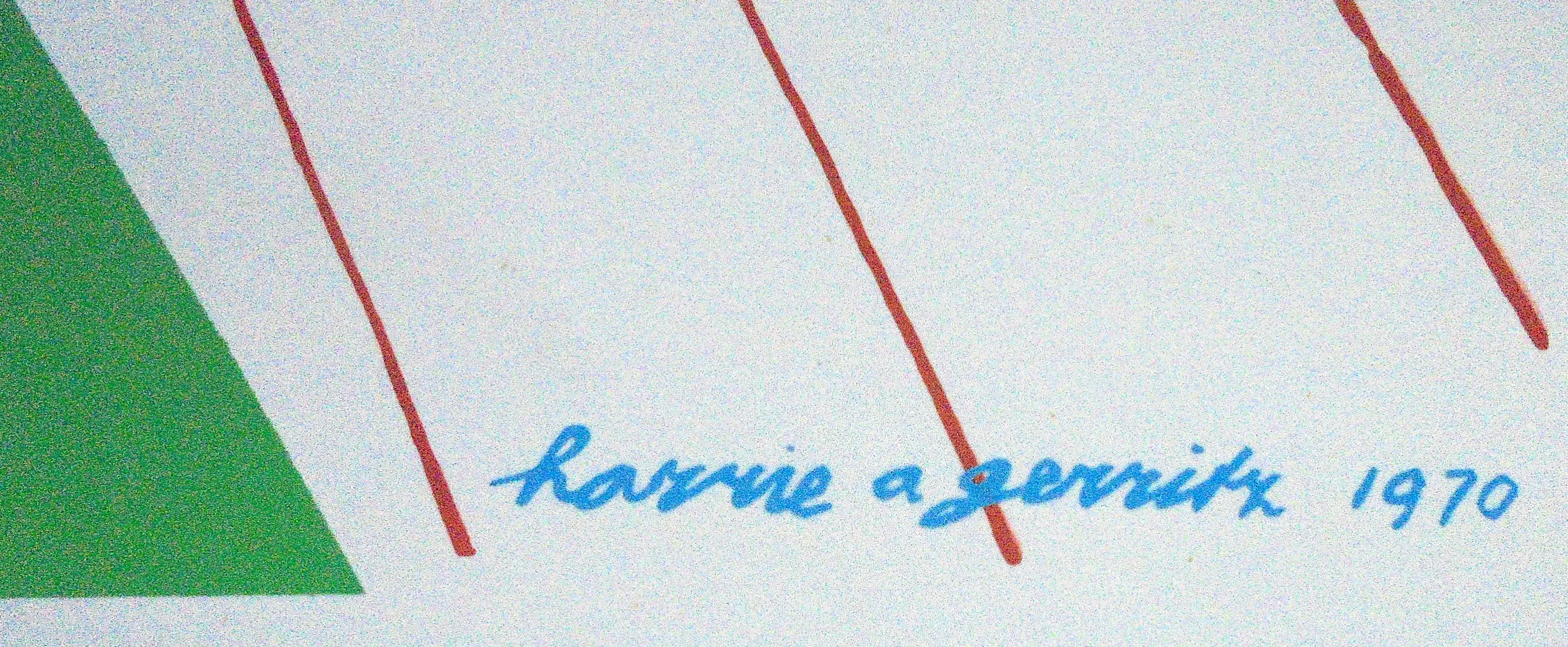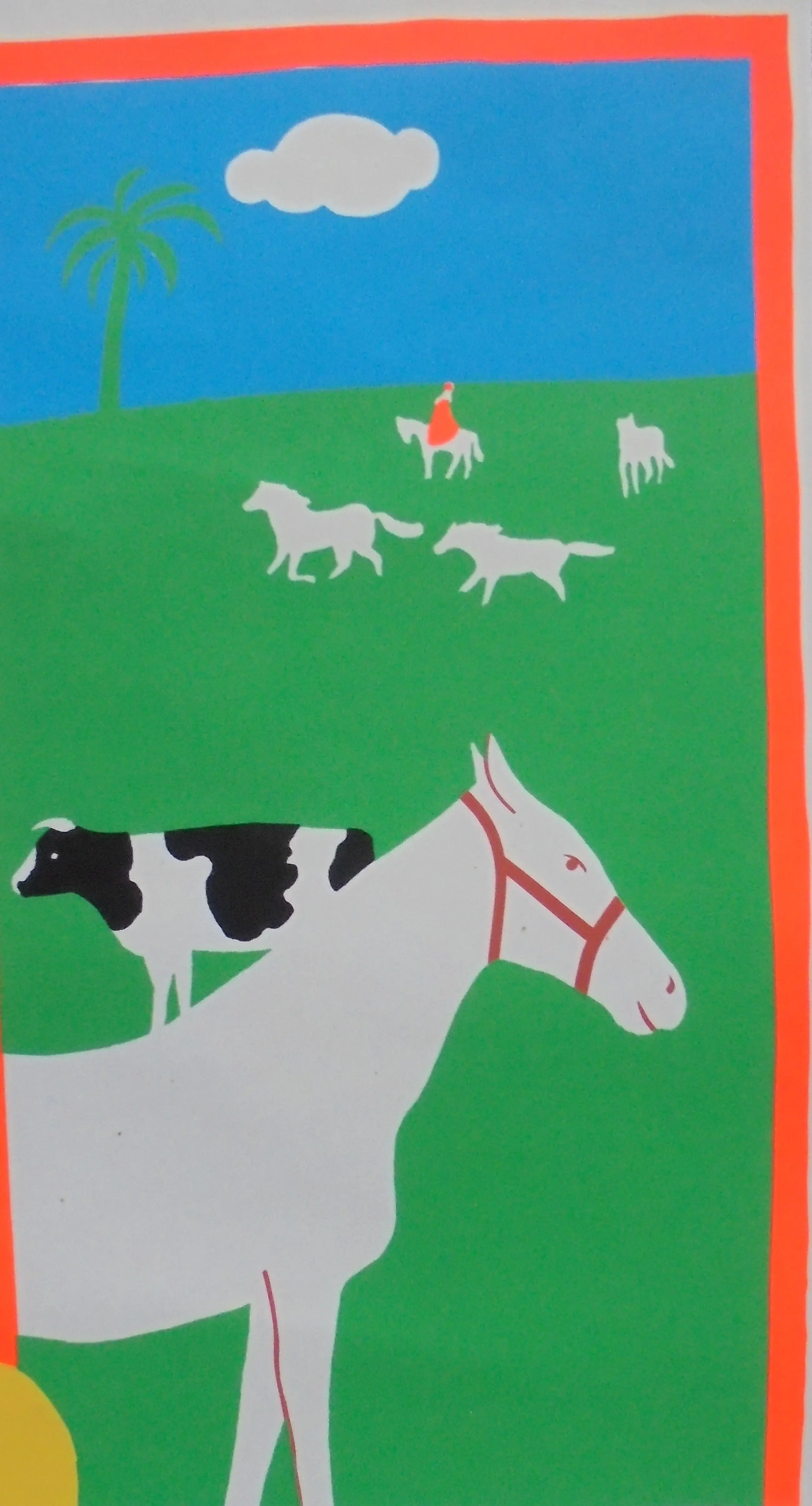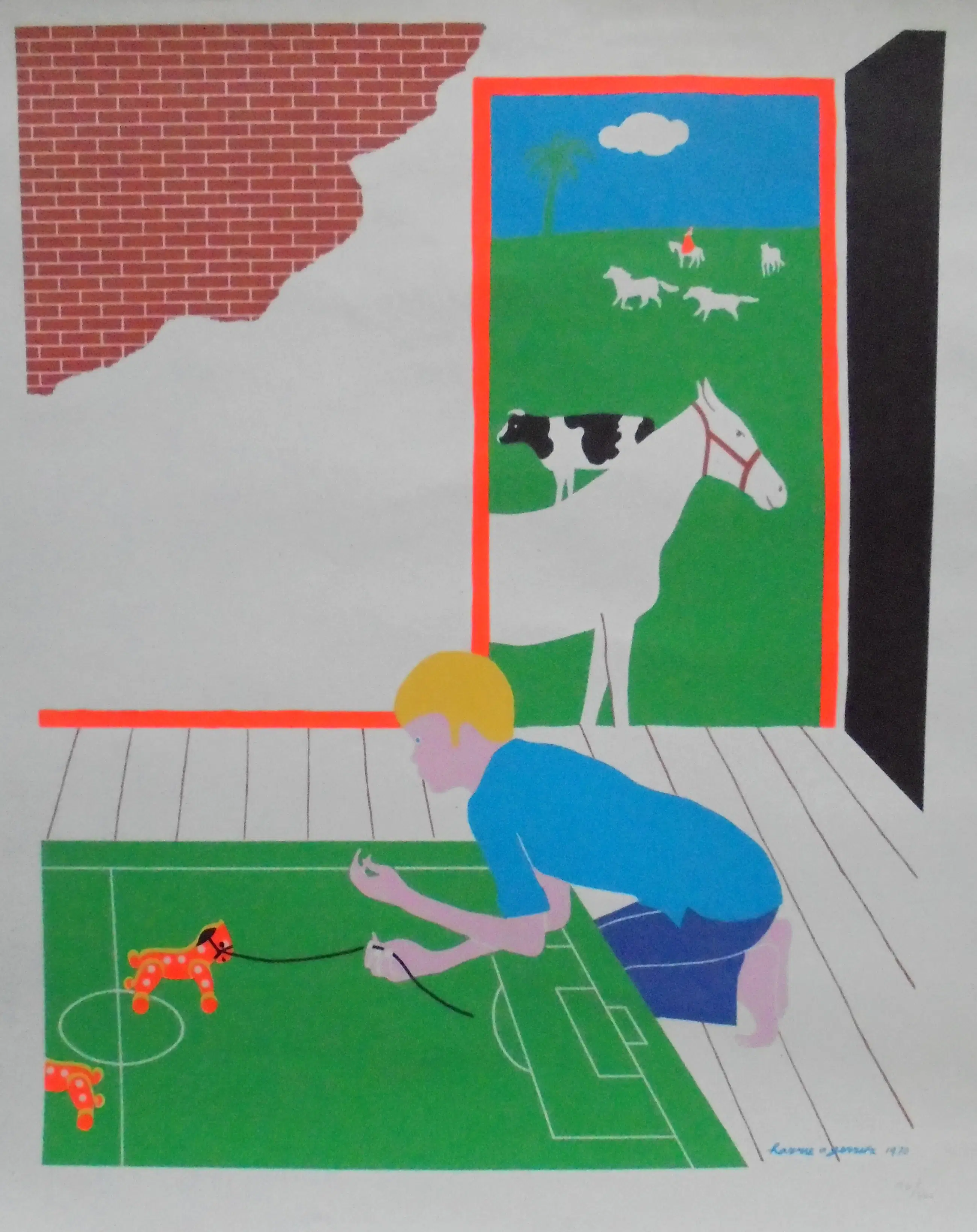 Prachtige, grote zeefdruk van Harrie Gerritz (1940) uit 1970. Lieflijk tafereel van kind met dieren.