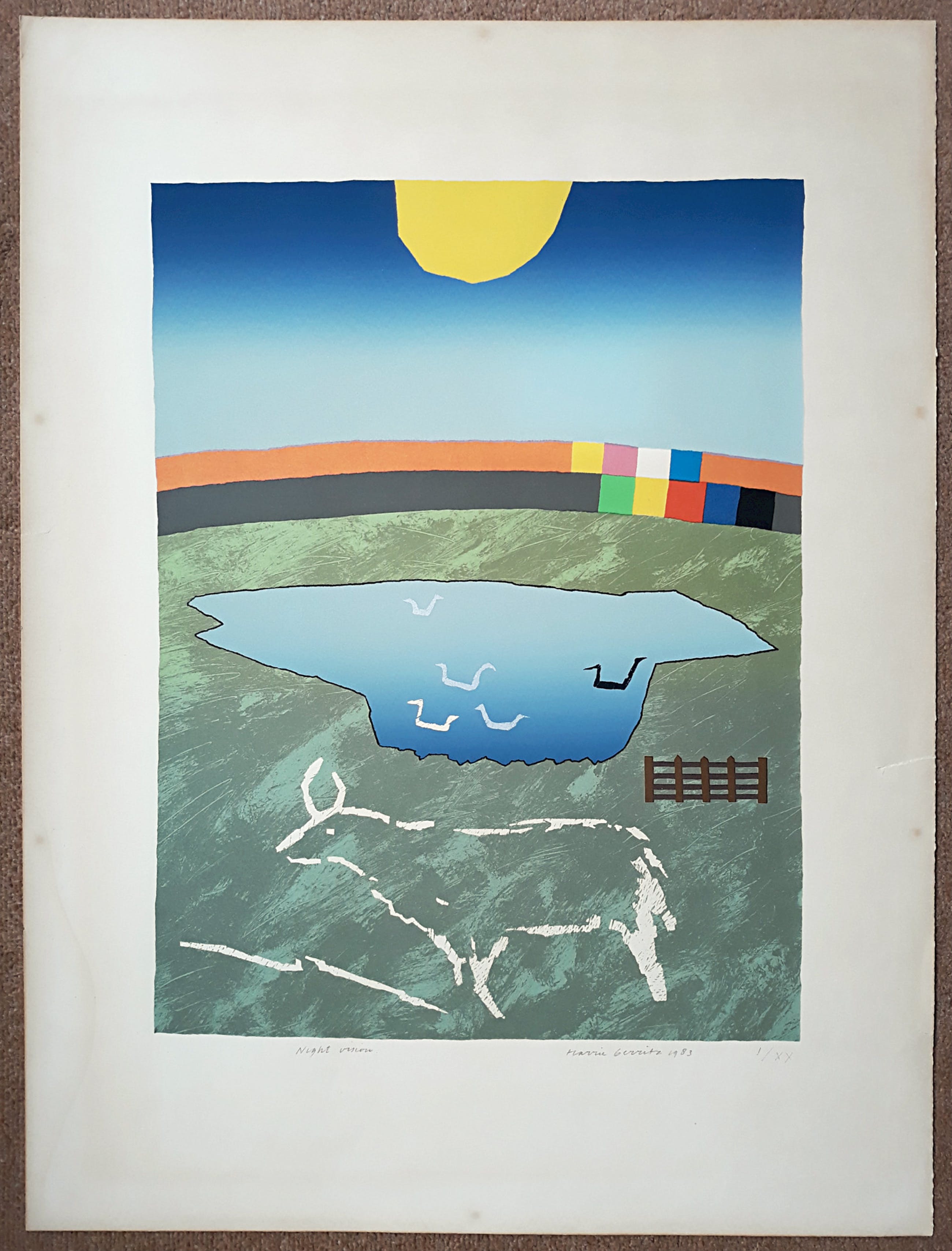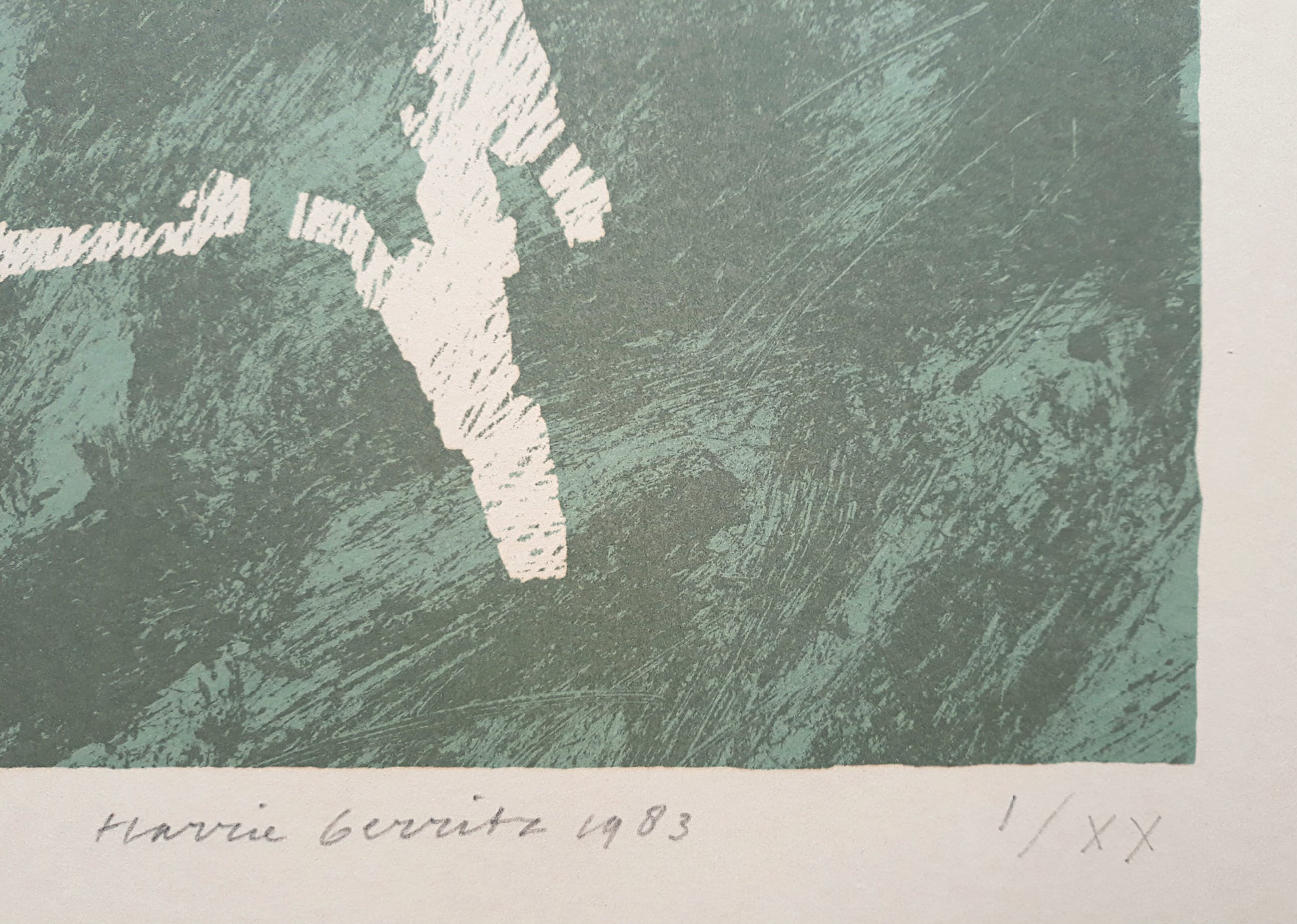 Karakteristiek werk van Harrie Gerritz uit 1983. Zeefdruk op papier, met potlood gesigneerd, gedateerd, getiteld en genummerd (I/XX = 1/20). Afkomstig uit de kunstcollectie van ABNAMRO, in redelijk goede conditie. Blad heeft ingelijst gezeten en het hele blad is verkleurd en er zitten scheurtjes en vlekken aan de randen van de marge. Ingelijst met passe-partout is het werk goed want dan vallen alle mankementen (behalve een niet storende verkleuring) weg.