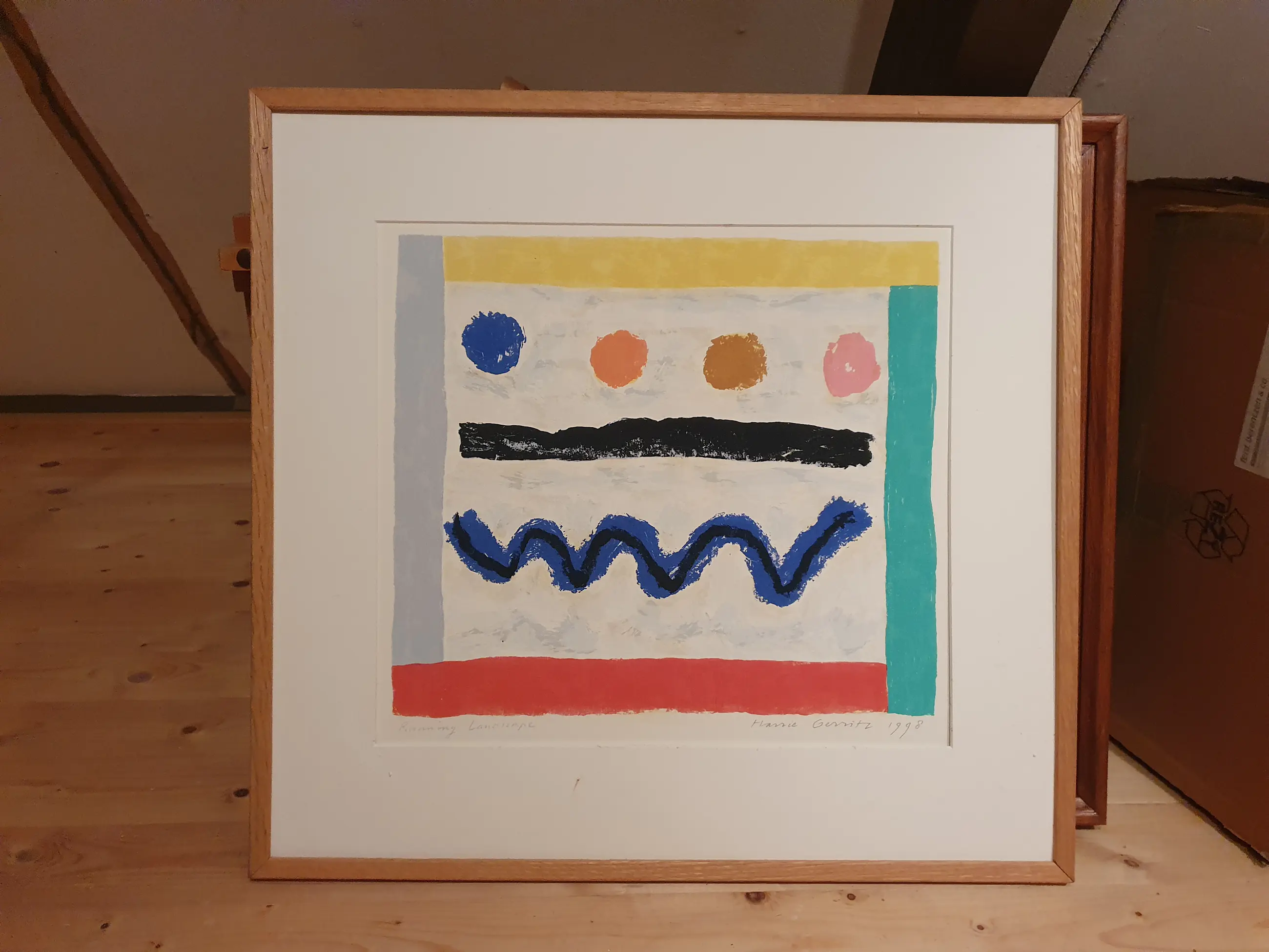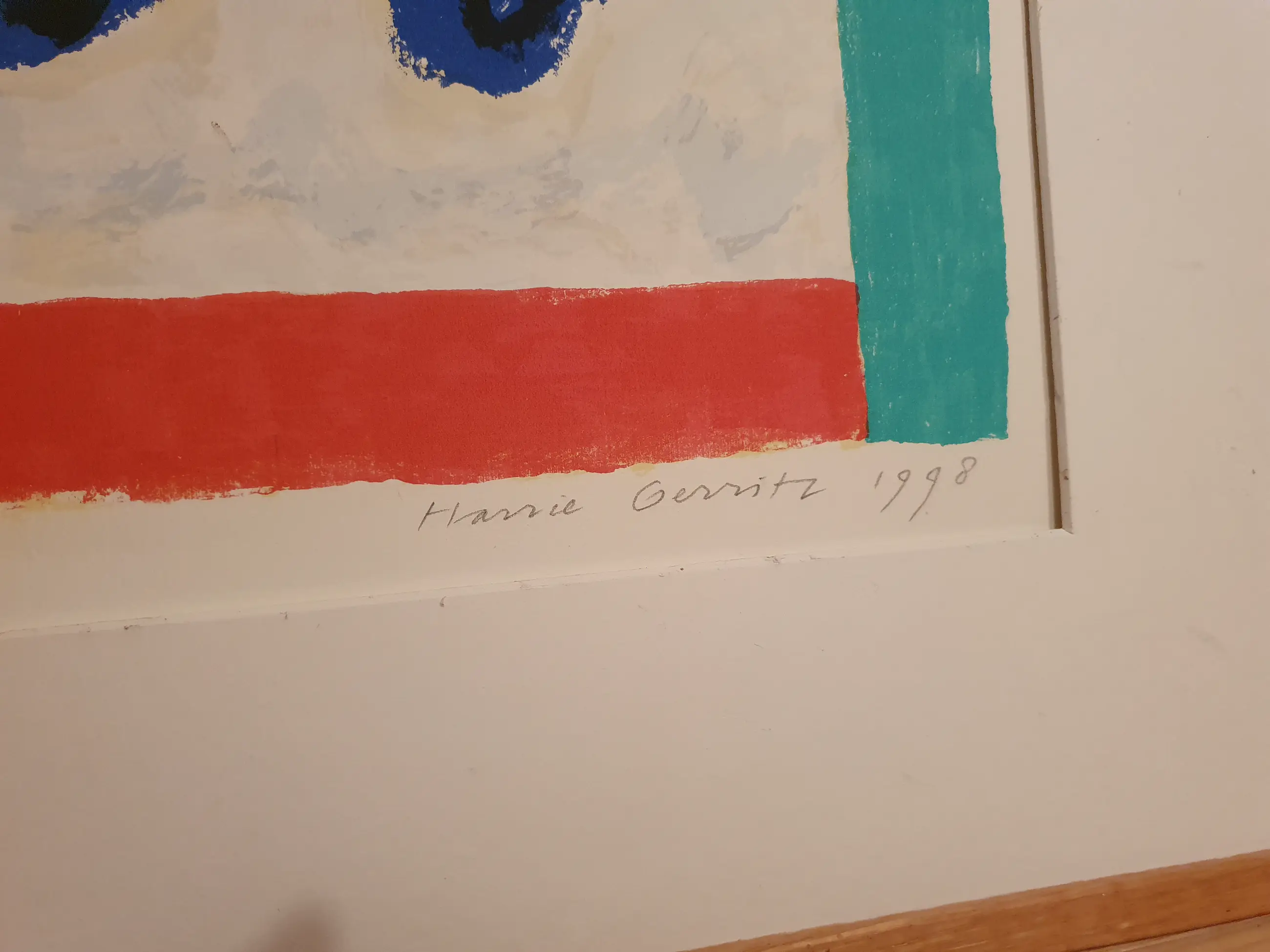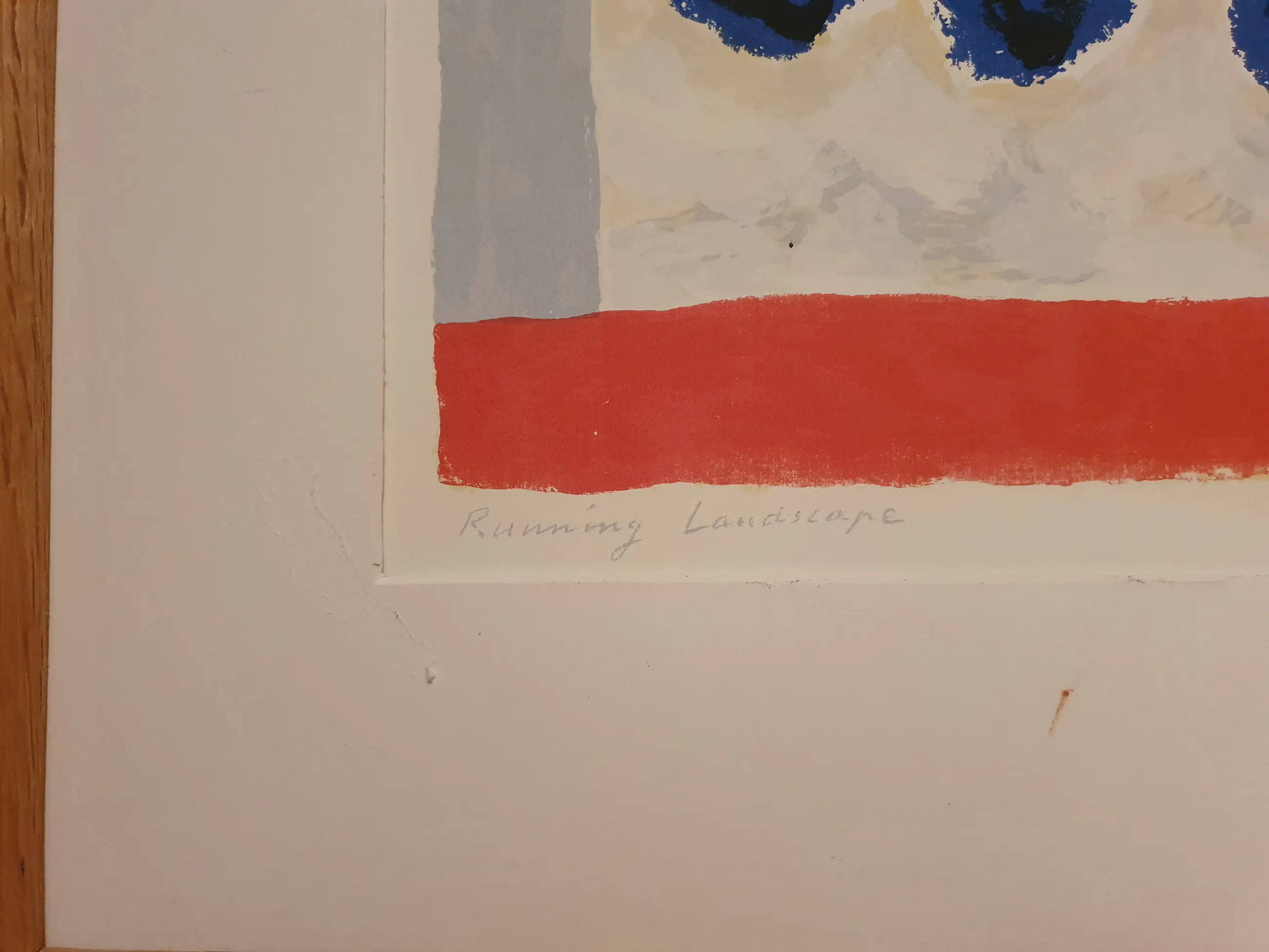 Droog en donker opgeslagen geweest. Zeefdruk in goede staat, passe-partout karton heeft een paar stukjes licht beschadigd alsof er plakband is afgetrokken.