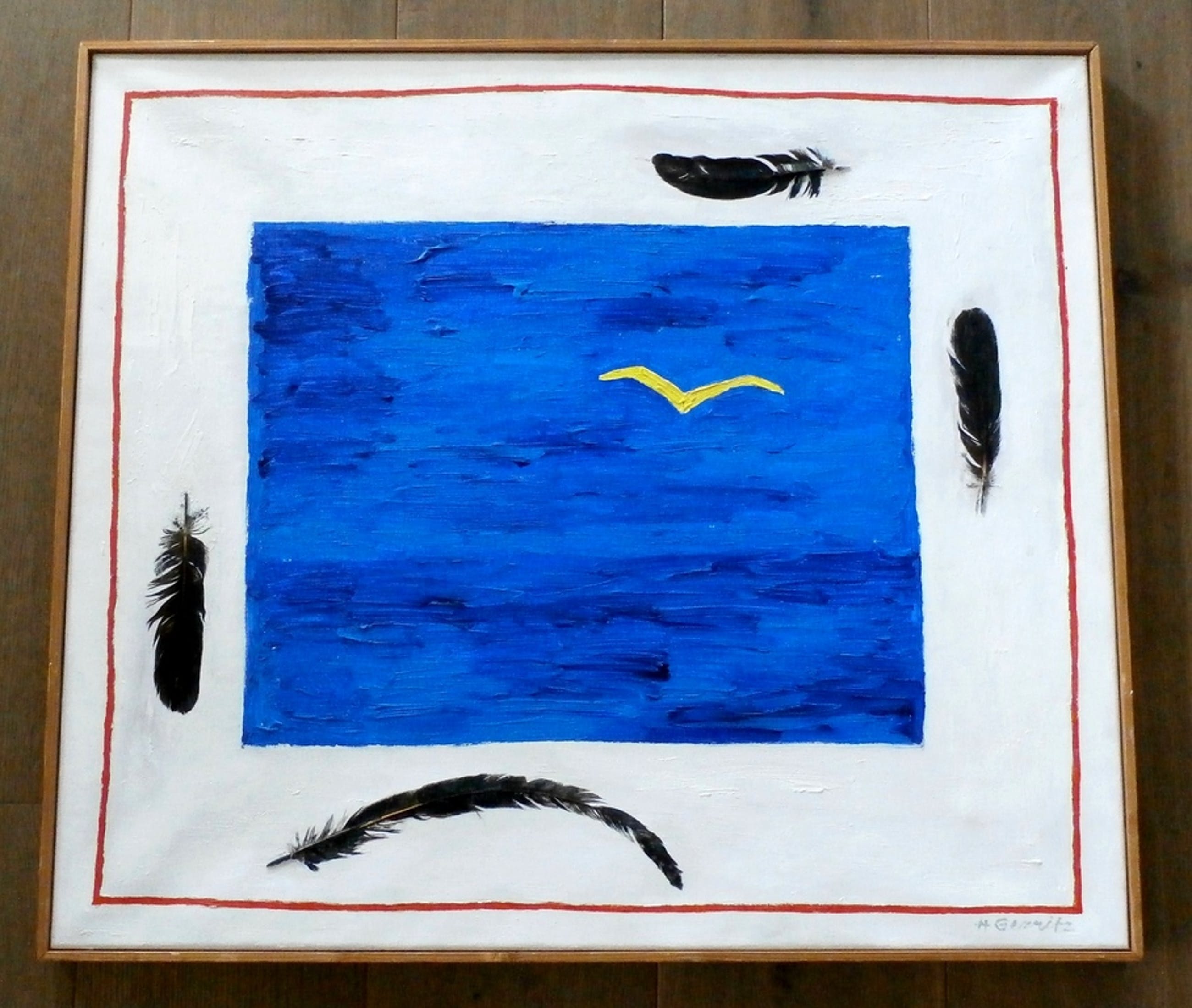 Mooi schilderij/collage van Harrie Gerritz . Titel: de aarde rond. Op het schilderij zijn vier vogelveren geplakt. Afmetingen incl lijst: H71,5 x b81,5 cm; Afmetingen voorstelling: H70 x b80 cm. Het werk is rechtsonder gesigneerd door de kunstenaar. De authenticiteit van dit werk wordt volledig gegarandeerd. Een certifcaat kan, op aanvraag, worden gemaild.