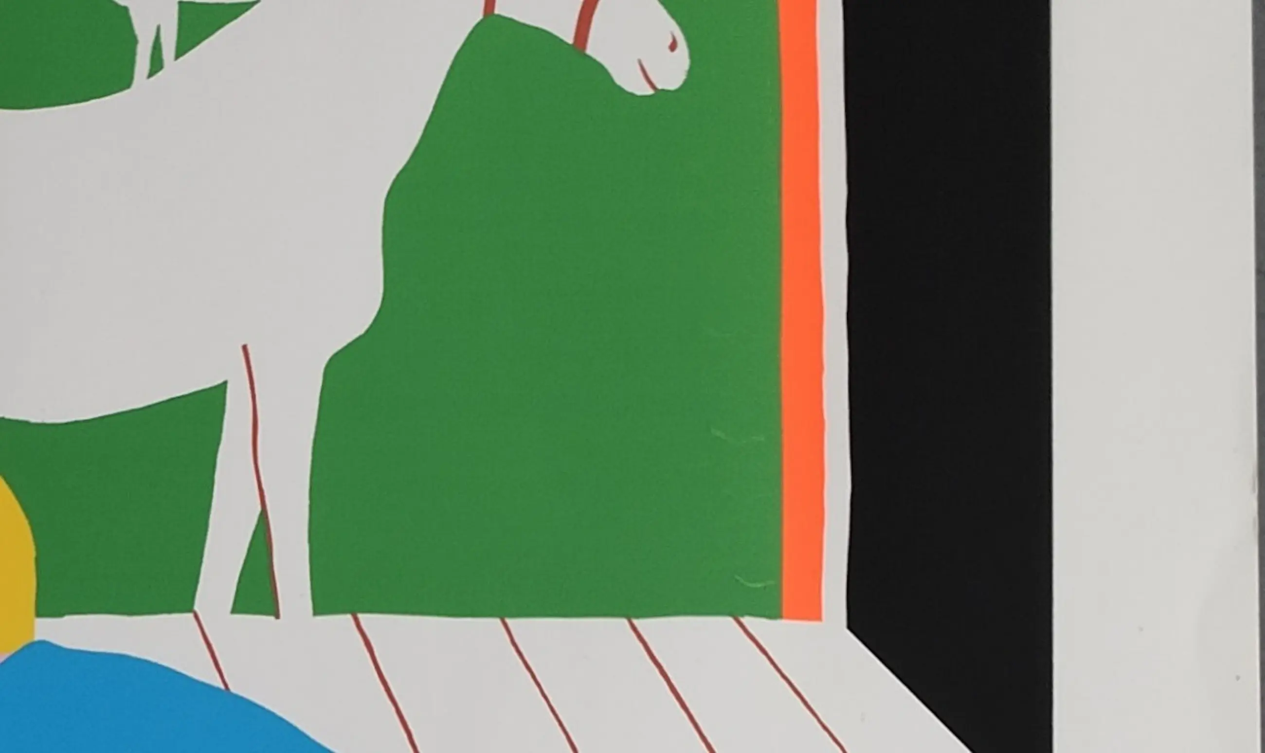 Zeefdruk van Harrie Gerritz (1940) uit 1970 Rechtsonder is het werk in de druk gesigneerd en gedateerd met 1970. Afmeting papier 65.5 x 50 cm (h x b) In de witmarge is wat lichte foxing zichtbaar en langs de rand wat lichte vouwtjes. In het groene vlak onder het paardenhoofd zitten wat lichte krasjes. Verder is de zeefdruk in goede staat.