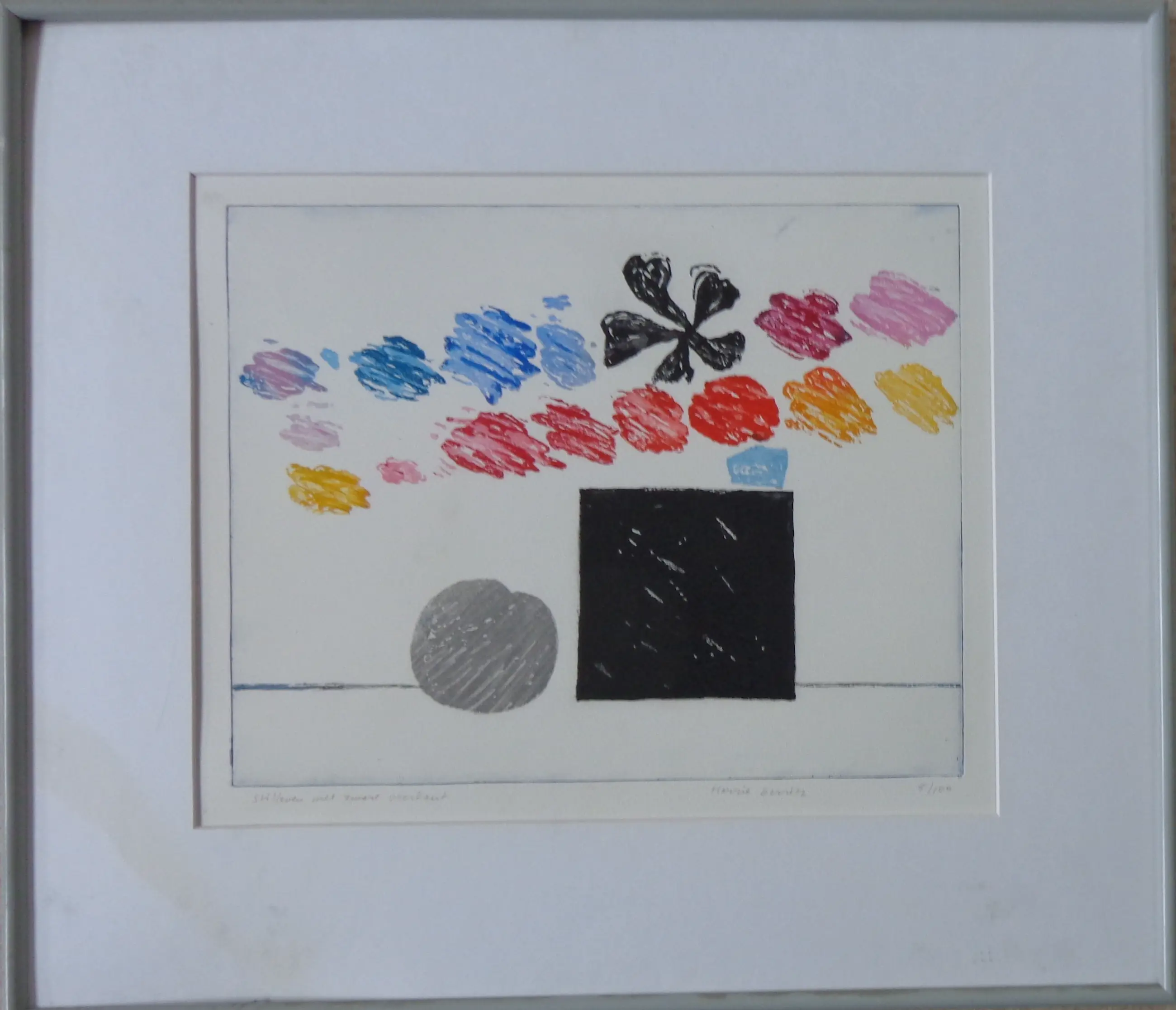Harrie Gerritz (°1940). Titel: "Stilleven met zwart vierkant". Kleurets op papier. Gesigneerd met potlood. Ex.nr. 5/100. Verso etiket kunstenaar. Proper blad. Blad: 36x44cm. Kader: 56x64cm. Kader zonder glas. Passe-partout bevuild.