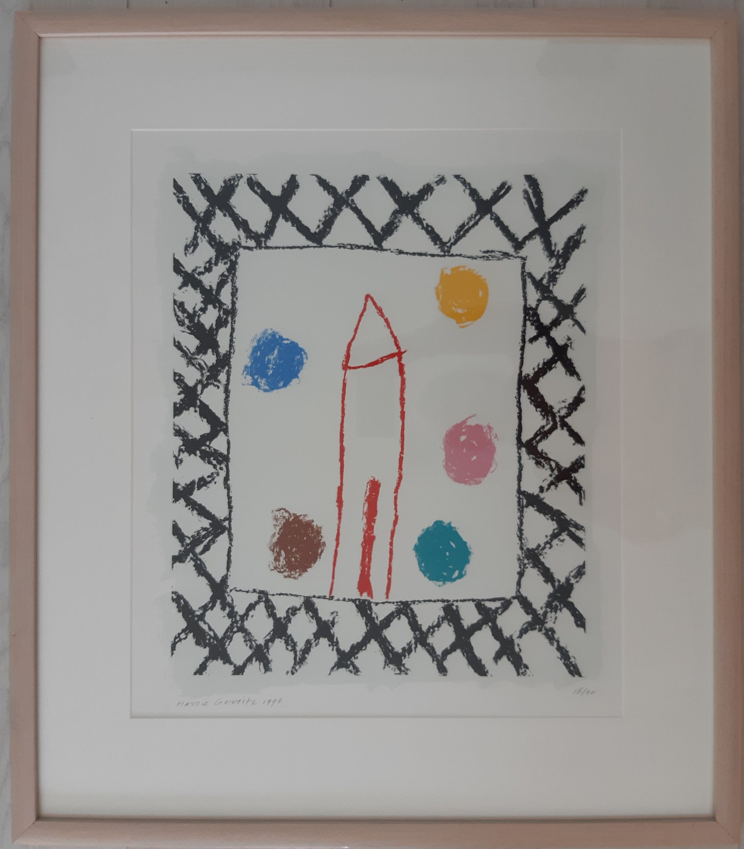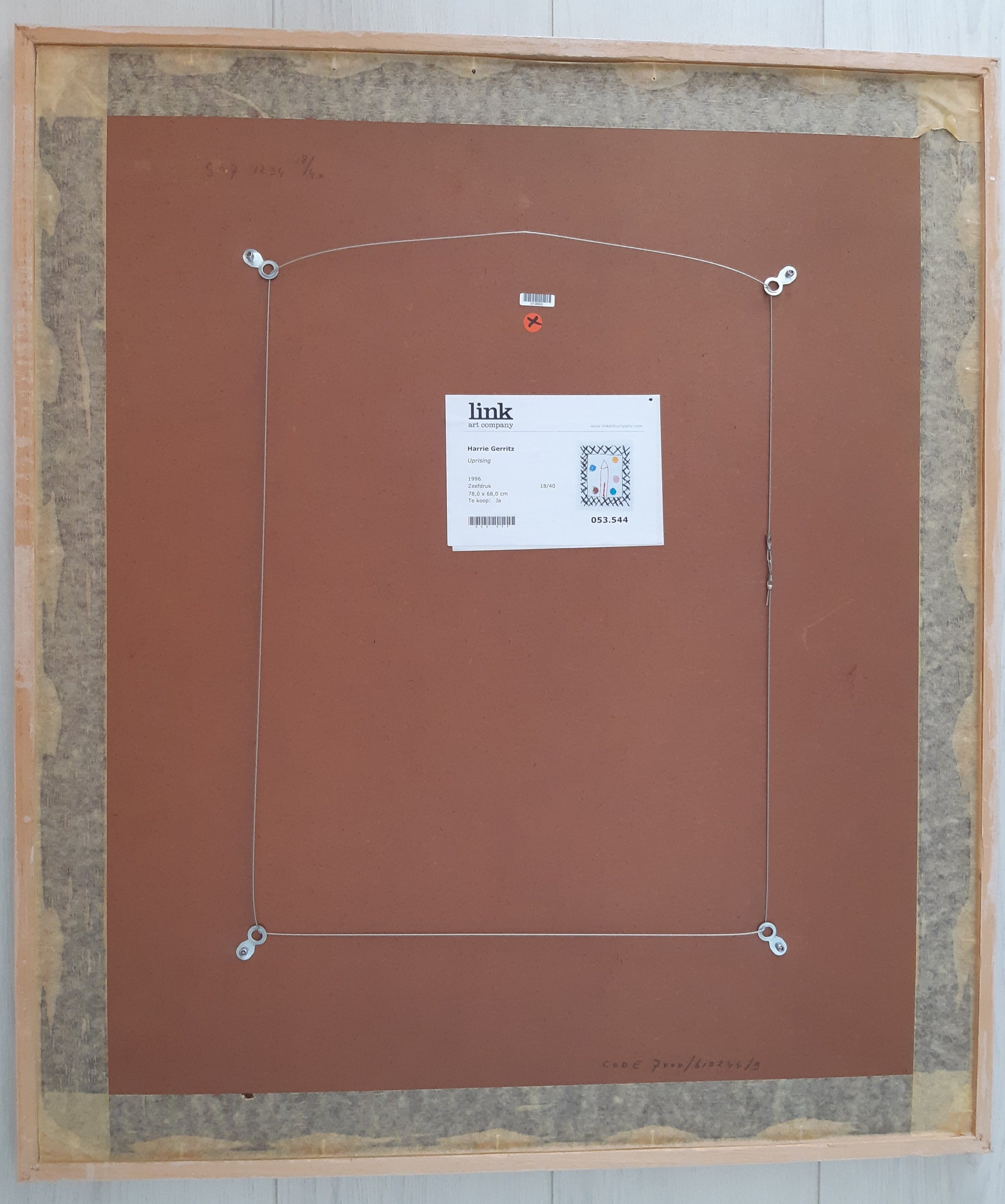 Zeefdruk van Harrie Gerritz. Met potlood door de maker gesigneerd, gedateerd en genummerd. Professioneel ingelijst in lichte houten lijst. Het geheel is in een uitstekende conditie. Op de foto's zijn reflecties zichtbaar.