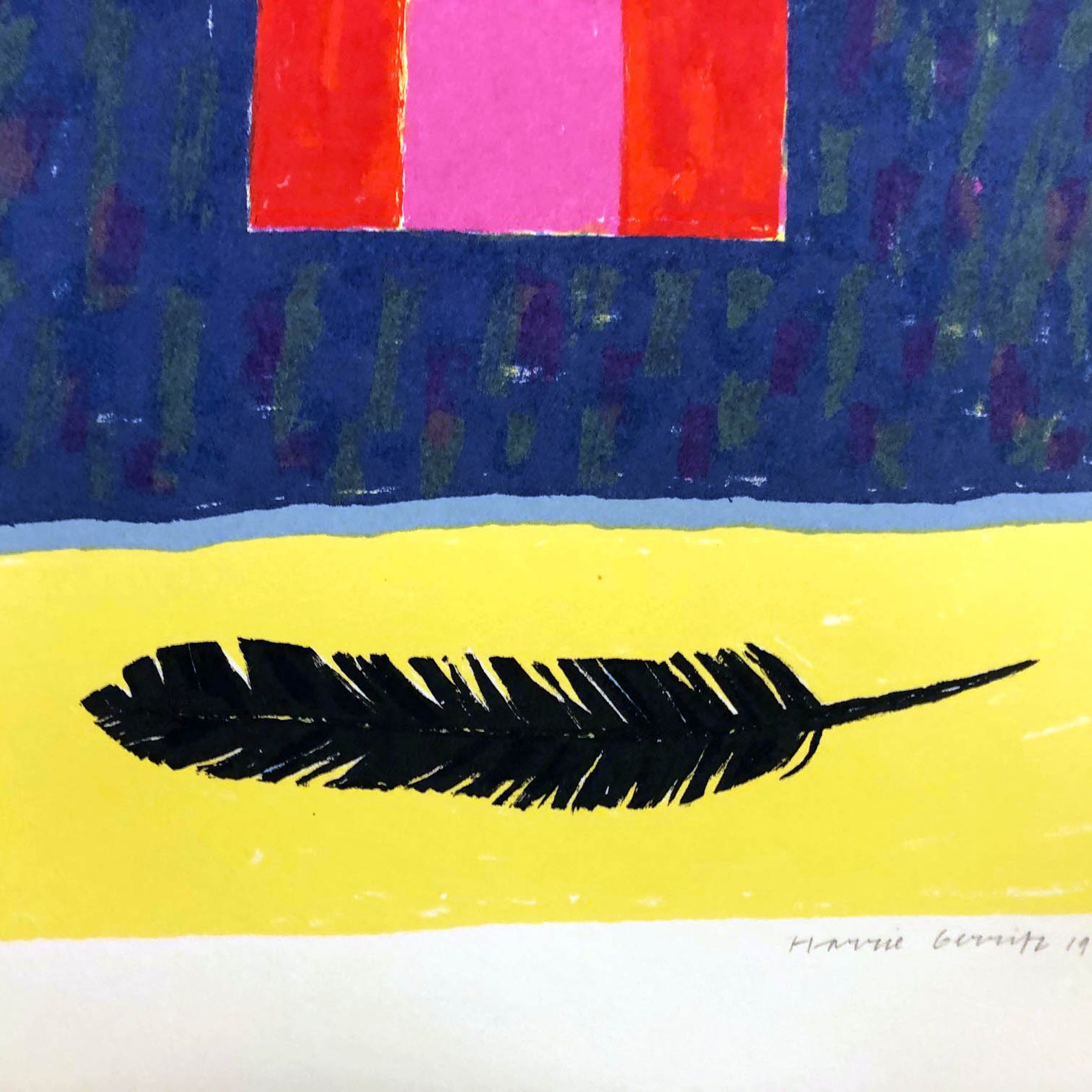 Een krachtig landschappelijk werk van Harrie Gerritz, met mooie symbolen als vogels, een regenboog en een rode toren. Beeldend kunstenaar Harrie Gerritz (1940, Wijchen) legt zich al meer dan 40 jaar toe op het weergeven van het landschap in al zijn verschijningsvormen. Zijn gestileerde beeldtaal is direct herkenbaar.