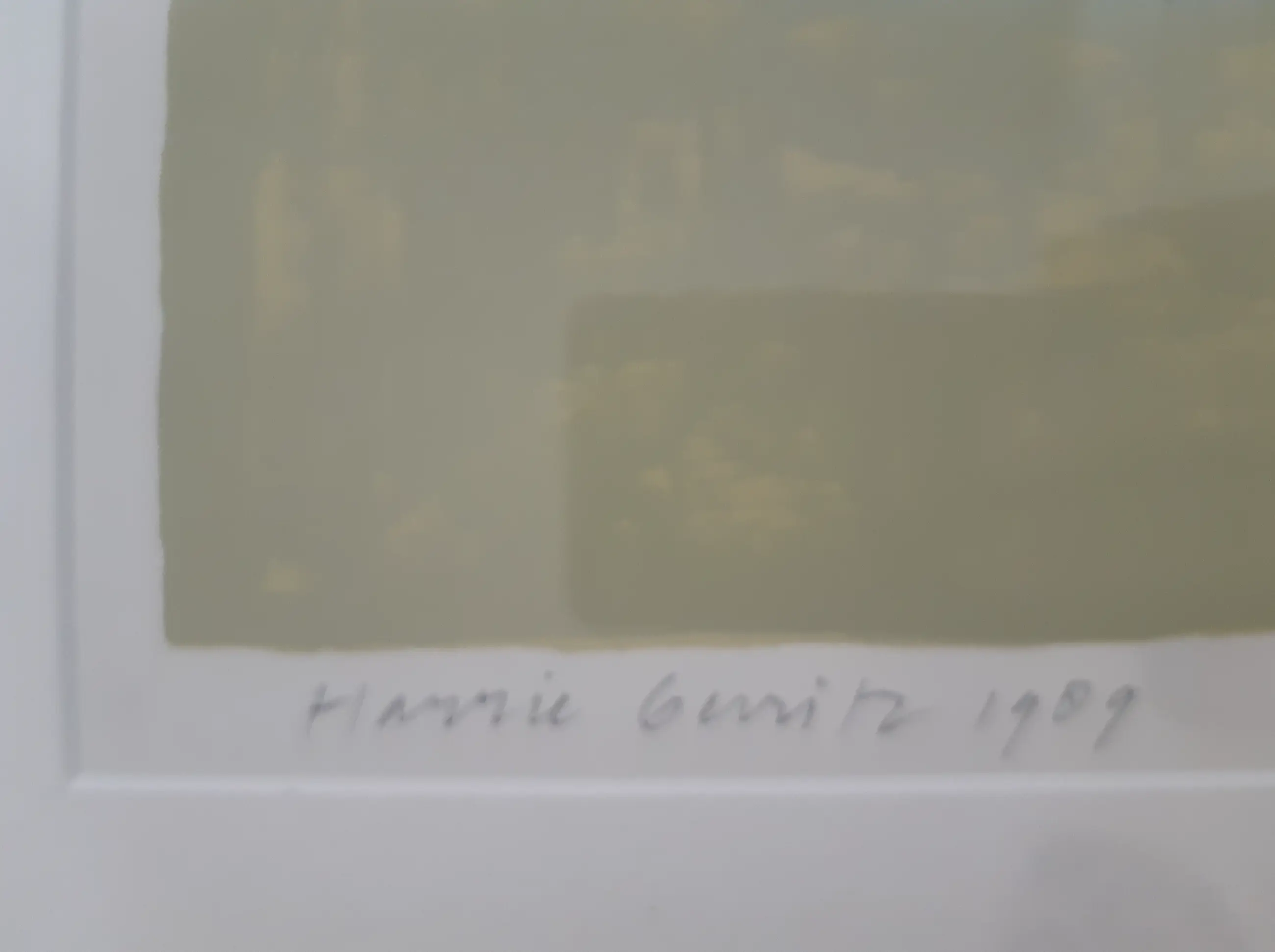 Grote zeefdruk van Harrie Gerritz. Met potlood door de maker gesigneerd, genummerd en gedateerd. Ingelijst in aluminium lijst. De conditie van het werk is uitstekend, het glas is linksboven nauwelijks zichtbaar beschadigd. Op de foto's zijn reflecties zichtbaar.