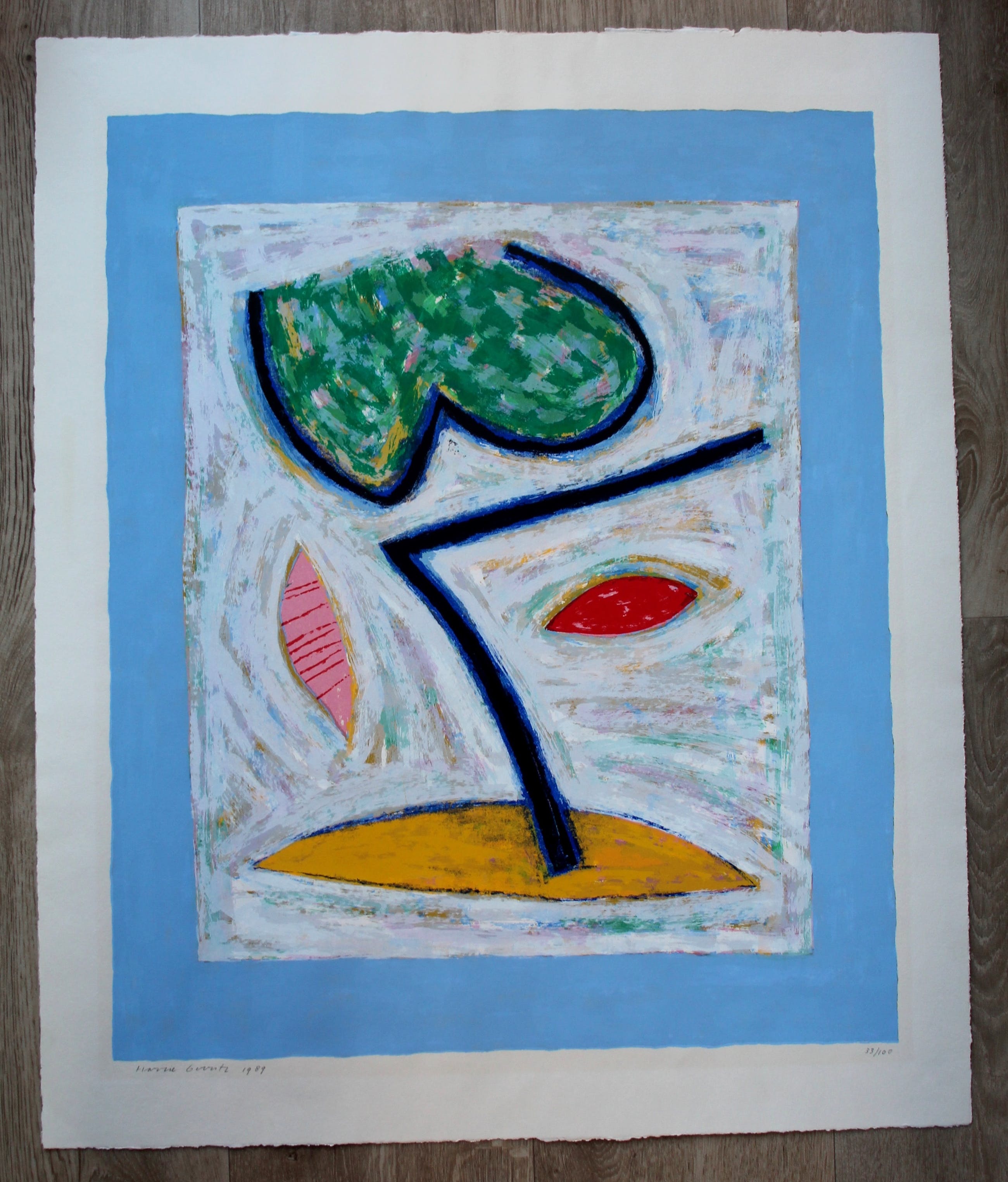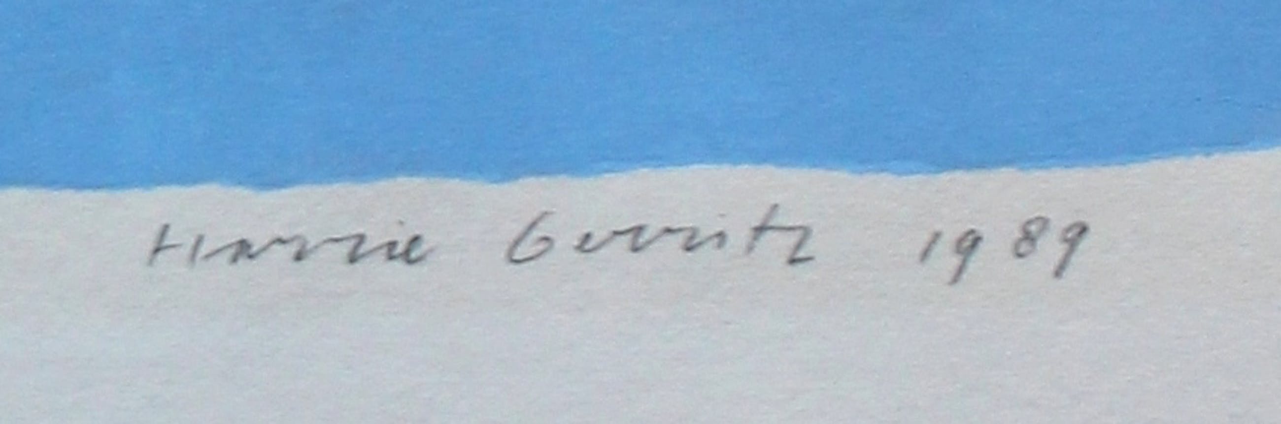 Zeefdruk van Harrie Gerritz uit 1989. Titel: Aarzelende herfst. Nummer: 33/100. Afmetingen blad: H74 x b61,5 cm. Afmetingen voorstelling: H63 x b52 cm. het werk is linksonder gesigneerd. De authenticiteit van dit werk wordt volledig gegarandeerd. Een certificaat van echtheid kan, op verzoek, worden gemaild.