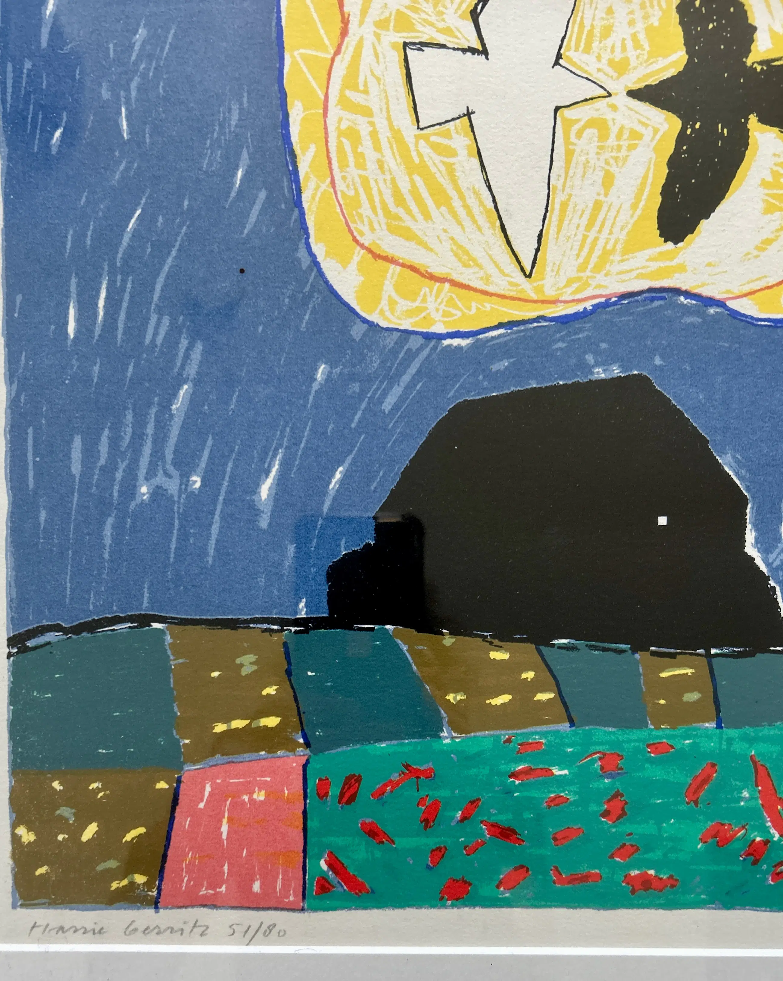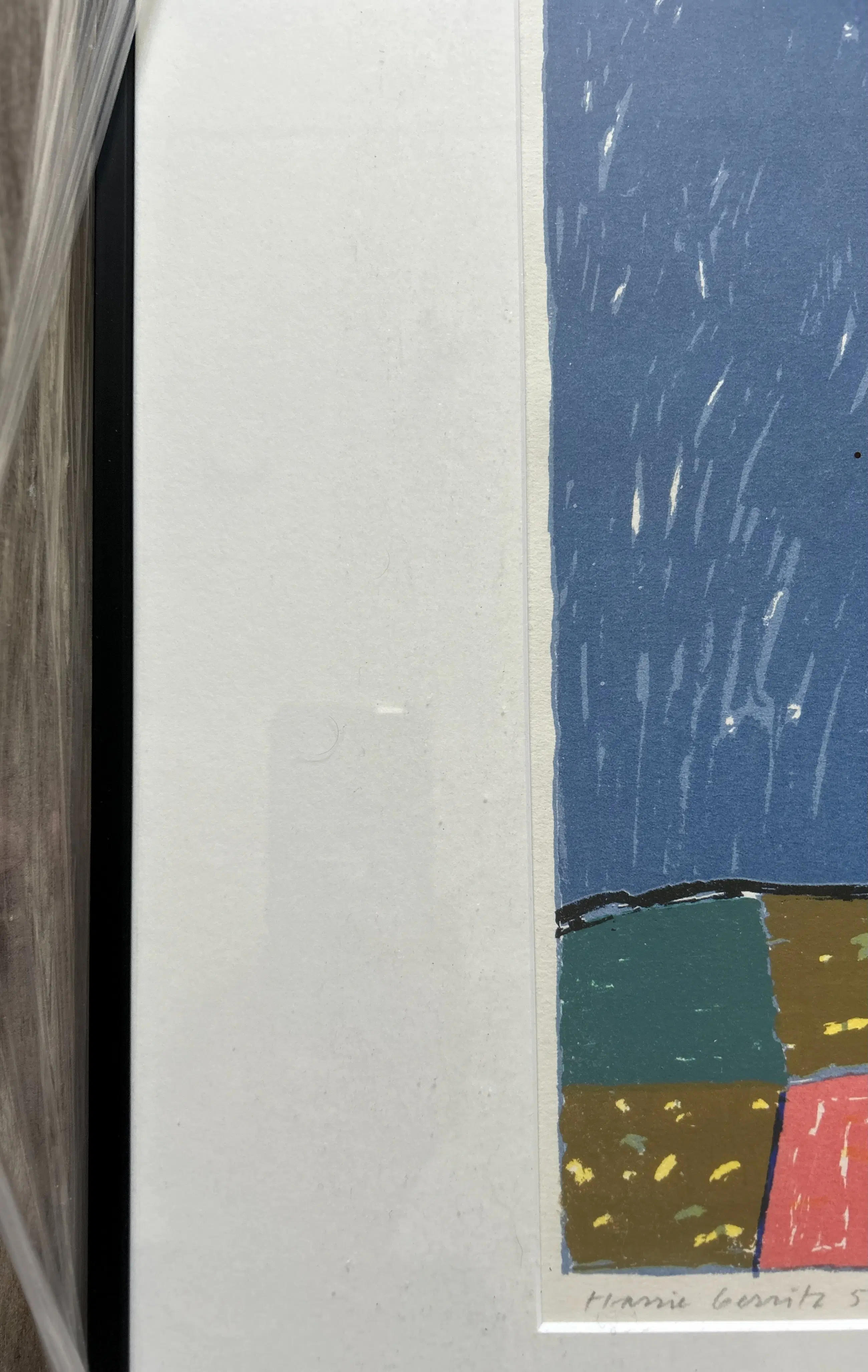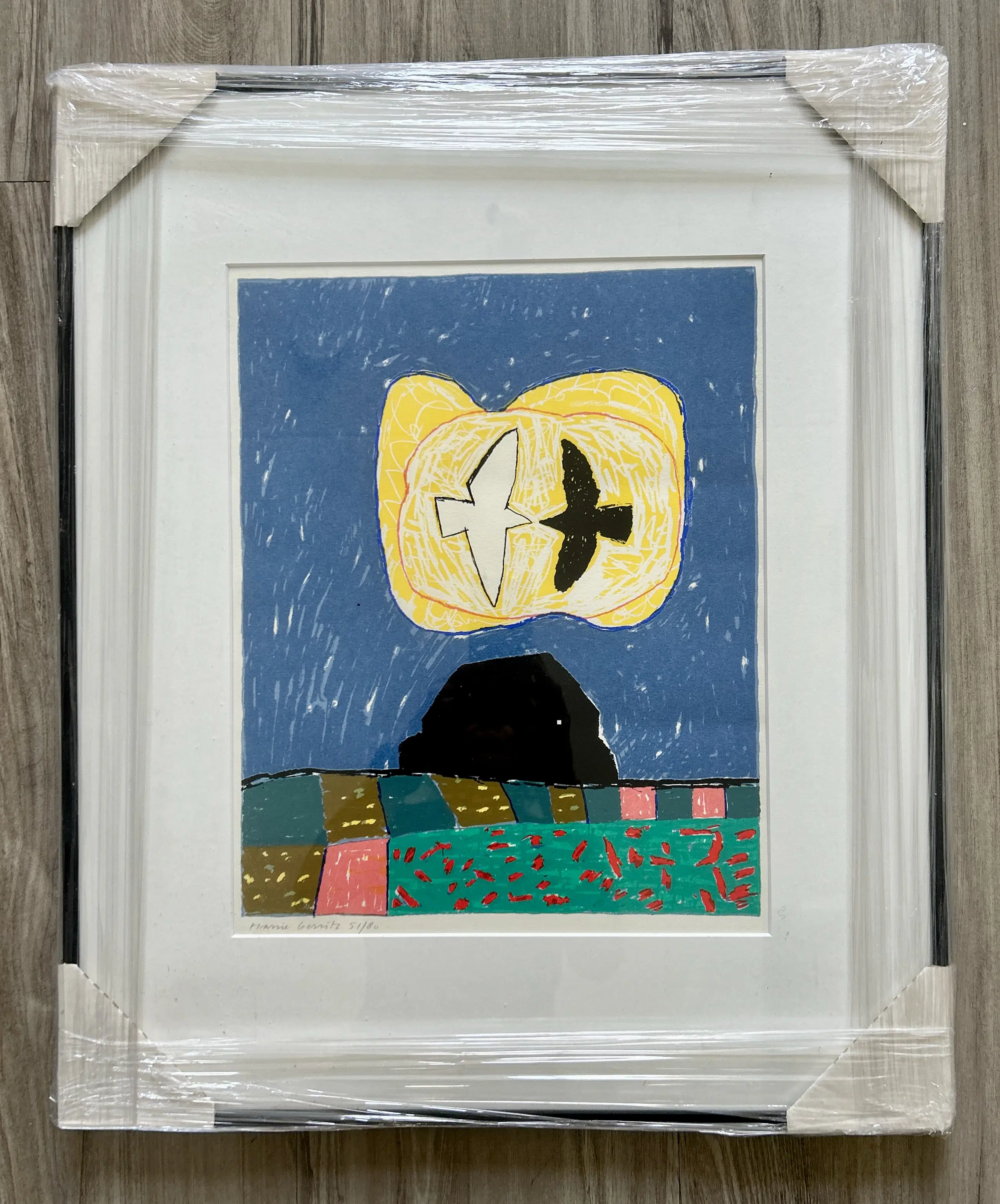 Conditie: uitstekend. Ingelijst achter glas in een zwarte lijst, lijst heeft lichte gebruikssporen. Weerspiegeling van mobiel op foto's. Oplage: 51/80.