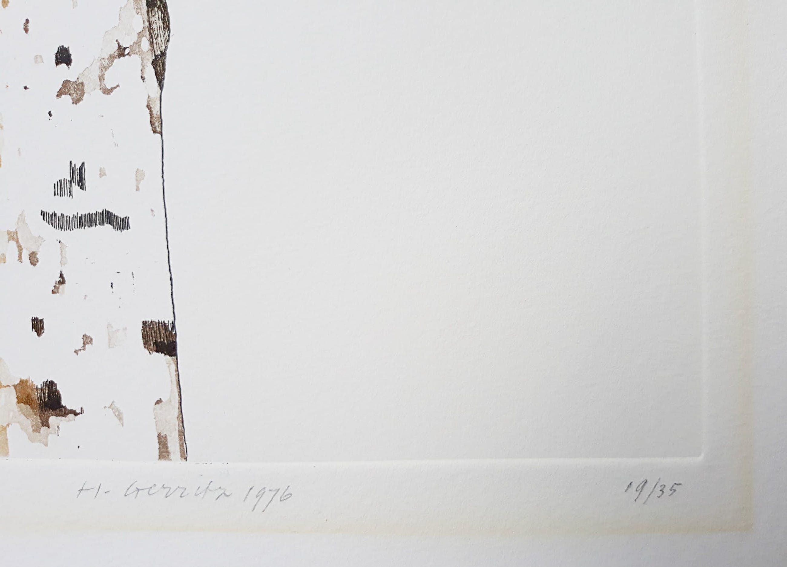 Mooi, stilistisch werk van Harrie Gerritz. Aquatint ets op papier, met potlood gesigneerd, gedateerd (1976), getiteld en genummerd (19/35). Afkomstig uit de kunstcollectie van ABNAMRO, in goede conditie. Blad heeft ingelijst gezeten en is licht verkleurd binnen een voormalig passe-partout. Opnieuw ingelijst met passe-partout valt dit niet op en is het werk uitstekend.
