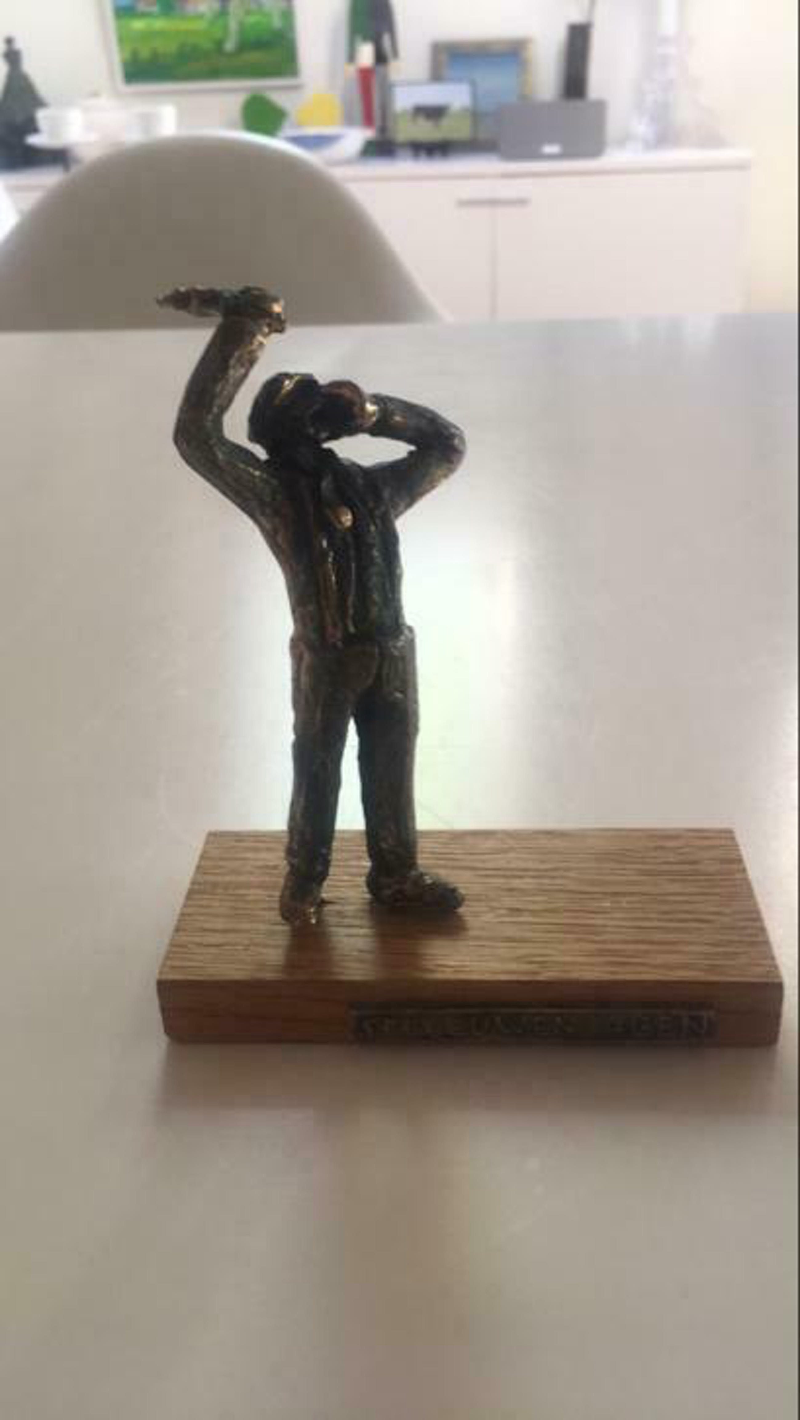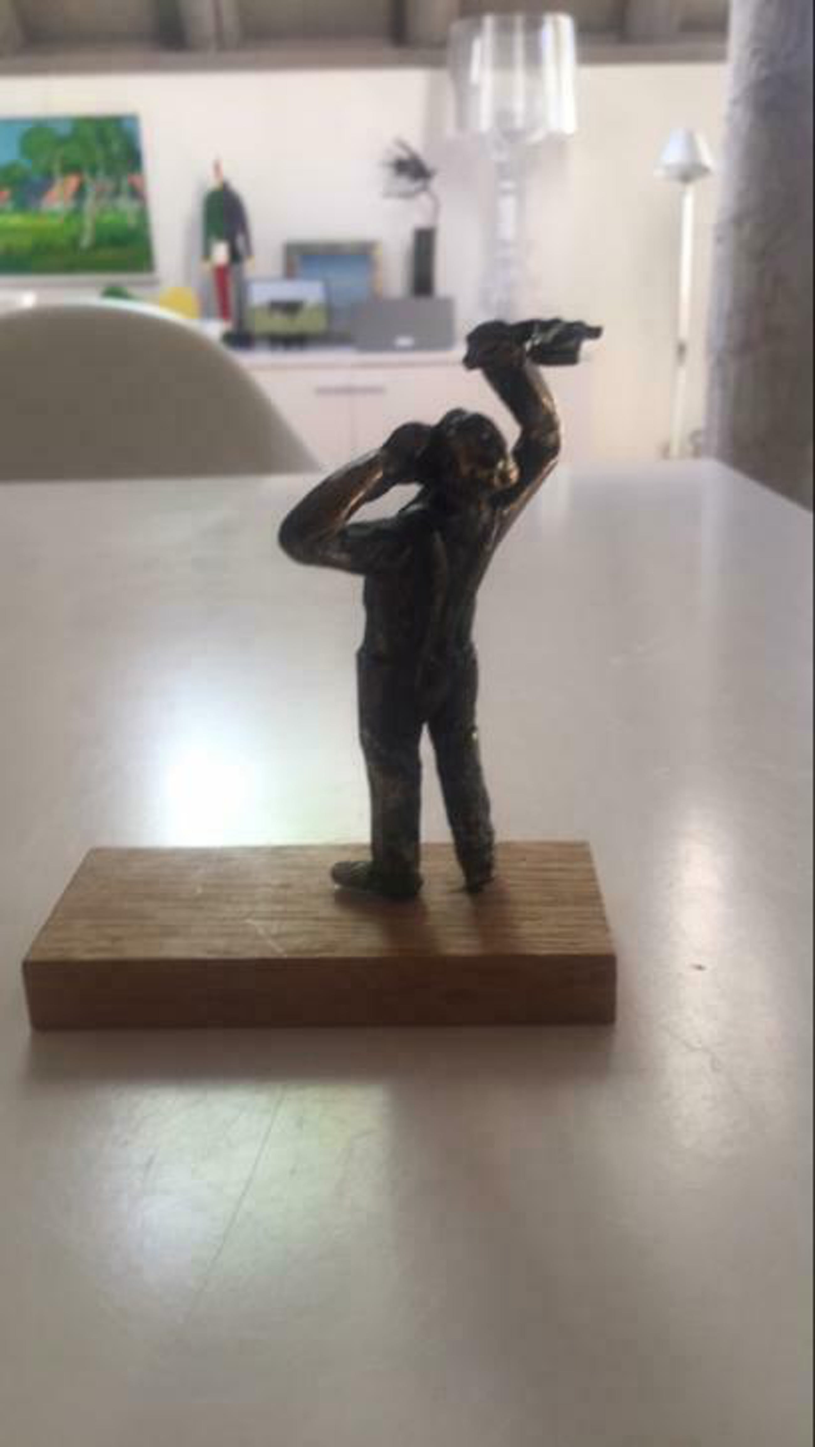 Op de onderkant van het beeldje zit een sticker met nummer en handtekening van de kunstenaar.