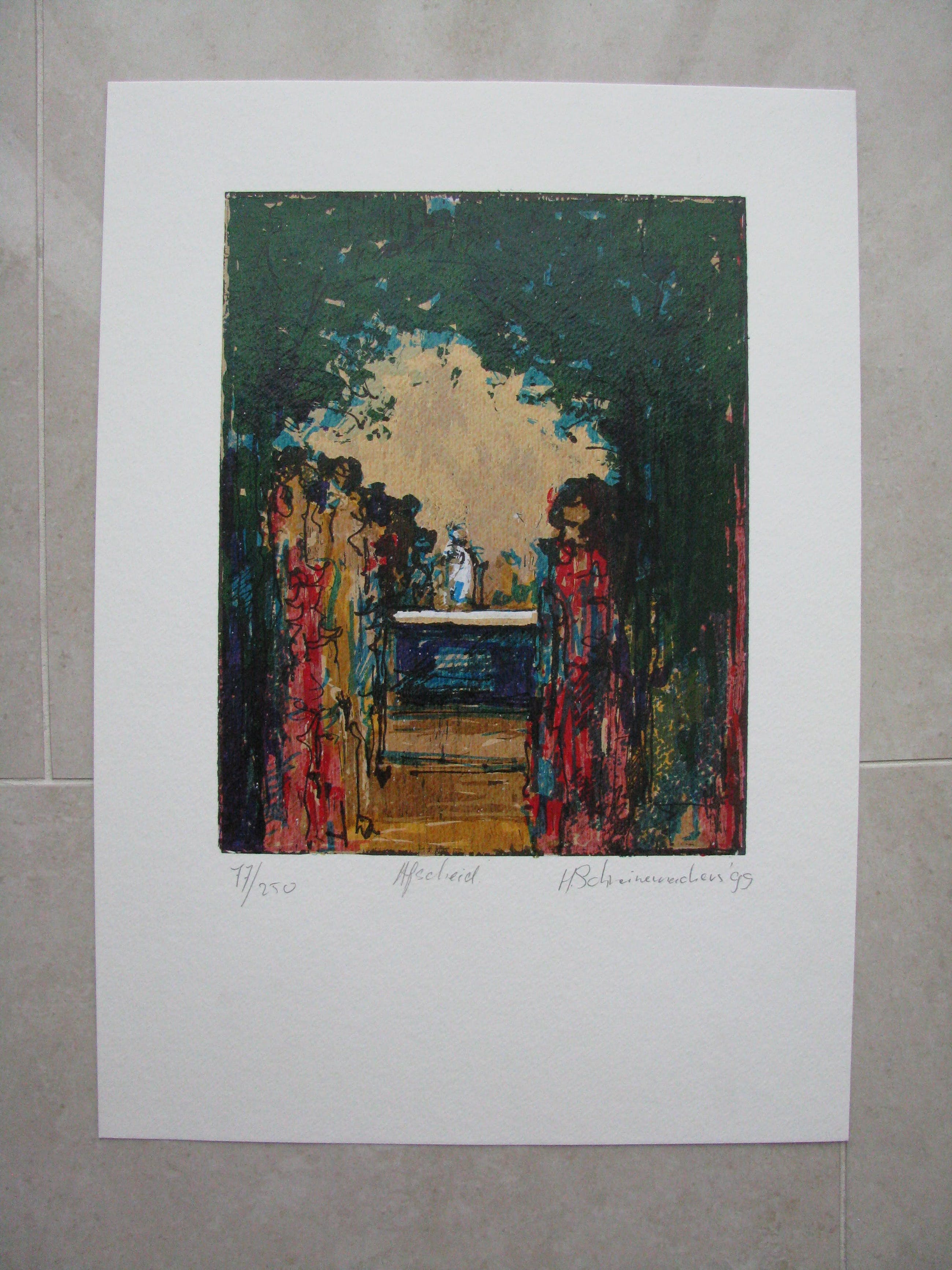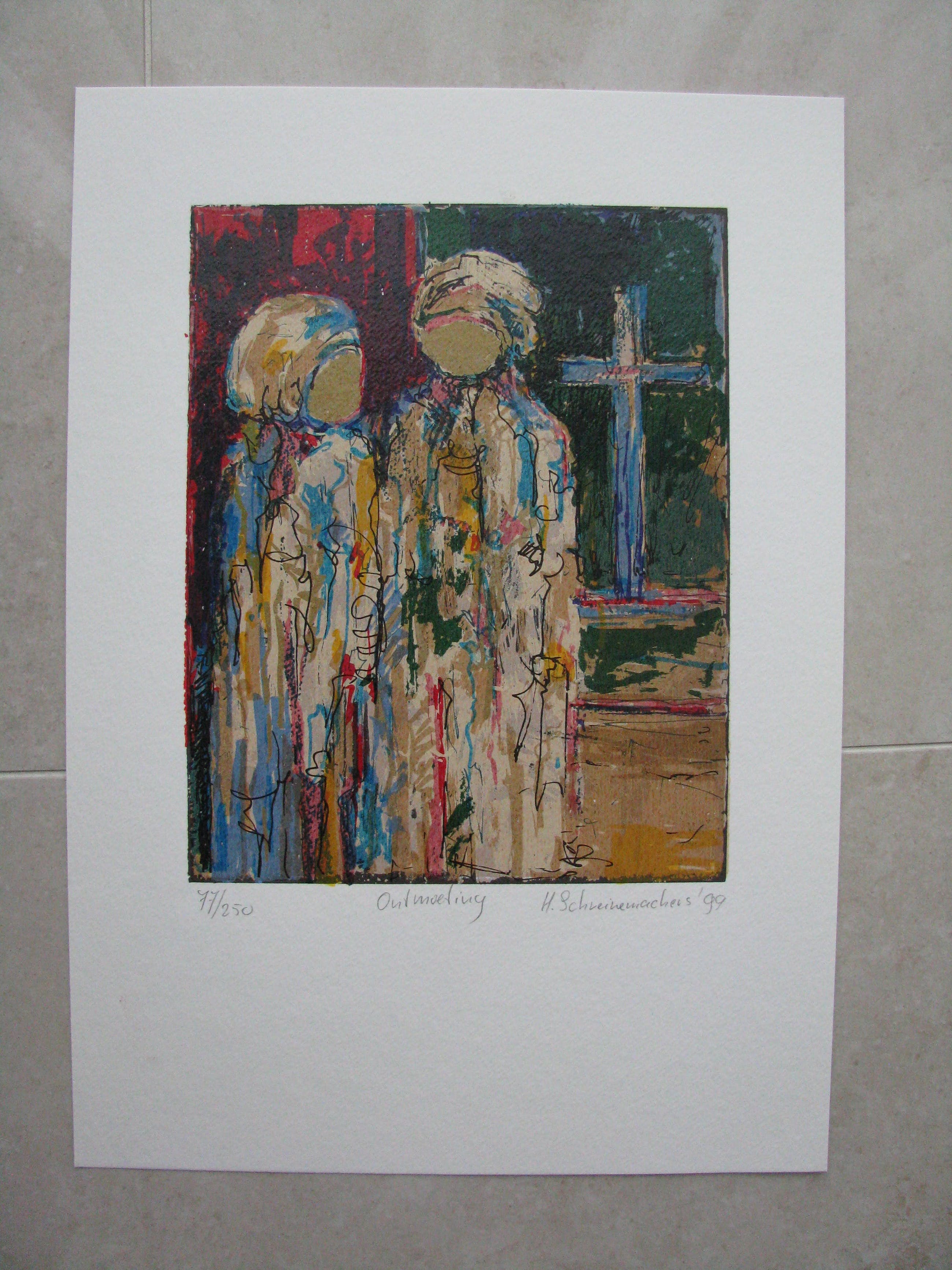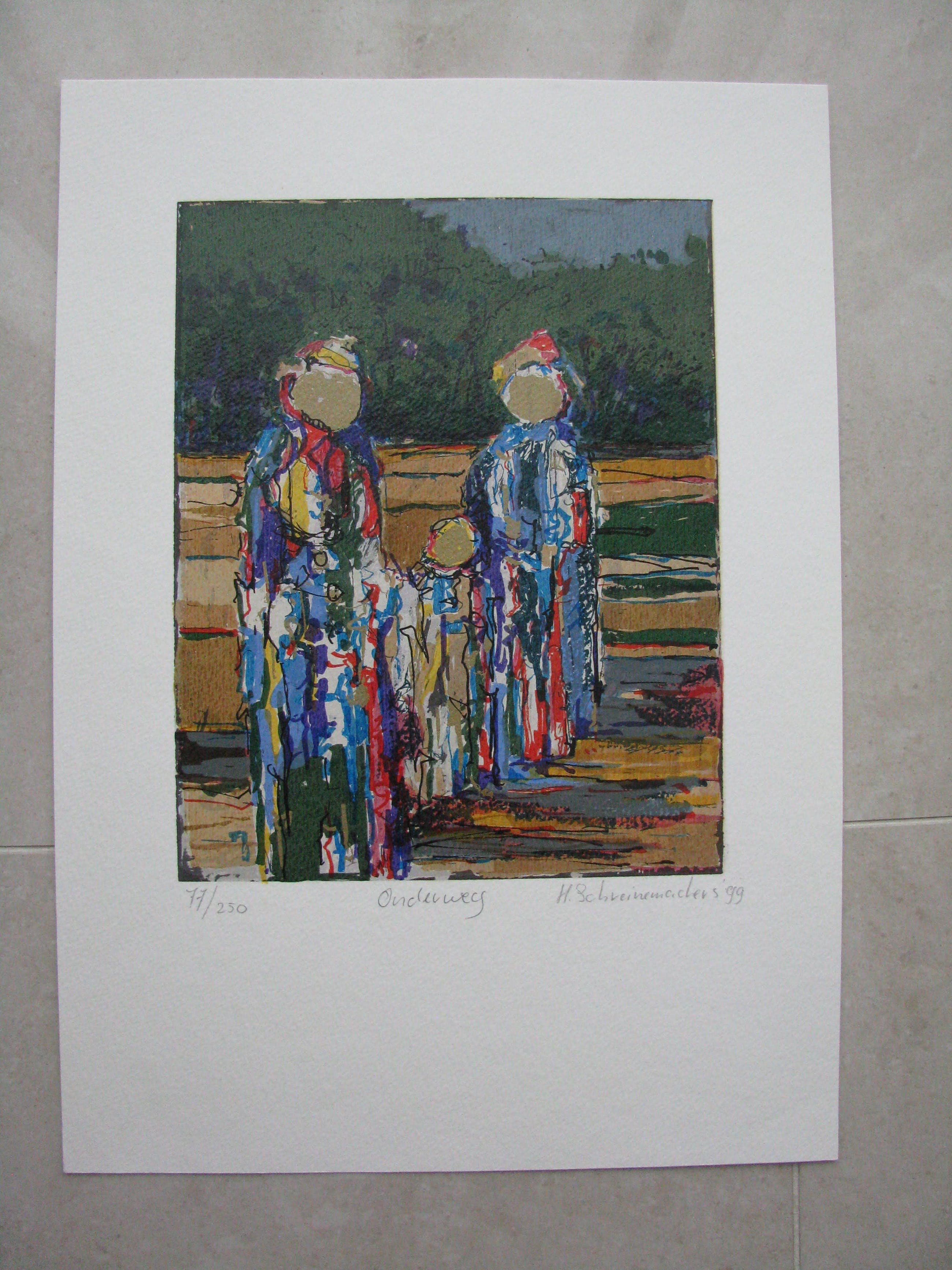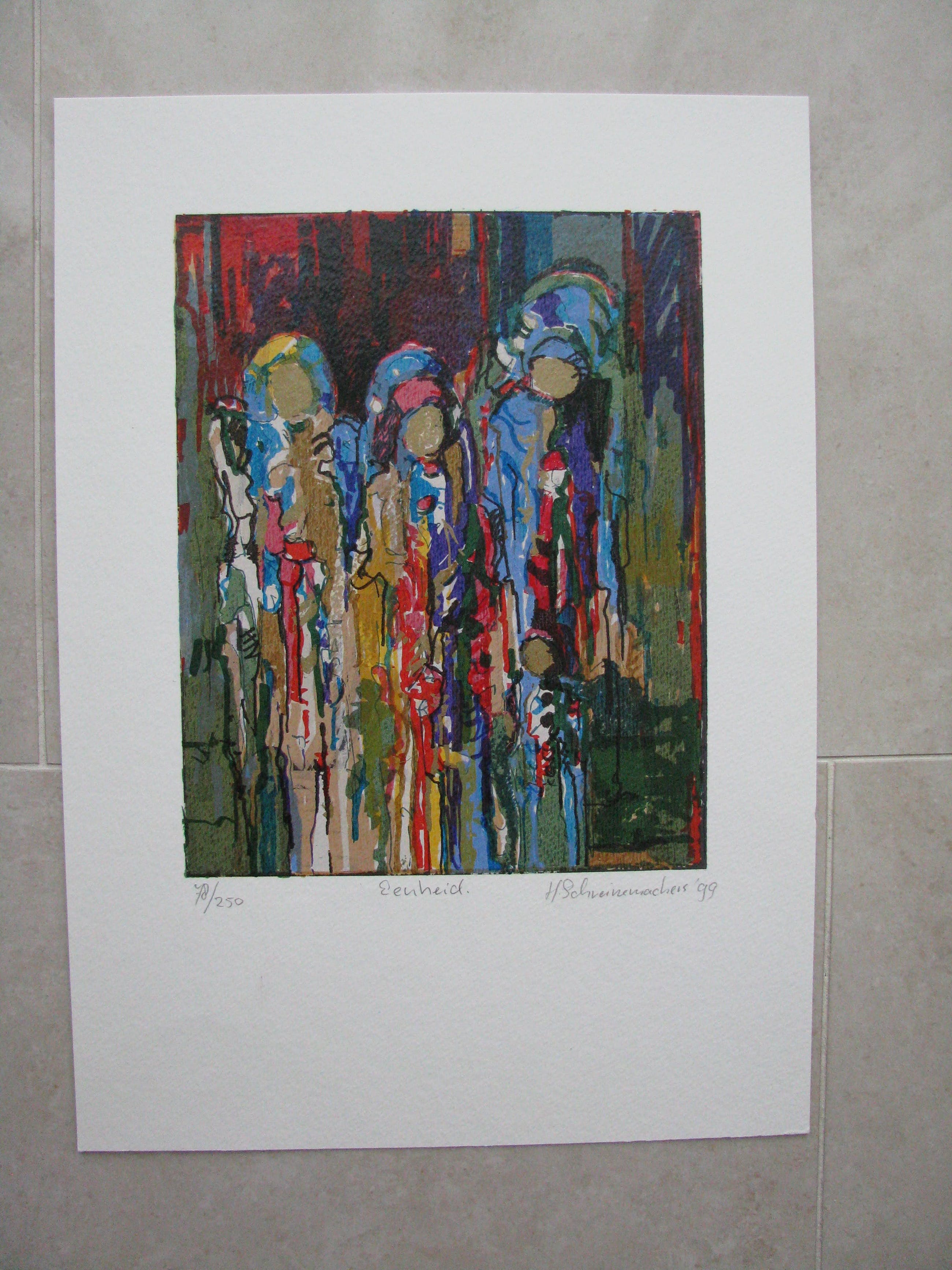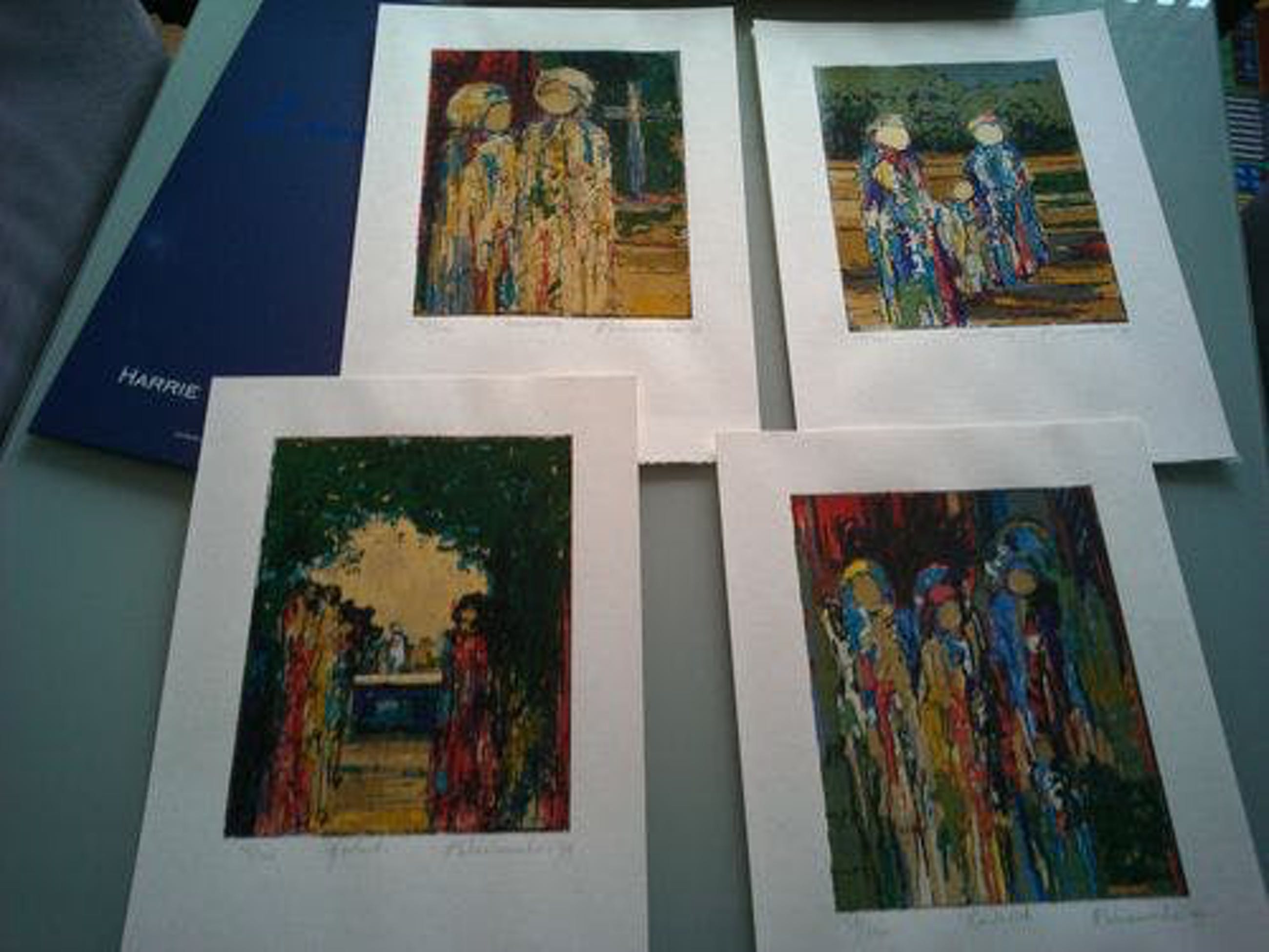 4 prachtige gesigneerde zeefdrukken van Harrie Schreinemachers.Formaat 40 x 50 cm.Getiteld: Onderweg - Eenheid - Ontmoeting - Afscheid.Inclusief bewaarmap Levenspassie