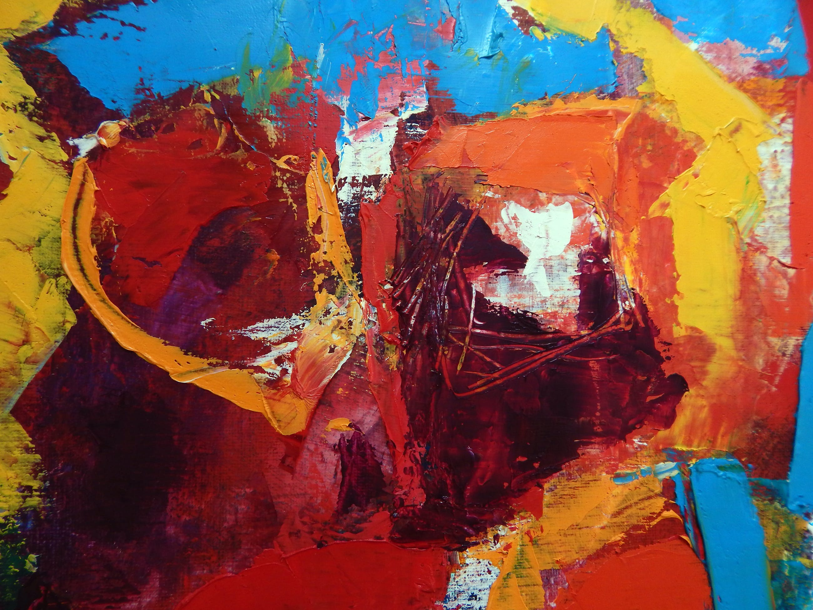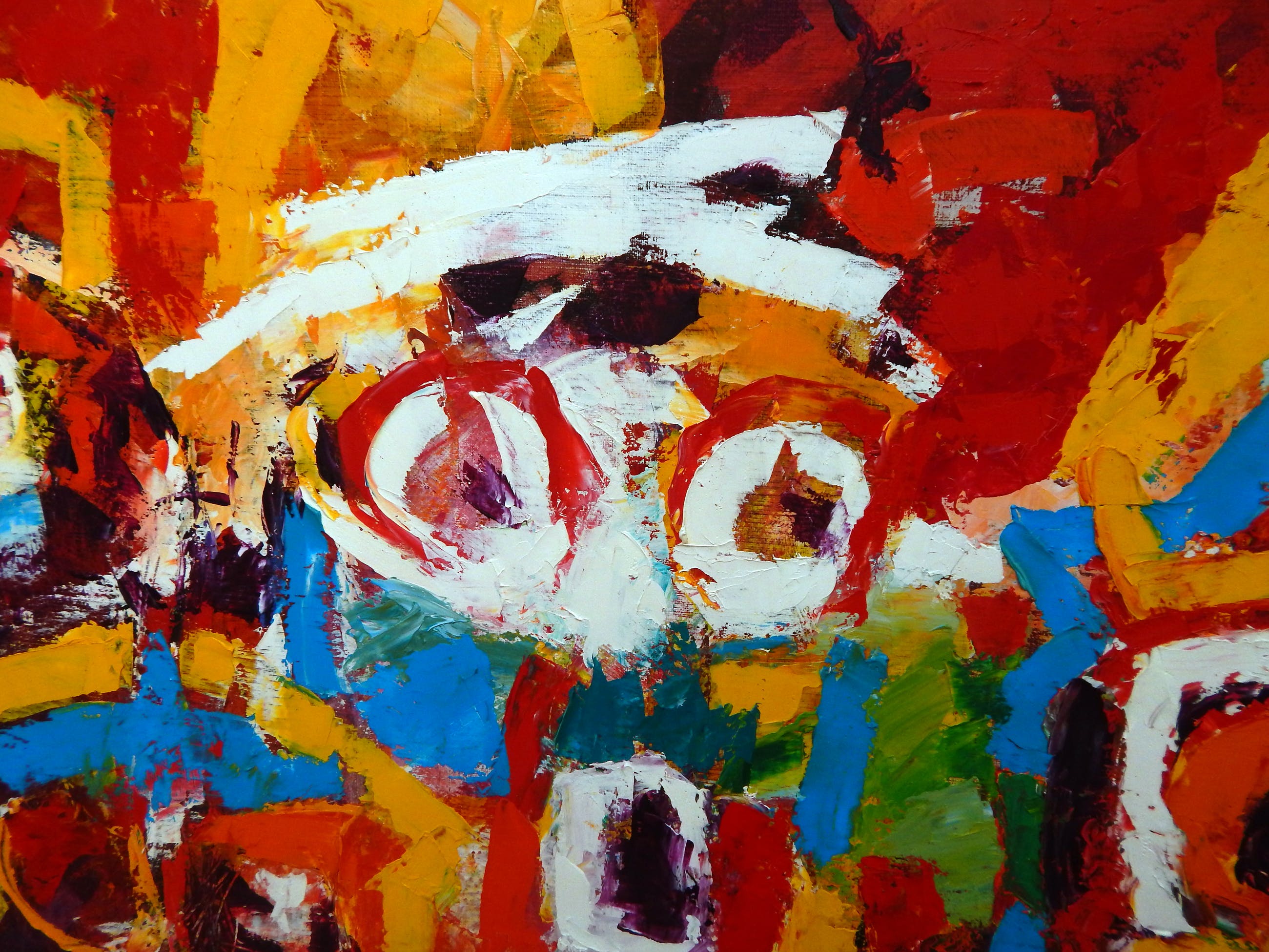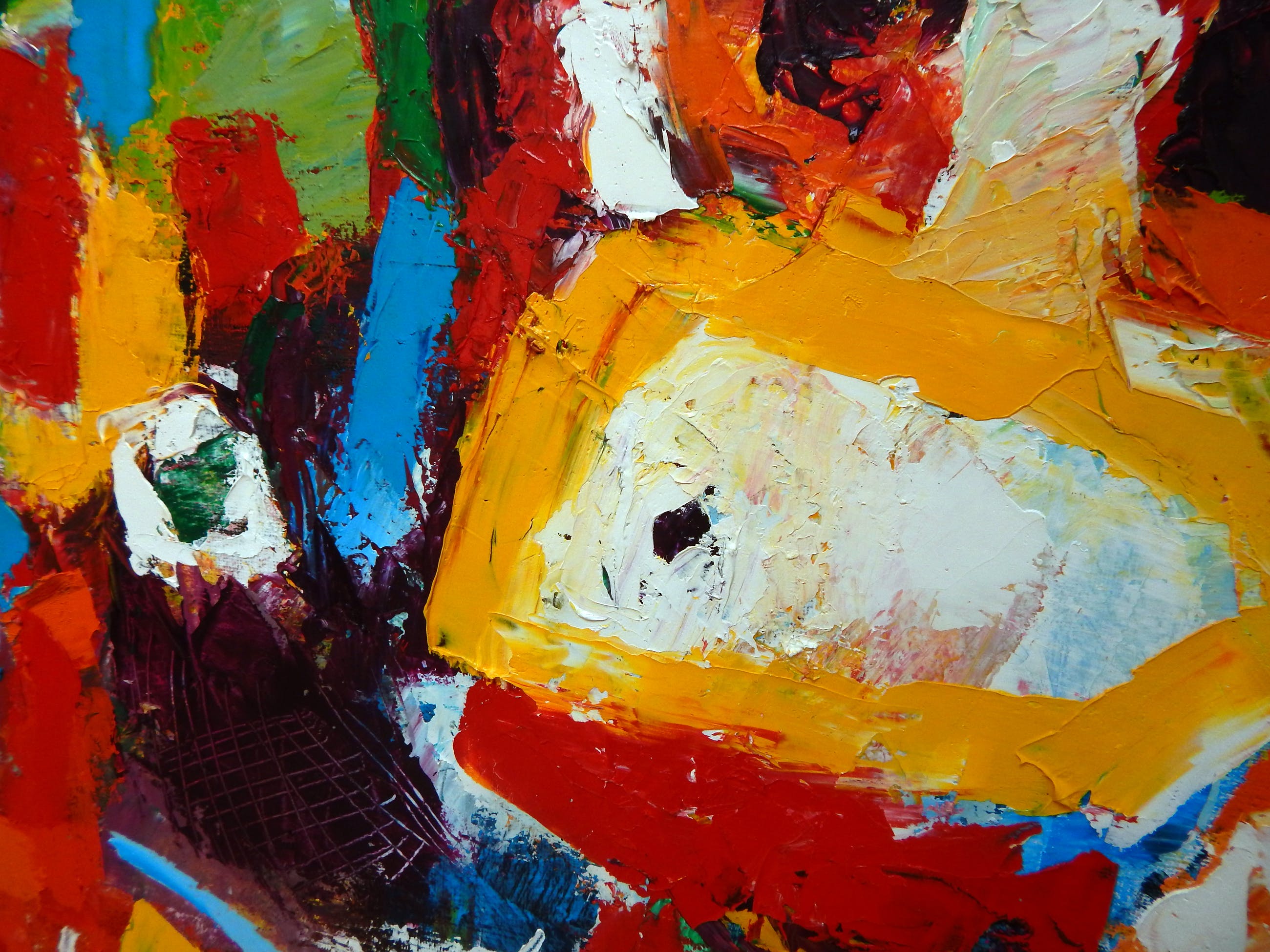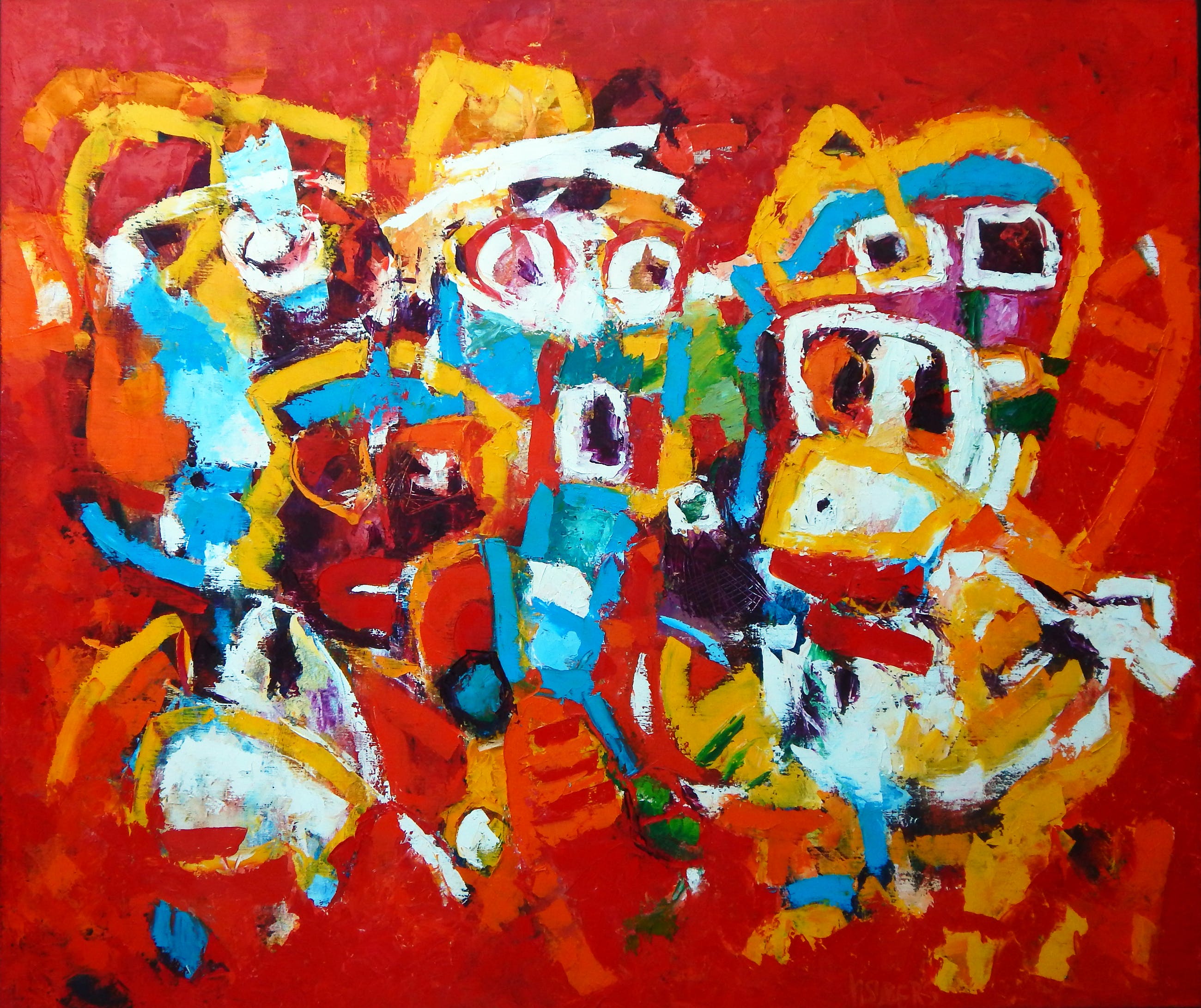 Allerlei abstracte figuren, olieverf op linnen, dikke olieverf met mooie structuren. Vrolijk schilderij, professionele materialen. Aluminium frame met linnen en verstelbaar ophangkoord.