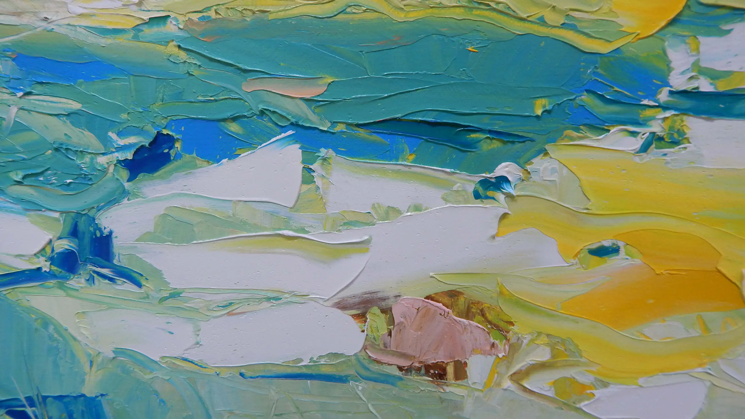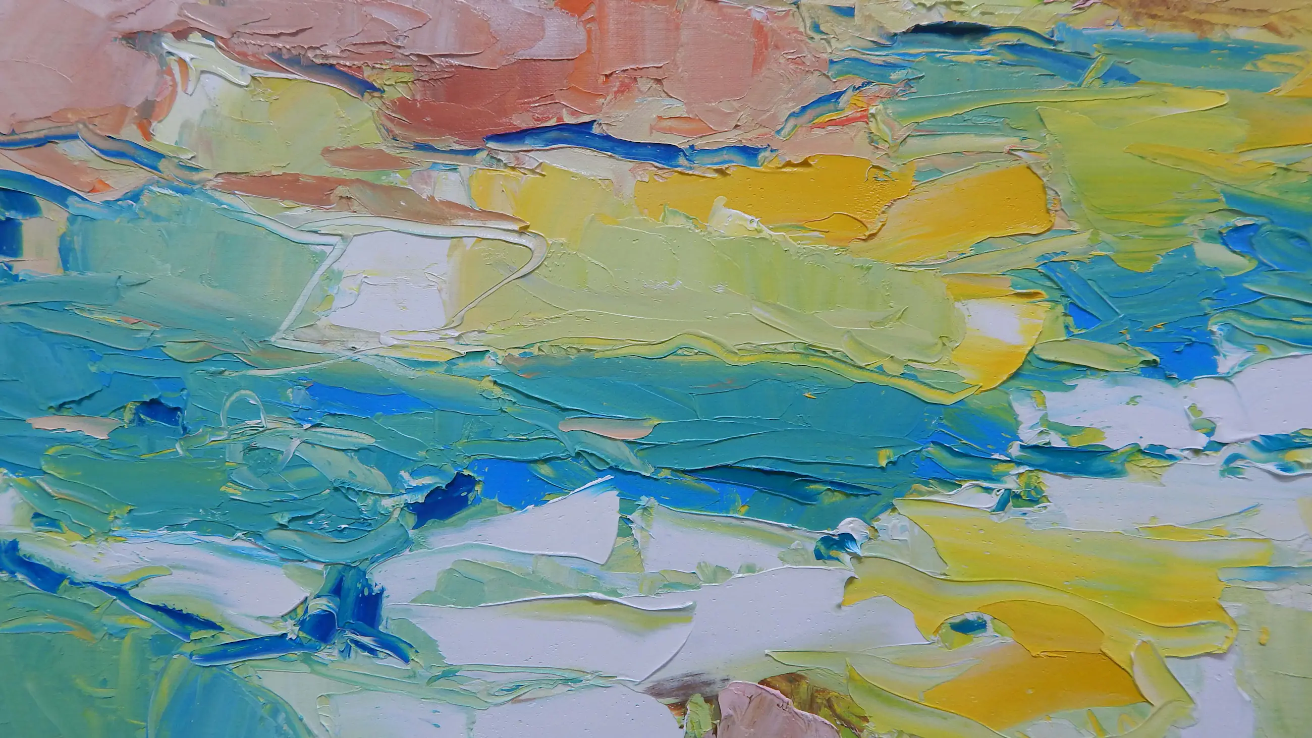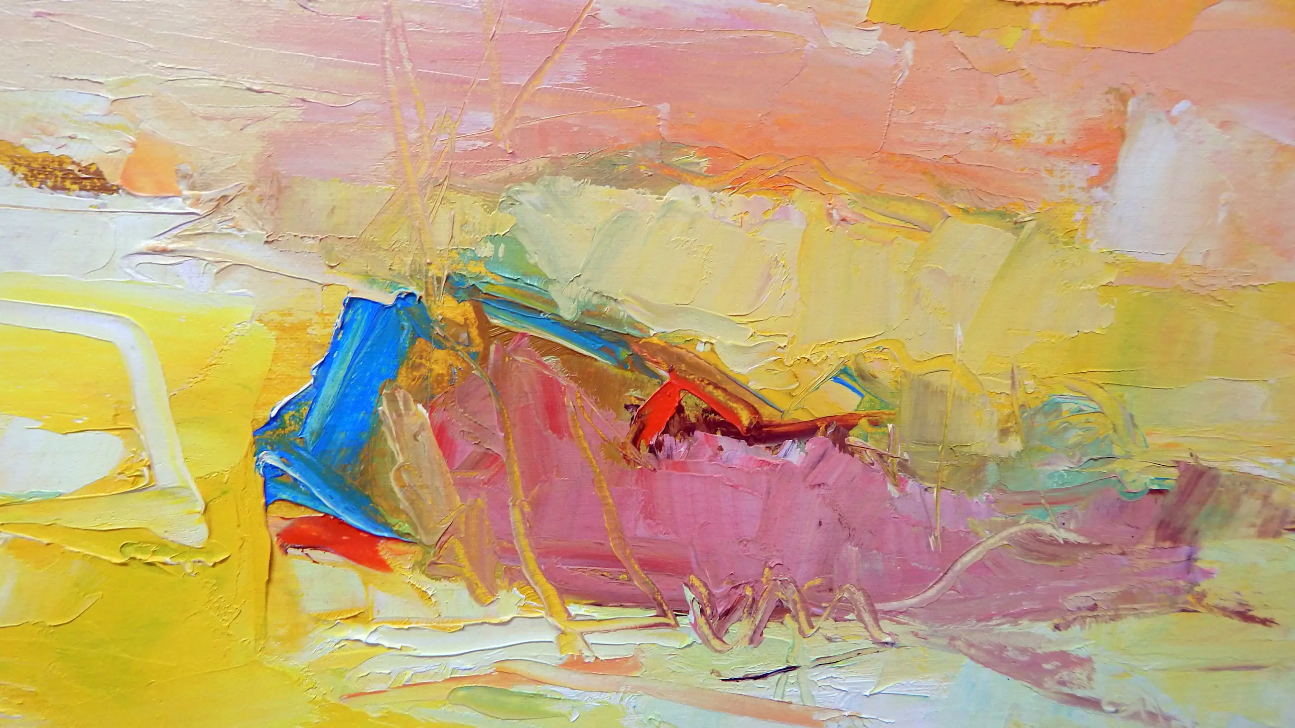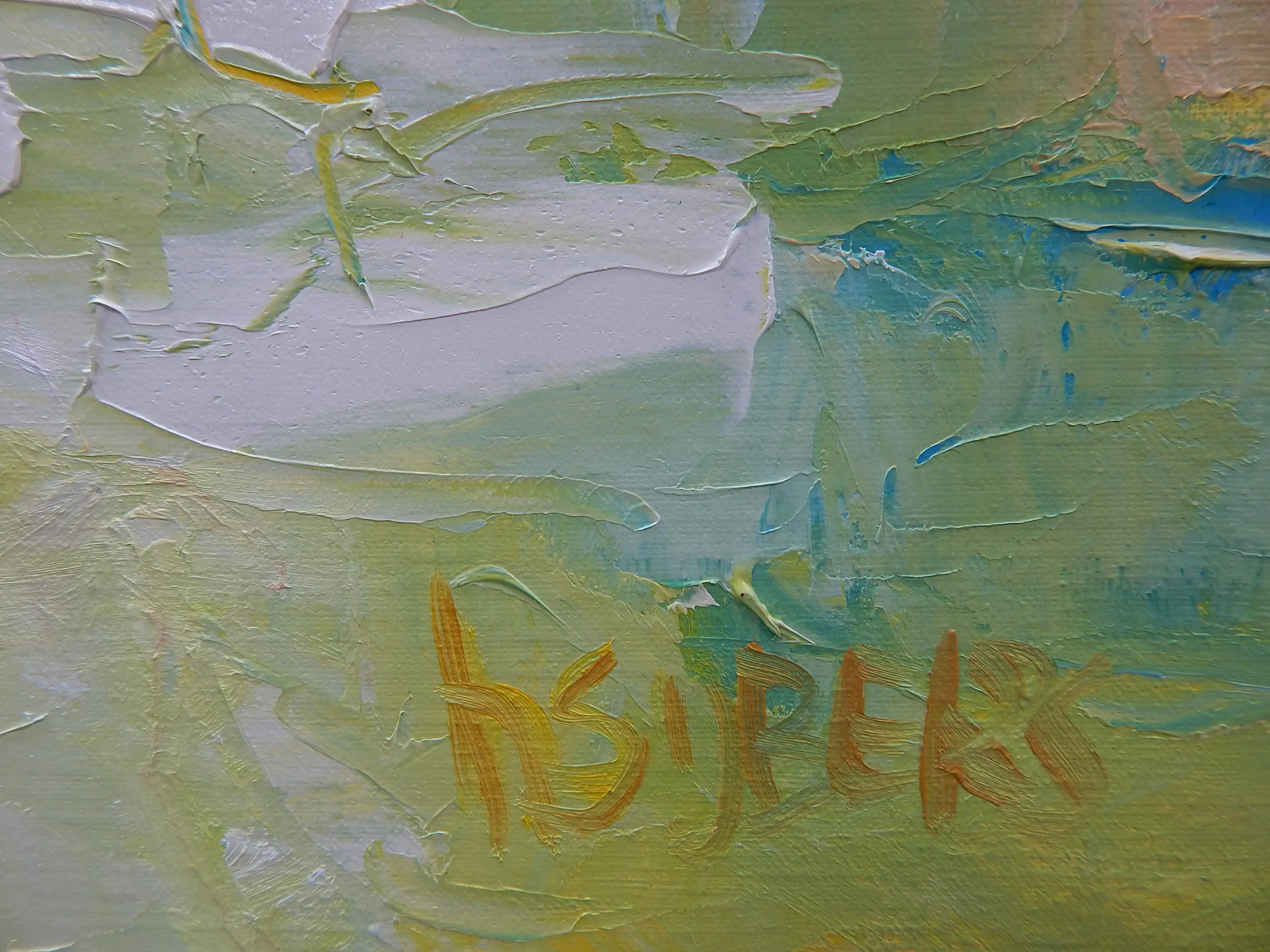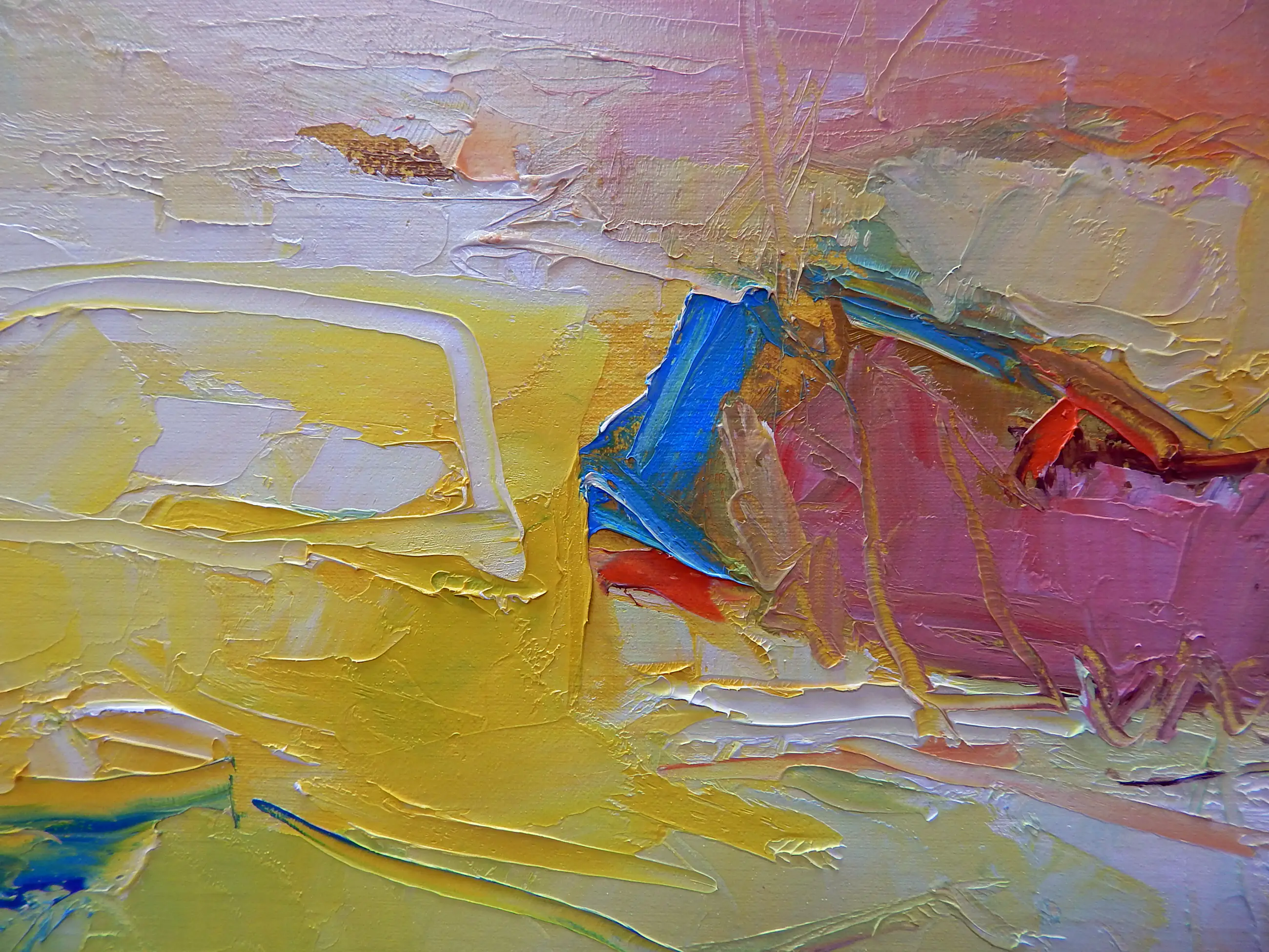 In de morgen Harrie Sijbers (Sint-Oedenrode, 1953) Olieverf op linnen, 100 × 100 cm Licht en verstild schilderij waarin zachte kleurvlakken en gelaagde verfstreken een vroege ochtendsfeer oproepen. Het werk ademt rust en ruimte, met een subtiele balans tussen landschap en abstractie. Galerieprijs 250, gereed om op te hangen