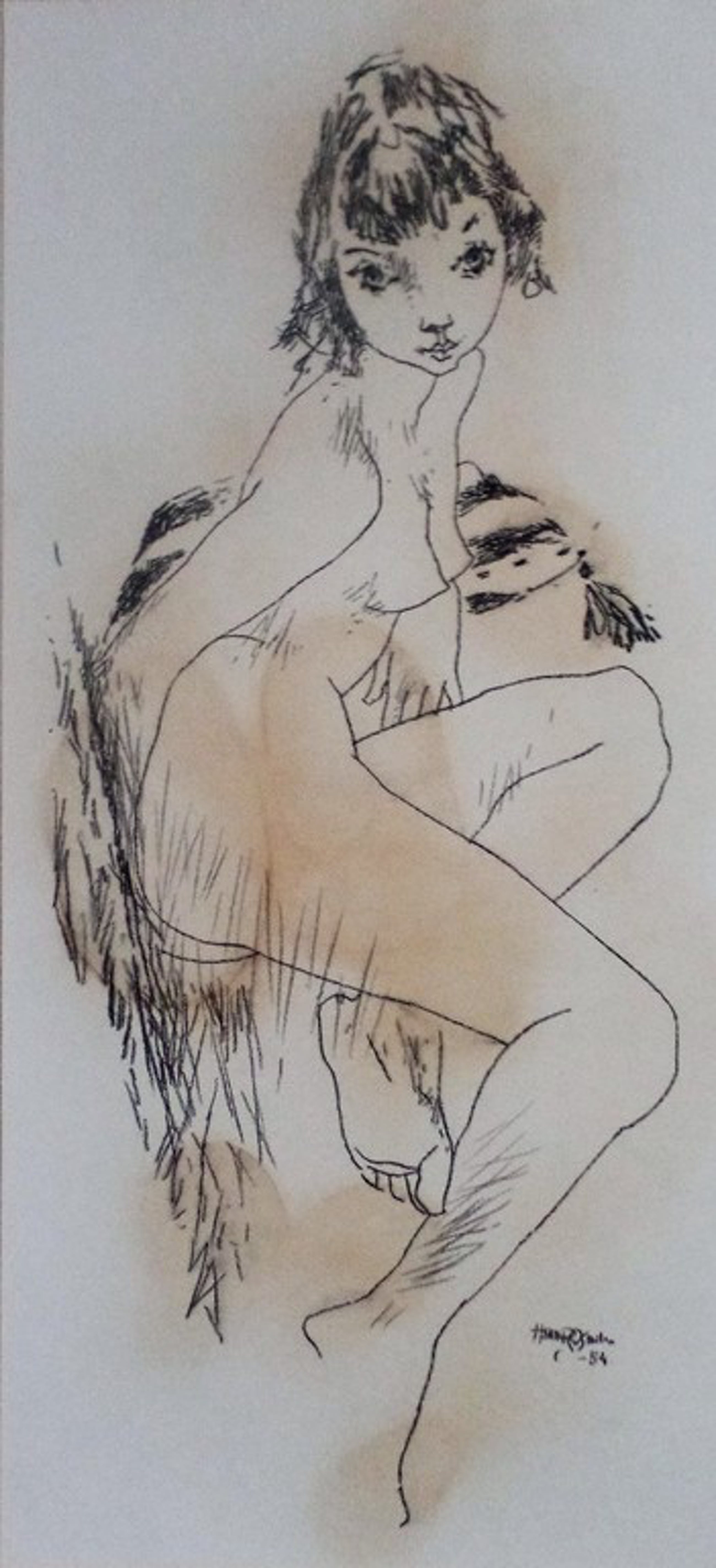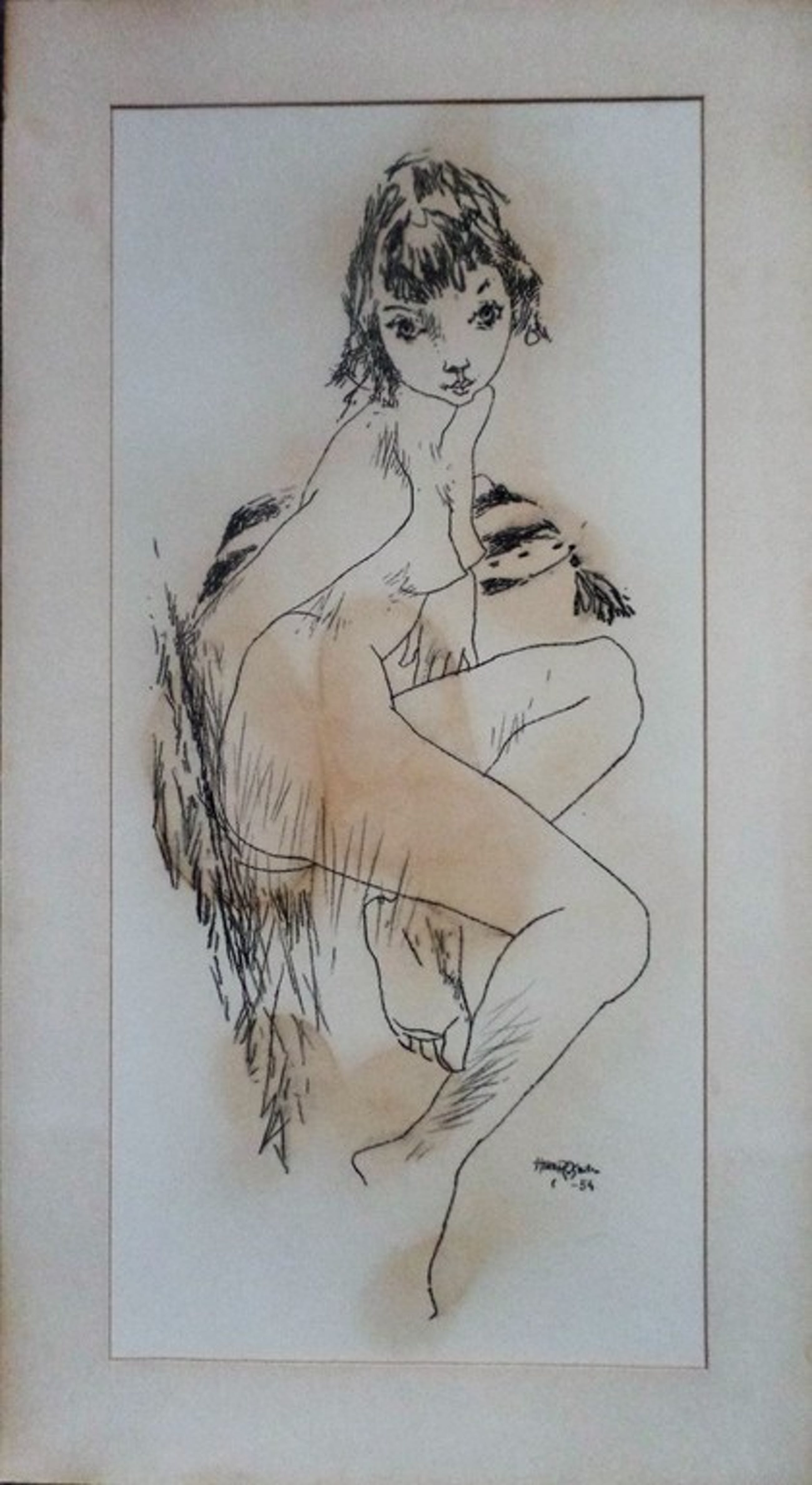 Tekening met passepartout opgeplakt op karton ( zuurvlekken )