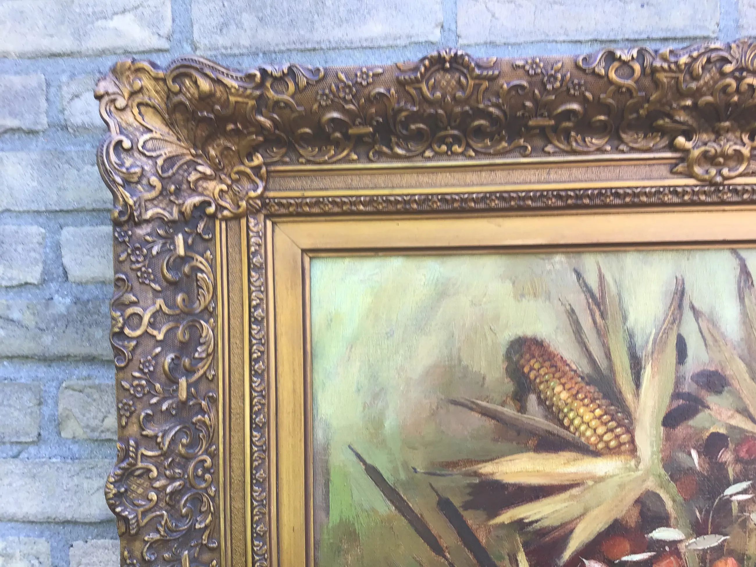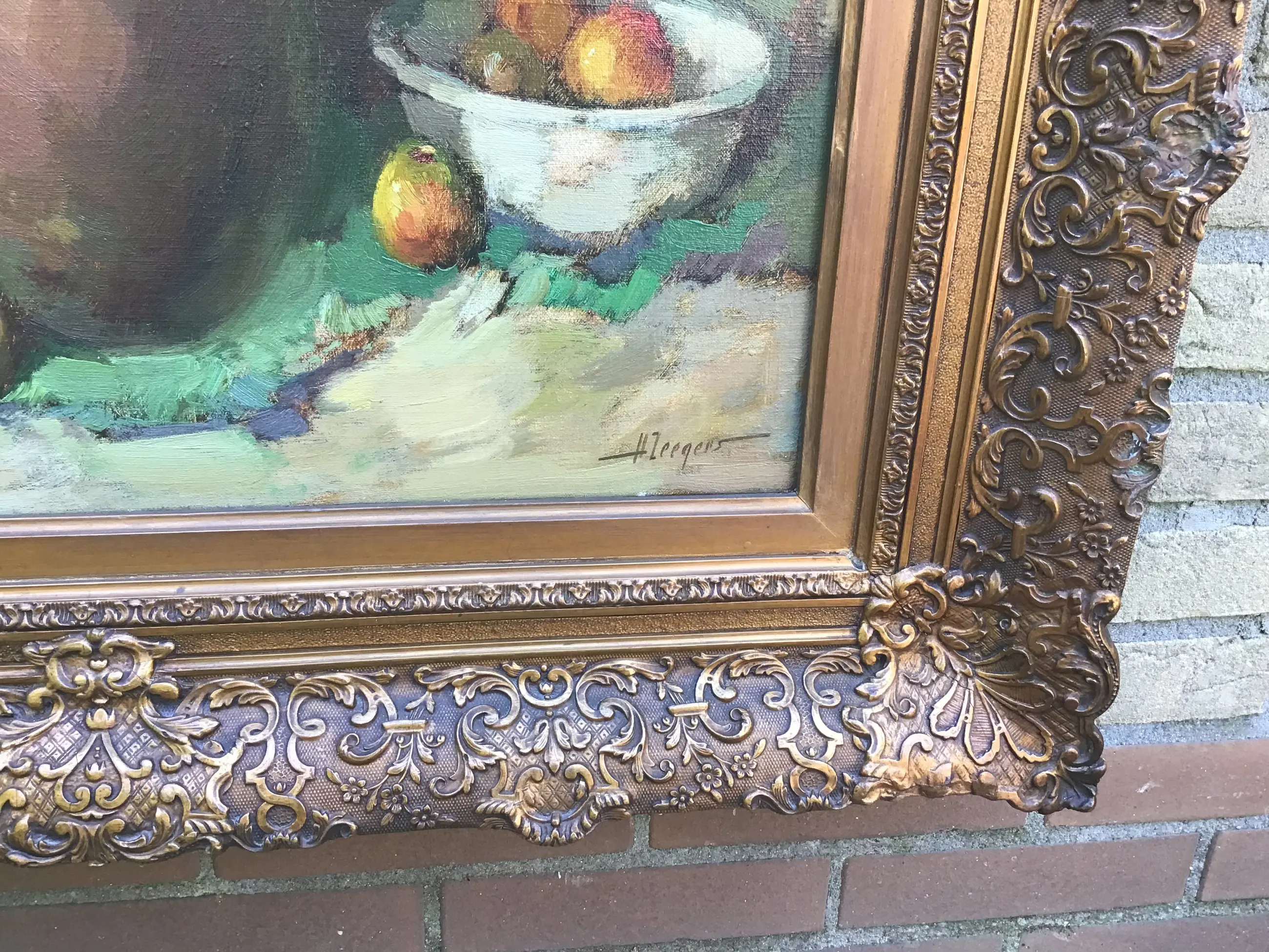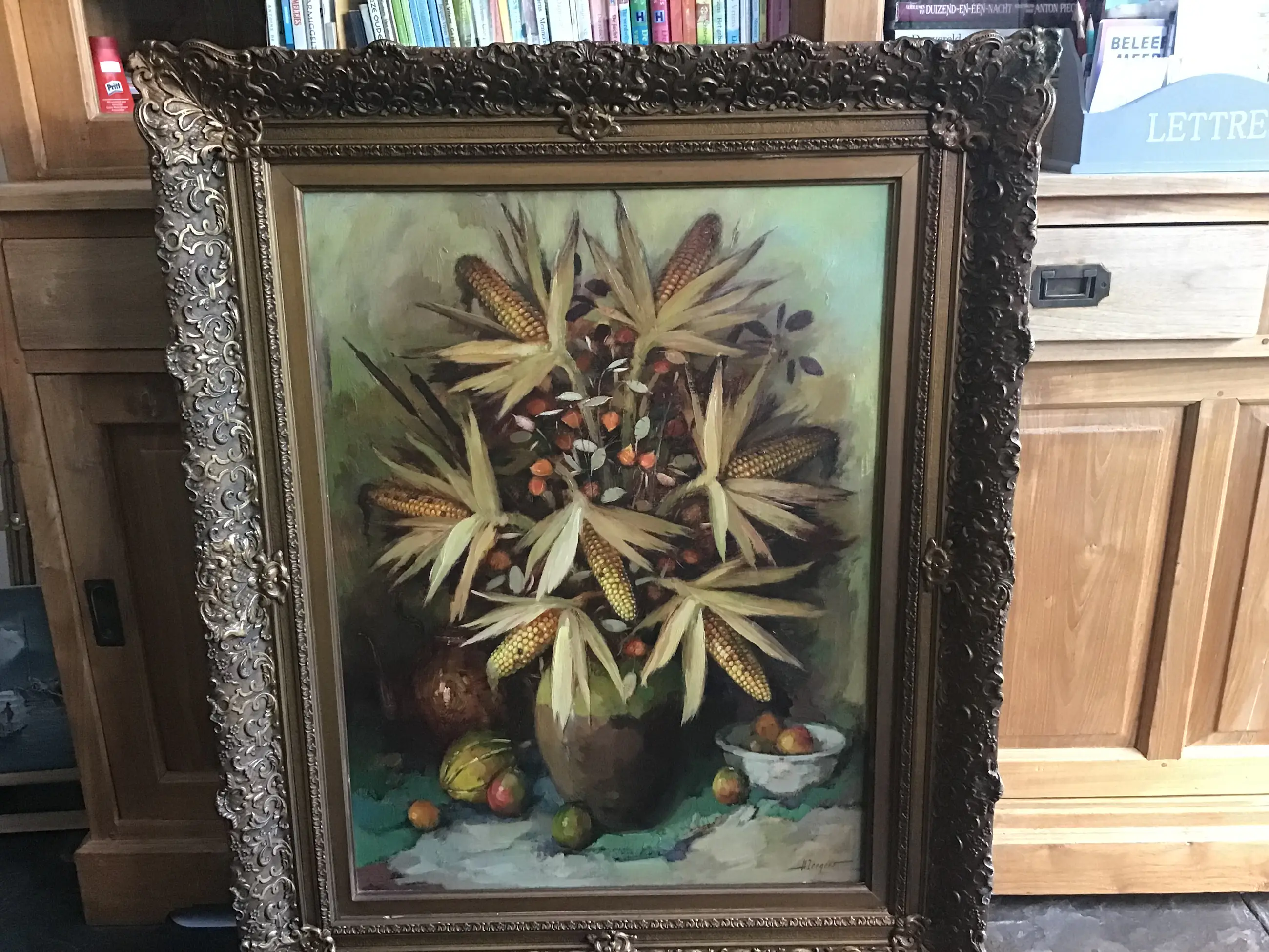 Indrukwekkend stilleven in zware indrukwekkende baroklijst van Harrie Zeegers(1929). Sfeervolle compositie in aardse tinten met een ondanks een reparatie nog steeds prachtige lijst.